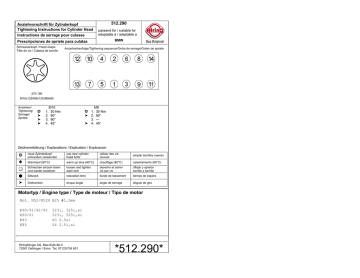 Anziehvorschrift für Zylinderkopf Tightening Instructions for Cylinder Head Instructions de serrage pour culasse 512.290 passend für / suitable for adaptable à / adaptable a BMW Prescripciones de apriete para culatas Schraubenkopf / Head shape Tête de vis / Cabeza de tornillo Anziehreihenfolge/Tightening sequence/Ordre de serrage/Orden de apriete 270.190 M10x125/M9x125/M9x95 Anziehen/ Tightening/ Serrage/ Apriete ❂ ➤ ➤ ➤ 1. 2. 3. 4. M10 30 Nm 90° 90° 45° M9 ❂ 1. 30 Nm ➤ 2. 90° 3. --- ➤ 4. 45° Zeichenerklärung / Explanations / Explication / Explicacion ❂ neue Zylinderkopfschrauben verwenden use new cylinder head bolts utiliser des vis neuves emplar tornillos nuevos ✱ Warmlauf (80°C) warm up time (80°C) chauffage (80°C) calentamiento (80°C) ❏ Schrauben einzeln lösen und wieder anziehen loosen and tighten each bolt deserrer et serrer vis par vis aflojar y apretar tornillo a tornillo ● Setzzeit relaxation time durée de tassement tiempo de espera ➤ Drehwinkel torque angle angle de serrage ángulo de giro Motortyp / Engine type / Type de moteur / Tipo de motor Mot. N52/N52N B25 ¿1,5mm E90/91/92/93 E60/61 E83 E85 323i, 325i,xi 523i, 525i,xi X3 2.5si Z4 2.5i,si ElringKlinger AG, Max-Eyth-Str.2 72581 Dettingen / Erms. Tel. 07123/724 601 *512.290*