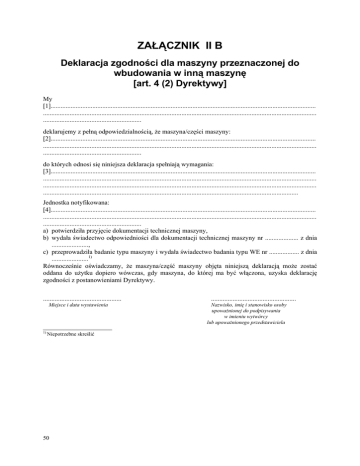 ZAàĄCZNIK II B Deklaracja zgodnoĞci dla maszyny przeznaczonej do wbudowania w inną maszynĊ [art. 4 (2) Dyrektywy] My [1]............................................................................................................................................................... .................................................................................................................................................................... ........................................................... deklarujemy z peáną odpowiedzialnoĞcią, Īe maszyna/czĊĞci maszyny: [2]............................................................................................................................................................... .................................................................................................................................................................... ........................................................... do których odnosi siĊ niniejsza deklaracja speániają wymagania: [3]............................................................................................................................................................... .................................................................................................................................................................... .................................................................................................................................................................... ......................................................................................................................................................... Jednostka notyfikowana: [4]............................................................................................................................................................... .................................................................................................................................................................... ........................................................... a) potwierdziáa przyjĊcie dokumentacji technicznej maszyny, b) wydaáa Ğwiadectwo odpowiednioĞci dla dokumentacji technicznej maszyny nr .................... z dnia ......................, c) przeprowadziáa badanie typu maszyny i wydaáa Ğwiadectwo badania typu WE nr .................. z dnia ......................1) RównoczeĞnie oĞwiadczamy, Īe maszyna/czĊĞü maszyny objĊta niniejszą deklaracją moĪe zostaü oddana do uĪytku dopiero wówczas, gdy maszyna, do której ma byü wáączona, uzyska deklaracjĊ zgodnoĞci z postanowieniami Dyrektywy. ............................................... Miejsce i data wystawienia 1) Niepotrzebne skreĞliü 50 ................................................... Nazwisko, imiĊ i stanowisko osoby upowaĪnionej do podpisywania w imieniu wytwórcy lub upowaĪnionego przedstawiciela