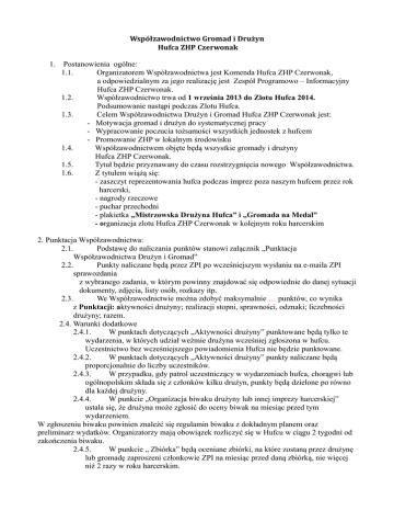 Współzawodnictwo Gromad i Drużyn Hufca ZHP Czerwonak 1. Postanowienia ogólne: 1.1. Organizatorem Współzawodnictwa jest Komenda Hufca ZHP Czerwonak, a odpowiedzialnym za jego realizację jest Zespół Programowo – Informacyjny Hufca ZHP Czerwonak. 1.2. Współzawodnictwo trwa od 1 września 2013 do Zlotu Hufca 2014. Podsumowanie nastąpi podczas Zlotu Hufca. 1.3. Celem Współzawodnictwa Drużyn i Gromad Hufca ZHP Czerwonak jest: - Motywacja gromad i drużyn do systematycznej pracy - Wypracowanie poczucia tożsamości wszystkich jednostek z hufcem - Promowanie ZHP w lokalnym środowisku 1.4. Współzawodnictwem objęte będą wszystkie gromady i drużyny Hufca ZHP Czerwonak. 1.5. Tytuł będzie przyznawany do czasu rozstrzygnięcia nowego Współzawodnictwa. 1.6. Z tytułem wiążą się: - zaszczyt reprezentowania hufca podczas imprez poza naszym hufcem przez rok harcerski, - nagrody rzeczowe - puchar przechodni - plakietka „Mistrzowska Drużyna Hufca” i „Gromada na Medal” - organizacja zlotu Hufca ZHP Czerwonak w kolejnym roku harcerskim 2. Punktacja Współzawodnictwa: 2.1. Podstawę do naliczania punktów stanowi załącznik „Punktacja Współzawodnictwa Drużyn i Gromad” 2.2. Punkty naliczane będą przez ZPI po wcześniejszym wysłaniu na e-maila ZPI sprawozdania z wybranego zadania, w którym powinny znajdować się odpowiednie do danej sytuacji dokumenty, zdjęcia, listy osób, rozkazy itp. 2.3. We Współzawodnictwie można zdobyć maksymalnie … punktów, co wynika z Punktacji: aktywności drużyny; realizacji stopni, sprawności, odznaki; liczebności drużyny; razem. 2.4. Warunki dodatkowe 2.4.1. W punktach dotyczących „Aktywności drużyny” punktowane będą tylko te wydarzenia, w których udział weźmie drużyna wcześniej zgłoszona w hufcu. Uczestnictwo bez wcześniejszego powiadomienia Hufca nie będzie punktowane. 2.4.2. W punktach dotyczących „Aktywności drużyny” punkty naliczane będą proporcjonalnie do liczby uczestników. 2.4.3. W przypadku, gdy patrol uczestniczący w wydarzeniach hufca, chorągwi lub ogólnopolskim składa się z członków kilku drużyn, punkty będą dzielone po równo dla każdej drużyny. 2.4.4. W punkcie „Organizacja biwaku drużyny lub innej imprezy harcerskiej” ustala się, że drużyna może zgłosić do oceny biwak na miesiąc przed tym wydarzeniem. W zgłoszeniu biwaku powinien znaleźć się regulamin biwaku z dokładnym planem oraz preliminarz wydatków. Organizatorzy mają obowiązek rozliczyć się w Hufcu w ciągu 2 tygodni od zakończenia biwaku. 2.4.5. W punkcie „ Zbiórka” będą oceniane zbiórki, na które zostaną przez drużynę lub gromadę zaproszeni członkowie ZPI na miesiąc przed daną zbiórką, nie więcej niż 2 razy w roku harcerskim. 2.4.6. W punkcie „Składki” będzie oceniana terminowość wpłat składek członkowskich. 2.4.7. W punkcie „Liczebność drużyn” będzie oceniana liczebność drużyny 12-16; 16-20; 20-24; 24 i więcej. 3. Jury konkursu 3.1. Jury konkursu to Zespół Programowo – Informacyjny Hufca ZHP Czerwonak. 3.2.Juror nie będzie brał udziału w ocenie własnego środowiska. 4. Podsumowanie 4.1. Fundamentalnym założeniem Współzawodnictwa jest uczciwość osób biorących niej udział. „Na słowie harcerza polegaj jak na Zawiszy” PUNKTACJA WSPÓŁZAWODNICTWA DRUŻYN I GROMAD Aktywność drużyny : • Udział w imprezach hufcowych • Udział w imprezach chorągwianych • Udział w ogólnopolskich • Organizacja akcje zarobkowych • Udział w grupach kwatermistrzowskich i pracach remontowych • Udział drużynowych w zbiórkach drużynowych • Udział drużyny w świętach państwowych • Organizacja biwaku lub innej imprezy • Współorganizacja inicjatywy na rzecz środowiska lokalnego • Udział w obozach Oceniane przez ZPI na podstawie sprawozdania wysłanego na maila ZIP. Ocena proporcjonalna do liczby osób uczestniczących. Stopnie, sprawności … • Obietnica Zuchowa, Przyrzeczenie harcerskie • Gwiazdki zuchowe • Cykle sprawnościowe • Sprawności indywidualne • Stopnie harcerskie • Zadania zespołowe • Sprawności harcerskie • Naramiennik wędrowniczy • Znaki służb • Odznaka chorągwiana • Inne Odznaki Oceniane przez zespół programowo-informacyjny na podstawie rozkazów przesłanych przez drużynę na maila ZPI. Drużyna • Plan pracy (przesłany do końca września) • Liczba osób w drużynie: ilość szóstek, zastępów • Składki (płacone kwartalnie) oceniane pod koniec każdego kwartału • Systematyczne uzupełnianie ewidencji • • • • • • Umundurowanie Obrzędowość w drużynach i gromadach – totem gromady, proporce drużyny, zastępów, itp. Udział członków drużyn w szkoleniach i kursach, podnoszenie kwalifikacji przez drużynowego Aktywność na stronie internetowej hufca Kronika, strona internetowa Zbiórka – ocenia zaproszony przez drużynę członek ZPI Ocena ZPI przez wizytę, sprawozdanie mailowe. Ocenie podlegają – występowanie stałych elementów zbiórki – wykorzystanie elementów obrzędowości – dobór form pracy do tematu zbiórki