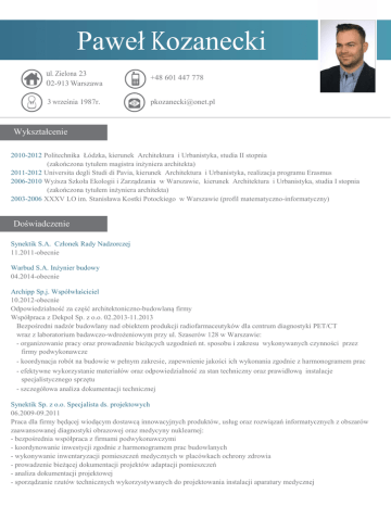 Paweł Kozanecki ul. Zielona 23 02-913 Warszawa +48 601 447 778 3 września 1987r. [email protected] Wykształcenie 2010-2012 Politechnika Łódzka, kierunek Architektura i Urbanistyka, studia II stopnia (zakończona tytułem magistra inżyniera architekta) 2011-2012 Universita degli Studi di Pavia, kierunek Architektura i Urbanistyka, realizacja programu Erasmus 2006-2010 Wyższa Szkoła Ekologii i Zarządzania w Warszawie, kierunek Architektura i Urbanistyka, studia I stopnia (zakończona tytułem inżyniera architekta) 2003-2006 XXXV LO im. Stanisława Kostki Potockiego w Warszawie (profil matematyczno-informatyczny) Doświadczenie Synektik S.A. Członek Rady Nadzorczej 11.2011-obecnie Warbud S.A. Inżynier budowy 04.2014-obecnie Archipp Sp.j. Współwłaściciel 10.2012-obecnie Odpowiedzialność za część architektoniczno-budowlaną firmy Współpraca z Dekpol Sp. z o.o. 02.2013-11.2013 Bezpośredni nadzór budowlany nad obiektem produkcji radiofarmaceutyków dla centrum diagnostyki PET/CT wraz z laboratorium badawczo-wdrożeniowym przy ul. Szaserów 128 w Warszawie: - organizowanie pracy oraz prowadzenie bieżących uzgodnień nt. sposobu i zakresu wykonywanych czynności przez firmy podwykonawcze - koordynacja robót na budowie w pełnym zakresie, zapewnienie jakości ich wykonania zgodnie z harmonogramem prac - efektywne wykorzystanie materiałów oraz odpowiedzialność za stan techniczny oraz prawidłową instalacje specjalistycznego sprzętu - szczegółowa analiza dokumentacji technicznej Synektik Sp. z o.o. Specjalista ds. projektowych 06.2009-09.2011 Praca dla firmy będącej wiodącym dostawcą innowacyjnych produktów, usług oraz rozwiązań informatycznych z obszarów zaawansowanej diagnostyki obrazowej oraz medycyny nuklearnej: - bezpośrednia współpraca z firmami podwykonawczymi - koordynowanie inwestycji zgodnie z harmonogramem prac budowlanych - wykonywanie inwentaryzacji pomieszczeń medycznych w placówkach ochrony zdrowia - prowadzenie bieżącej dokumentacji projektów adaptacji pomieszczeń - analiza dokumentacji projektowej - sporządzanie rzutów technicznych wykorzystywanych do projektowania instalacji aparatury medycznej
