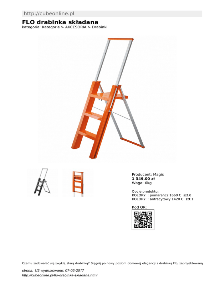 http://cubeonline.pl FLO drabinka składana kategoria: Kategorie > AKCESORIA > Drabinki Producent: Magis 1 349,00 zł Waga: 6kg Opcje produktu: KOLORY: : pomarańcz 1660 C szt.0 KOLORY: : antracytowy 1420 C szt.1 Kod QR: Czemu zadowalać się zwykłą starą drabinką? Sięgnij po nowy poziom domowej elegancji z drabinką Flo, zaprojektowaną strona: 1/2 wydrukowano: 07-03-2017 http://cubeonline.pl/flo-drabinka-skladana.html przez Marcello Ziliani. Drabina musi być wytrzymała, kompaktowa i zawsze na oku. Flo taka jest, zapewnia stabilną pozycję na stopniach, jest łatwa w obsłudze i łatwa do przechowywania, i wszystko w ładnym opakowaniu. Otwieranie i zamykanie Flo odbywa się poprzez pociągniecie dźwigni bez pieczeństwa (nie jest to łatwe dla dzieci). Bardzo lekka i wytrzymała konstrukcja tego małego pomocnika doskonale nadaje się do osiągnięcia najwyższej półki w kuchni lub wymiany żarówki przy suficie. Wykonany z anodyzowanego aluminium i tworzywa ABS w intensywnych kolorach. Posiada Certyfikat TUV. WYMIARY (cm): wysokość calkowita: 140 szerokość: 50 głębokość: 75 MATERIAŁ: aluminium anodowane, tworzywo ABS INNE: kolory: pomarańcz, antracytowy Inne produkty Magis: http://www.cubeonline.pl/manufacturer/magis Inne produkty projektanta: http://www.cubeonline.pl/designer/ziliani-marcello strona: 2/2 wydrukowano: 07-03-2017 http://cubeonline.pl/flo-drabinka-skladana.html