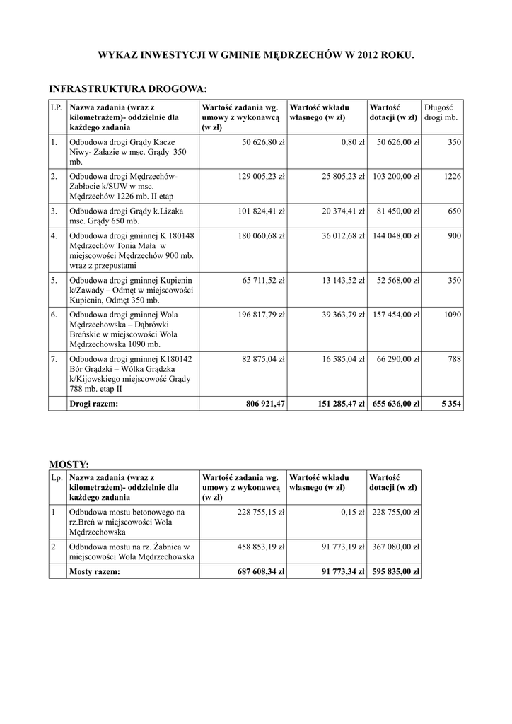 WYKAZ INWESTYCJI W GMINIE MĘDRZECHÓW W 2012 ROKU