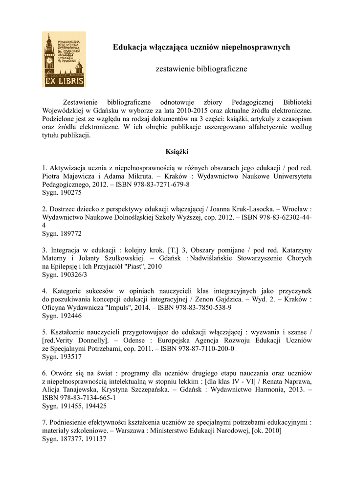 Edukacja włączająca uczniów niepełnosprawnych zestawienie bibliograficzne Zestawienie bibliograficzne odnotowuje zbiory Pedagogicznej Biblioteki Wojewódzkiej w Gdańsku w wyborze za lata 2010-2015 oraz aktualne źródła elektroniczne. Podzielone jest ze względu na rodzaj dokumentów na 3 części: książki, artykuły z czasopism oraz źródła elektroniczne. W ich obrębie publikacje uszeregowano alfabetycznie według tytułu publikacji. Książki 1. Aktywizacja ucznia z niepełnosprawnością w różnych obszarach jego edukacji / pod red. Piotra Majewicza i Adama Mikruta. – Kraków : Wydawnictwo Naukowe Uniwersytetu Pedagogicznego, 2012. – ISBN 978-83-7271-679-8 Sygn. 190275 2. Dostrzec dziecko z perspektywy edukacji włączającej / Joanna Kruk-Lasocka. – Wrocław : Wydawnictwo Naukowe Dolnośląskiej Szkoły Wyższej, cop. 2012. – ISBN 978-83-62302-444 Sygn. 189772 3. Integracja w edukacji : kolejny krok. [T.] 3, Obszary pomijane / pod red. Katarzyny Materny i Jolanty Szulkowskiej. – Gdańsk : Nadwiślańskie Stowarzyszenie Chorych na Epilepsję i Ich Przyjaciół "Piast", 2010 Sygn. 190326/3 4. Kategorie sukcesów w opiniach nauczycieli klas integracyjnych jako przyczynek do poszukiwania koncepcji edukacji integracyjnej / Zenon Gajdzica. – Wyd. 2. – Kraków : Oficyna Wydawnicza "Impuls", 2014. – ISBN 978-83-7850-538-9 Sygn. 192446 5. Kształcenie nauczycieli przygotowujące do edukacji włączającej : wyzwania i szanse / [red.Verity Donnelly]. – Odense : Europejska Agencja Rozwoju Edukacji Uczniów ze Specjalnymi Potrzebami, cop. 2011. – ISBN 978-87-7110-200-0 Sygn. 193517 6. Otwórz się na świat : programy dla uczniów drugiego etapu nauczania oraz uczniów z niepełnosprawnością intelektualną w stopniu lekkim : [dla klas IV - VI] / Renata Naprawa, Alicja Tanajewska, Krystyna Szczepańska. – Gdańsk : Wydawnictwo Harmonia, 2013. – ISBN 978-83-7134-665-1 Sygn. 191455, 194425 7. Podniesienie efektywności kształcenia uczniów ze specjalnymi potrzebami edukacyjnymi : materiały szkoleniowe. – Warszawa : Ministerstwo Edukacji Narodowej, [ok. 2010] Sygn. 187377, 191137 8. Podniesienie efektywności kształcenia uczniów ze specjalnymi potrzebami edukacyjnymi : materiały szkoleniowe. Cz. 1. – Warszawa : Ministerstwo Edukacji Narodowej, 2010 Sygn. 187380/1 9. Podniesienie efektywności kształcenia uczniów ze specjalnymi potrzebami edukacyjnymi : materiały szkoleniowe. Cz. 2. – Warszawa : Ministerstwo Edukacji Narodowej, 2010 Sygn. 187380/2 10. Pomóż dzieciom zrozumieć świat : programy dla uczniów edukacji wczesnoszkolnej oraz uczniów z niepełnosprawnością intelektualną w stopniu lekkim : [dla klas I-III] / Renata Naprawa, Alicja Tanajewska, Ewa Korzeniowska. – Gdańsk : Wydawnictwo Harmonia, 2012. – ISBN 978-83-7134-584-5 Sygn. 189864, 191071 11. Praca z uczniem o specjalnych potrzebach edukacyjnych. T. 1 / pod red. nauk. Anny Guzy i Danuty Krzyżyk. – Kielce : Wydawnictwo Pedagogiczne ZNP, cop. 2012. – ISBN 978-837173-271-3 Sygn. 194624/1 12. Praca z uczniem o specjalnych potrzebach edukacyjnych. T. 2 / pod red. nauk. Anny Guzy oraz Bernadety Niesporek-Szamburskiej. – Kielce : Wydawnictwo Pedagogiczne ZNP, cop. 2013. – ISBN 978-83-7173-289-8 Sygn. 194624/2 13. Prawo do edukacji dzieci o specjalnych potrzebach edukacyjnych : raport z monitoringu / [oprac. Jacek Ciechanowski i in.]. – Warszawa : Helsińska Fundacja Praw Człowieka, 2010. – ISBN 978-83-62245-10-9 Sygn. 191144 14. Relacje dziecka z wadą słuchu w szkole / Aneta Jegier, Magdalena Kosowska. – Warszawa : Difin, 2011. – 978-83-7641-381-5 Sygn. 187026 15. Sytuacje trudne w opinii nauczycieli klas integracyjnych / Zenon Gajdzica. – Wyd. 2. – Kraków : Oficyna Wydawnicza "Impuls", 2011. – ISBN 978-83-7587-860-8 Sygn. 188813 16. Teoria i praktyka kształcenia integracyjnego w Polsce w latach 1989-2012 / Danuta Apanel. – Toruń : Wydawnictwo Adam Marszałek, 2014. – ISBN 978-83-7780-804-7 Sygn. 194631 17. Uczeń z wadą słuchu w szkole ogólnodostępnej : podstawy metodyki nauczania języków obcych / Ewa Domagała-Zysk, Katarzyna Karpińska-Szaj. – Kraków : Oficyna Wydawnicza "Impuls", 2011. – ISBN 978-83-7587-631-4 Sygn. 187905 18. Uwarunkowania związane z przenoszeniem uczniów niepełnosprawnych ze szkół integracyjnych do specjalnych / Barbara Grzyb. – Kraków : Oficyna Wydawnicza "Impuls", 2013. – ISBN 978-83-7850-401-6 Sygn. 191333 19. Zmiany stosunków między dziećmi pełnosprawnymi i dziećmi z niepełnosprawnością w klasach integracyjnych / Jolanta Lipińska-Lokś. – Zielona Góra : Oficyna Wydawnicza Uniwersytetu Zielonogórskiego, 2011. – ISBN 978-83-7481-413-3 Sygn. 188446 Artykuły z czasopism 1. Akceptacja uczniów niepełnosprawnych w klasach integracyjnych / Paulina Milońska // Wychowawca. – 2015, nr 3, s. 8-9. – ISSN 1230-3720 Sygn. 09200 2. Co nowego w edukacji włączającej? / Anna Firkowska-Mankiewicz // Edukacja. – 2010, nr 2, s. 16-23. – ISSN 0137-1258 Sygn. 02634 3. Dostosowanie warunków na egzaminie dla uczniów ze SPE. Cz.2 / Ewa Norkowska // Głos Pedagogiczny. – 2013, nr 48, s. 41-45. – ISSN 1899-6760 Sygn. 015928 4. Dlaczego edukacja włączająca nie zawsze jest najlepszym rozwiązaniem? : doświadczenia i plany edukacyjne wobec dzieci z zespołem Downa w relacjach matek / Katarzyna Ćwirynkało, Agnieszka Żyta // Szkoła Specjalna. – 2014, nr 3, s. 186-201. – ISSN 0137-818X Sygn. 0442 5. Dylematy edukacji włączającej / Iwona Olszówka // Głos Nauczycielski. – 2013, nr 16, s. 13. – ISSN 0017-1263 Sygn. 048 6. Edukacja dzieci z niepełnosprawnościami / Małgorzata Stańczyk // Dyrektor Szkoły. – 2015, nr 1, s. 13 14. – ISSN 1230-9508 Sygn. 09151 7. Edukacja włączająca / Mariusz Grabowski // Wychowawca. – 2015, nr 3, s. 10-11. – ISSN 1230-3720 Sygn. 09200 8. Edukacja włączająca : nowe wyzwania / Grażyna Małachowska // Bliżej Przedszkola. – 2010, nr 3