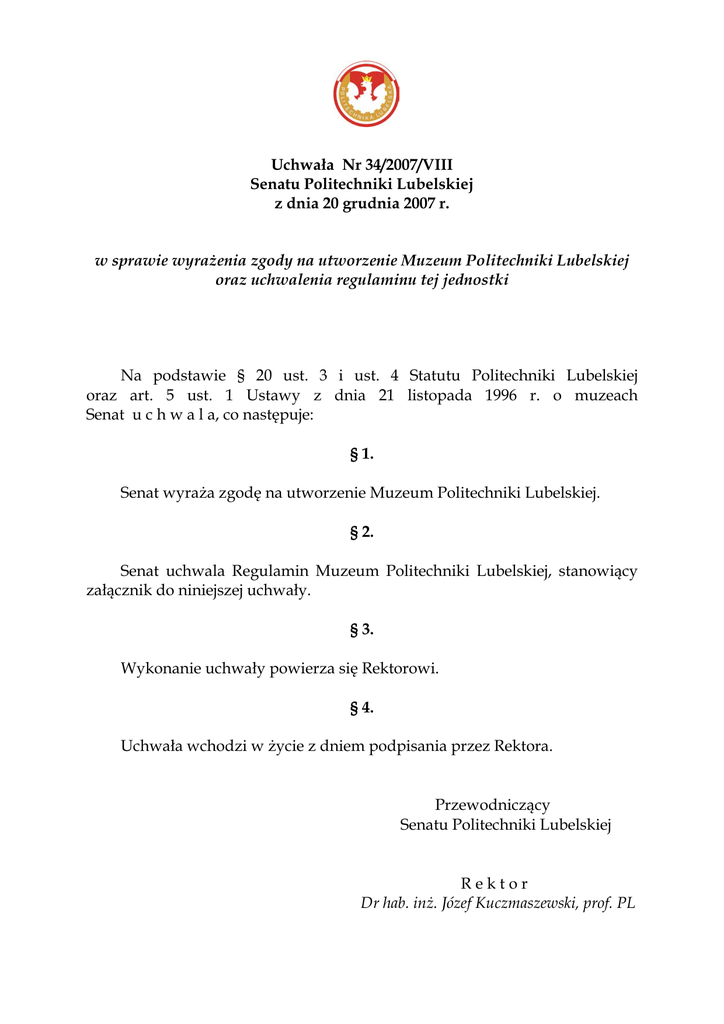 Uchwała Nr 34/2007/VIII Senatu Politechniki Lubelskiej z dnia 20