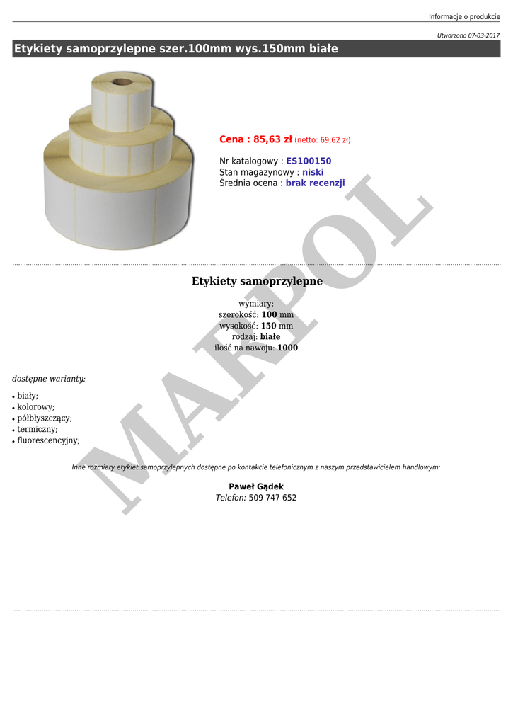 Informacje o produkcie Utworzono 07-03-2017 Etykiety samoprzylepne szer.100mm wys.150mm białe Cena : 85,63 zł (netto: 69,62 zł) PO L Nr katalogowy : ES100150 Stan magazynowy : niski Średnia ocena : brak recenzji Etykiety samoprzylepne dostępne warianty: ● ● ● ● biały; kolorowy; półbłyszczący; termiczny; fluorescencyjny; M ● AR wymiary: szerokość: 100 mm wysokość: 150 mm rodzaj: białe ilość na nawoju: 1000 Inne rozmiary etykiet samoprzylepnych dostępne po kontakcie telefonicznym z naszym przedstawicielem handlowym: Paweł Gądek Telefon: 509 747 652