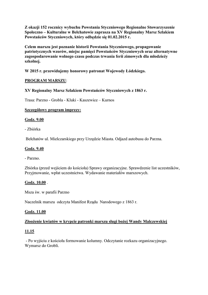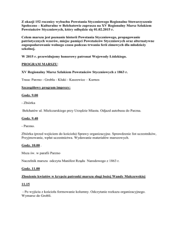 Z okazji 152 rocznicy wybuchu Powstania Styczniowego Regionalne Stowarzyszenie Społeczno – Kulturalne w Bełchatowie zaprasza na XV Regionalny Marsz Szlakiem Powstańców Styczniowych, który odbędzie się 01.02.2015 r. Celem marszu jest poznanie historii Powstania Styczniowego, propagowanie patriotycznych wzorów, miejsc pamięci Powstańców Styczniowych oraz alternatywne zagospodarowanie wolnego czasu podczas trwania ferii zimowych dla młodzieŜy szkolnej. W 2015 r. przewidujemy honorowy patronat Wojewody Łódzkiego. PROGRAM MARSZU: XV Regionalny Marsz Szlakiem Powstańców Styczniowych z 1863 r. Trasa: Parzno - Grobla - Kluki - Kaszewice – Kurnos Szczegółowy program imprezy: Godz. 9.00 - Zbiórka Bełchatów ul. Mielczarskiego przy Urzędzie Miasta. Odjazd autobusu do Parzna. Godz. 9.40 - Parzno. Zbiórka (przed wejściem do kościoła) Sprawy organizacyjne. Sprawdzenie list uczestników, Przyjmowanie, wpłat uczestnictwa. Wydawanie materiałów marszowych. Godz. 10.00 . Msza św. w parafii Parzno Naczelnik marszu odczyta Manifest Rządu Narodowego z 1863 r. Godz. 11.00 ZłooŜenie kwiatów w krypcie patronki marszu sługi boŜej Wandy Malczewskiej 11.15 - Po wyjściu z kościoła formowanie kolumny. Odczytanie rozkazu organizacyjnego. Wymarsz do Grobli. Godz. 12.00 – 12.30 Grobla (postój, ciepły posiłek) Godz. 14.00 Kaszewice. ZłoŜenie wiązanki na grobie powstańca. Gorąca kawa, herbata oraz słodki poczęstunek w OSP w Kaszewicach. Godz. 15.30 - Kurnos I, Sala OSP. Powitanie uczestników marszu przez wójta Gminy Bełchatów oraz zaproszonych gości. Naczelnik marszu odczyta rozkaz organizacyjny nr 2 o zakończeniu marszu. Program artystyczny na temat powstania styczniowego w wykonaniu dzieci z Gminnego Centrum Kultury. Wręczenie odznak dla uczestników za udział w 3. 5. i 10. Kolejnym marszu. Rozstrzygnięcie konkursu i wręczenie nagród za najlepszy strój i rekwizyt z epoki powstania. Gorący posiłek. Przewidywane zakończenie - 18.00 Informacje Dodatkowe KaŜdy uczestnik po zakończeniu marszu otrzymuje potwierdzenie udziału i zaliczenia trasy marszu. Po trzech i pięciu i kolejno zaliczonych marszach kaŜdemu uczestnikowi przysługuje brązowa i srebrna odznaka (stylizowana na znakach powstańczych) oraz ksiąŜeczka, gdzie będą potwierdzone marsze. Po 10 marszach kaŜdy uczestnik otrzymuje złotą odznakę. Ogłoszony został równieŜ konkurs na strój i rekwizyt powstańczy. Najlepsze pomysły zostaną nagrodzone. Regulamin Marszu 1. W marszu moŜe brać udział młodzieŜ niepełnoletnia pod opieką osób dorosłych – wychowawców, osoby dorosłe oraz całe rodziny. 2. KaŜdy uczestnik marszu wpłaca wpisowe w wysokości 5 złotych, grupy zorganizowane wpłacają zbiorowo wraz z listą uczestników. Osoby indywidualne - bezpośrednio do organizatorów przed wymarszem (znaczek, regulamin, posiłki). 3. Zgłoszenia zbiorowe przyjmowane są wyłącznie drogą elektronicznią adres [email protected]., nie później niŜ do 25.01.2015r. 4. Przy zgłoszeniach dzieci i młodzieŜy szkolnej naleŜy wskazać opiekuna grupy (maksymalnie 15 osób na 1-go opiekuna). 5. KaŜdy opiekun grupy zorganizowanej posiadać musi kamizelkę odblaskową. 6. O przyjęciu na listę marszu decyduję Organizator. 7. W miejscu wymarszu (Parzno) Komenda Marszu wyznacza ilość grup i ich dowódców. 8. W czasie marszu obowiązuje dyscyplina i podporządkowanie się rozkazom przełoŜonych. 9. Na całej trasie marszu i na postojach obowiązuje całkowity zakaz spoŜywania alkoholu. 10. Niepodporządkowanie się regulaminowi skutkuje natychmiastowym usunięciem z marszu. Tel. Kontaktowy:, 727 914 663 U. Komońska