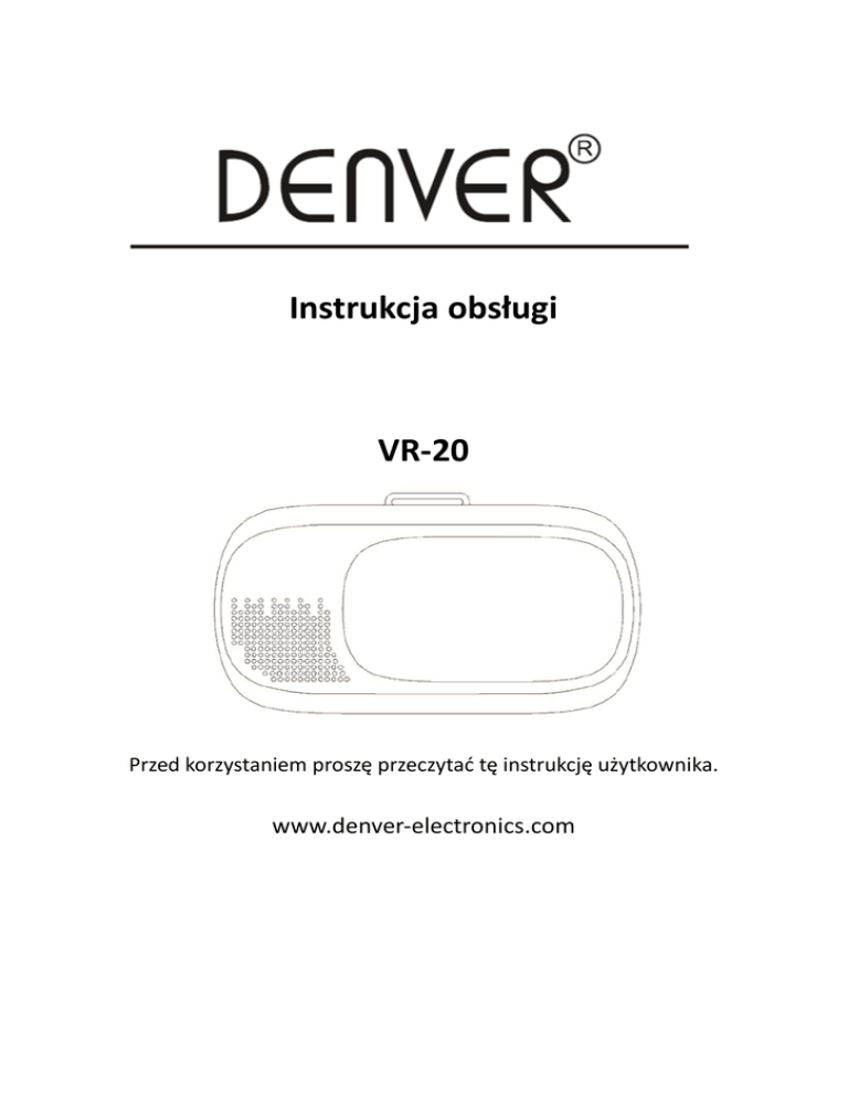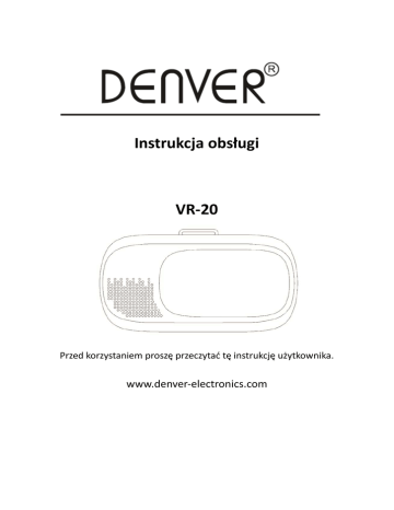 Instrukcja obsługi VR-20 Przed korzystaniem proszę przeczytać tę instrukcję użytkownika. www.denver-electronics.com ZASADY BEZPIECZEŃSTWA I OSTRZEŻENIA DOTYCZĄCE ZDROWIA: ABY ZMNIEJSZYĆ ZAGROŻENIE USZKODZENIA CIAŁA LUB NIEDOGODNOŚCI, NALEŻY UPEWNIĆ SIĘ, ŻE WSZYSCY UŻYTKOWNICY URZĄDZENIA DENVER VR-20 PRZED ROZPOCZĘCIEM KORZYSTANIA Z NIEGO UWAŻNIE PRZECZYTALI PONIŻSZE INSTRUKCJE. Przed rozpoczęciem korzystania z urządzenia DENVER VR-20: Przeczytaj i postępuj zgodnie ze wszystkimi instrukcjami montażu i obsługi opisanymi w instrukcji użytkownika urządzenia DENVER VR-20. Nie należy korzystać z urządzenia DENVER VR-20, jeśli użytkownik jest zmęczony lub zestresowany, gdyż może to zwiększyć prawdopodobieństwo nieszczęśliwych wypadków. Jeśli użytkownik jest w ciąży, w wieku zaawansowanym, ma istniejące nieprawidłowości widzenia w obu oczach, cierpi na choroby psychiczne lub ma problemy z sercem czy inne poważne schorzenia medyczne, to przed użyciem DENVER VR-20 powinien skonsultować się z lekarzem. Napady: Niektóre osoby mogą cierpieć na zawroty głowy, napady, napady padaczkowe lub utratę przytomności spowodowane miganiem światła lub wzorami. Objawy te mogą wystąpić podczas oglądania TV, gry w gry wideo lub podczas korzystania z okularów rzeczywistości wirtualnej VR, nawet jeśli nigdy przedtem nie wystąpiły. Napady takie są typowe u dzieci i osób młodych poniżej 20 roku życia. Każdy, kto w przeszłości miał napad, stracił przytomność lub wystąpił inny symptom związany z epilepsją, powinien przed korzystaniem z urządzenia DENVER VR-20 skonsultować się z lekarzem. Dzieci: Urządzenie DENVER VR-20 nie powinno być używane przez dzieci poniżej 13 roku życia, gdyż jest to ważny okres w rozwoju wzroku dziecka. Dorośli powinni ściśle nadzorować dzieci (od lat 13), które korzystają lub korzystały z urządzenia DENVER VR-20 w celu upewniania się, że żadne z wymienionych powyżej symptomów nie wystąpiły oraz powinni kontrolować czas, jaki dzieci (powyżej 13 lat) spędzają, upewniając się, że młodzi użytkownicy robią przerwy. Należy unikać zbyt długiego korzystania, gdyż mogłoby ono negatywnie wpłynąć na koordynację wzrokowo-ruchową, równowagę i zdolności równoczesnego wykonywania wielu czynności. Zagrożenie uduszeniem: Nie należy pozwolić, by dzieci poniżej 3 roku życia bawiły się urządzeniem DENVER VR-20, gdyż mogą udusić się paskami do mocowania na głowie. Ogólne środki ostrożności: Z urządzenia DENVER VR-20 należy korzystać wyłącznie w bezpiecznym otoczeniu. Przed rozpoczęciem korzystania należy mieć na uwadze otoczenie. Korzystanie z urządzenia DENVER VR-20 może spowodować utratę równowagi. Dla bezpieczeństwa podczas korzystania należy siedzieć. Nigdy nie należy korzystać z urządzenia DENVER VR-20 w jadącym pojeździe jak samochód, autobus lub pociąg, gdyż może to zwiększyć podatność na niepożądane skutki. Co 30 minut należy robić przynajmniej 10 lub 15 minutowe przerwy, nawet jeśli użytkownikowi wydaje się, że nie są konieczne. POL-1 Gumowe nakładki: W celu zapobieżenia naciskaniu przycisków telefonu w zestawie znajdują się 3 sztuki gumowych nakładek. Należy nakleić gumowe nakładki na kieszeń na telefon zgodnie z umieszczeniem przycisków na telefonie. Patrz niżej. Gumowa nakładka Przyciski telefonu Funkcje: 1. Reguluje odległość do soczewek. Zmiana następuje po naciśnięciu do przodu lub do tyłu. 2. Należy dostosować soczewki tak, by były wyrównane ze źrenicami. Zmiana następuje po naciśnięciu w lewo lub prawo. 3. Wejście na słuchawki z lewej strony. 4. Przód może być otwarty, by umożliwić korzystanie z kamery telefonu. POL-2 Przesuwany panel: 1. Wyjmij uchwyt, włóż telefon w uchwyt i wsuń z powrotem. 2. Tutaj można włożyć kabel od słuchawek. Korzystanie z okularów rzeczywistości wirtualnej VR: 1. Przed włożeniem telefonu do komory na telefon upewnij się, że aplikacja lub film są w trybie podzielonego obrazu. 2. Otwórz uchwyt na telefon z prawej strony okularów rzeczywistości wirtualnej VR i włóż telefon. 3. Upewnij się, że telefon jest pośrodku uchwytu. POL-3 4. Jeśli aplikacja rzeczywistości wirtualnej i Twój telefon obsługują regulację grawitacji, to możesz kontrolować kąt oglądania, przechylając głowę. Programy rzeczywistości wirtualnej dla telefonów. Wyszukaj „VR” w sklepach iOS APP lub Google Play albo na YouTube. Należy pamiętać, że nie wszystkie programy rzeczywistości wirtualnej będą działać na Twoim telefonie i z okularami rzeczywistości wirtualnej VR. POL-4 WSZYSTKIE PRAWA ZASTRZEŻONE, PRAWA AUTORSKIE DENVER ELECTRONICS A/S Sprzęt elektryczny i elektroniczny zawiera materiały, elementy oraz substancje, które mogą być niebezpieczne dla zdrowia i środowiska, jeśli materiał odpadowy (wyrzucony sprzęt elektryczny, elektroniczny) nie są właściwie potraktowane. Sprzęt elektryczny i elektroniczny i baterie oznaczone są przekreślonym symbolem śmietnika, patrz wyżej. Ten symbol oznacza, że sprzęt elektryczny i elektroniczny nie powinien być wyrzucany z innymi odpadami domowymi, ale powinien być usuwany oddzielnie. Wszystkie miasta mają ustalone miejsca zbiórki sprzętu elektrycznego i elektronicznego, gdzie można go bezpłatnie oddać w stacjach recyklingu i innych miejscach zbiórki lub zlecić jego odbiór z gospodarstw domowych. Dodatkowe informacje znajdują się w wydziale technicznym urzędu miasta. Importer: DENVER ELECTRONICS A/S Stavneagervej 22 DK-8250 Egaa Dania www.facebook.com/denverelectronics POL-5