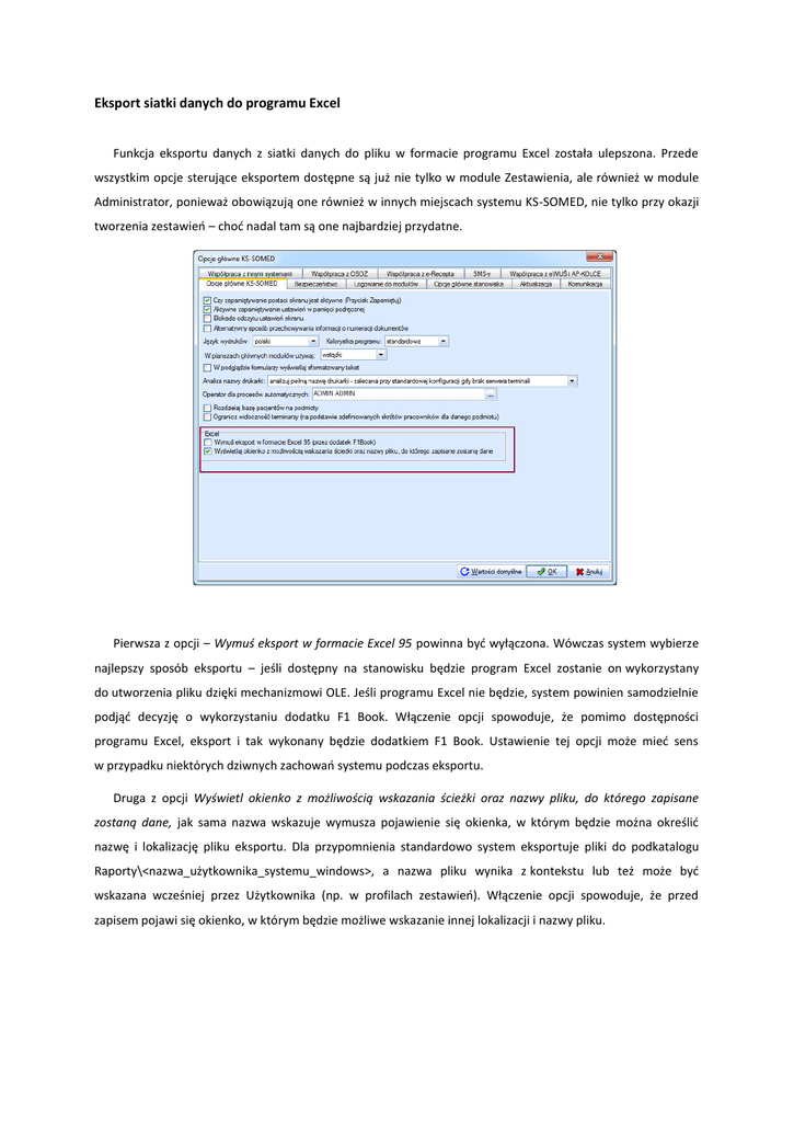 Eksport siatki danych do programu Excel Funkcja eksportu danych z siatki danych do pliku w formacie programu Excel została ulepszona. Przede wszystkim opcje sterujące eksportem dostępne są już nie tylko w module Zestawienia, ale również w module Administrator, ponieważ obowiązują one również w innych miejscach systemu KS-SOMED, nie tylko przy okazji tworzenia zestawień – choć nadal tam są one najbardziej przydatne. Pierwsza z opcji – Wymuś eksport w formacie Excel 95 powinna być wyłączona. Wówczas system wybierze najlepszy sposób eksportu – jeśli dostępny na stanowisku będzie program Excel zostanie on wykorzystany do utworzenia pliku dzięki mechanizmowi OLE. Jeśli programu Excel nie będzie, system powinien samodzielnie podjąć decyzję o wykorzystaniu dodatku F1 Book. Włączenie opcji spowoduje, że pomimo dostępności programu Excel, eksport i tak wykonany będzie dodatkiem F1 Book. Ustawienie tej opcji może mieć sens w przypadku niektórych dziwnych zachowań systemu podczas eksportu. Druga z opcji Wyświetl okienko z możliwością wskazania ścieżki oraz nazwy pliku, do którego zapisane zostaną dane, jak sama nazwa wskazuje wymusza pojawienie się okienka, w którym będzie można określić nazwę i lokalizację pliku eksportu. Dla przypomnienia standardowo system eksportuje pliki do podkatalogu Raporty\<nazwa_użytkownika_systemu_windows>, a nazwa pliku wynika z kontekstu lub też może być wskazana wcześniej przez Użytkownika (np. w profilach zestawień). Włączenie opcji spowoduje, że przed zapisem pojawi się okienko, w którym będzie możliwe wskazanie innej lokalizacji i nazwy pliku. Mogą pojawić się również takie sytuacje, gdy pomimo włączenia opcji, okienko i tak się nie pojawi. Takie sytuacje są rzadkie i wynikają z kontekstu to znaczy wiadomo, że w tym miejscu nie powinna odbywać się żadna interakcja systemu z Użytkownikiem, gdyż może zaburzyć poprawną pracę funkcji – przykładem może być wykonanie makra zawierającego X profili zestawień, każde z zestawień wykonuje się w pełni automatycznie zaraz po zakończeniu się poprzedniego zestawienia, więc zatrzymywanie się funkcji aby wskazać lokalizację pliku jest bezcelowe. Aby uczynić system jeszcze bardziej elastycznym w niektórych miejscach – na przykład w formatkach służących do wyboru danych słownikowych (np. lista pacjentów, usług) – przycisk Excel posiada menu podręczne. Standardowe wywołanie funkcji – czyli wciśnięcie przycisku ewentualnie wywołanie skrótu klawiszowego spowoduje wykonanie eksportu zgodnie z opcją, czyli zgodnie z ustawieniem opcji pojawi się okno wyboru pliku lub też eksport rozpocznie się automatycznie. Skorzystanie z podręcznego menu przycisku Excel pozwala na wybór metody eksportu z pominięciem ustawienia opcji. Dodatkowo modyfikacja zapisuje obecnie pliki o rozszerzeniu XLSX. Dzięki temu wczytując je do programu Excel nie mamy już informacji o błędnym rozszerzeniu. Jeśli z jakiś powodów nie chcemy takiego rozwiązania można albo ustawić opcję wymuszania eksportu przez dodatek F1 Book, albo wybrać rozszerzenie w oknie lokalizacji pliku. Należy jednak pamiętać, że wybór rozszerzenia XLS, jeśli korzystamy ze względnie nowego programu Excel (takiego, który obsługiwał już format XLSX), spowoduje, że plik i tak będzie zapisany w formacie XLSX, a jedynie będzie miał inne rozszerzenie. I podczas jego wczytywania program Excel będzie ostrzegał o złym rozszerzeniu.
