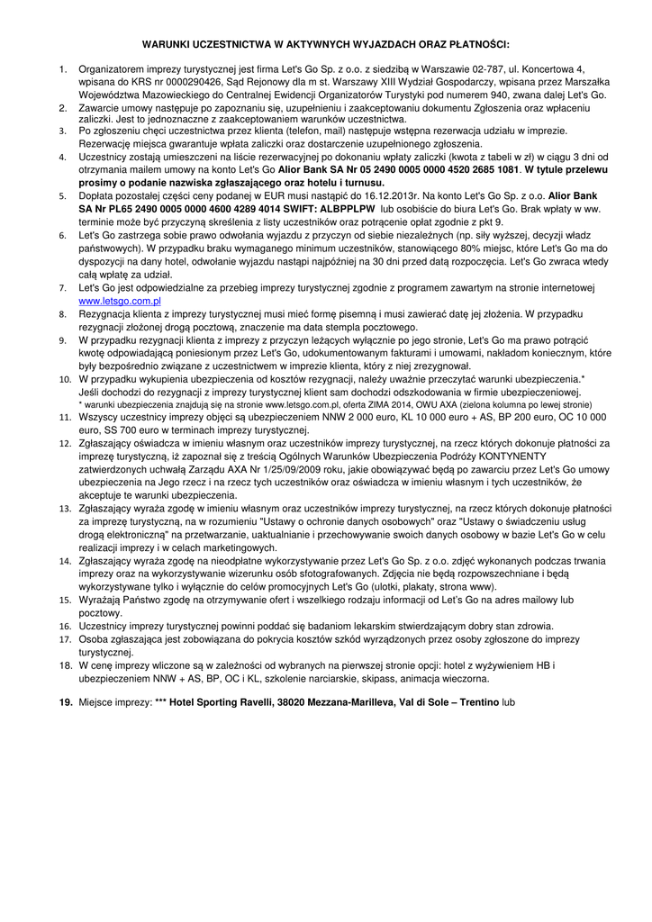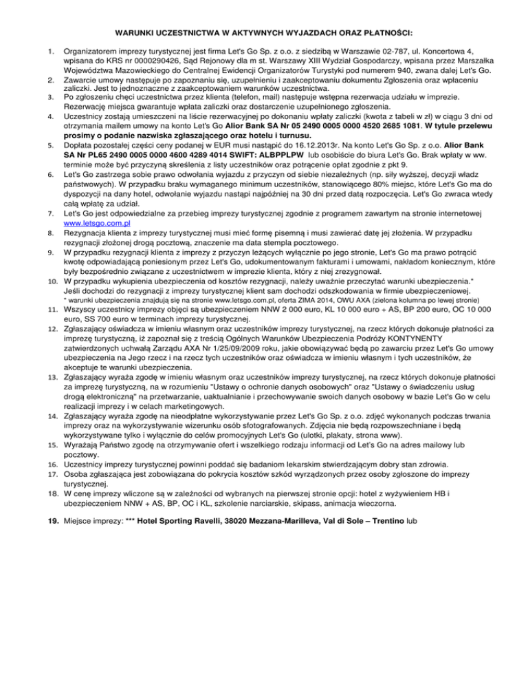 WARUNKI UCZESTNICTWA W AKTYWNYCH WYJAZDACH ORAZ PŁATNOŚCI: 1. Organizatorem imprezy turystycznej jest firma Let's Go Sp. z o.o. z siedzibą w Warszawie 02-787, ul. Koncertowa 4, wpisana do KRS nr 0000290426, Sąd Rejonowy dla m st. Warszawy XIII Wydział Gospodarczy, wpisana przez Marszałka Województwa Mazowieckiego do Centralnej Ewidencji Organizatorów Turystyki pod numerem 940, zwana dalej Let's Go. 2. Zawarcie umowy następuje po zapoznaniu się, uzupełnieniu i zaakceptowaniu dokumentu Zgłoszenia oraz wpłaceniu zaliczki. Jest to jednoznaczne z zaakceptowaniem warunków uczestnictwa. 3. Po zgłoszeniu chęci uczestnictwa przez klienta (telefon, mail) następuje wstępna rezerwacja udziału w imprezie. Rezerwację miejsca gwarantuje wpłata zaliczki oraz dostarczenie uzupełnionego zgłoszenia. 4. Uczestnicy zostają umieszczeni na liście rezerwacyjnej po dokonaniu wpłaty zaliczki (kwota z tabeli w zł) w ciągu 3 dni od otrzymania mailem umowy na konto Let's Go Alior Bank SA Nr 05 2490 0005 0000 4520 2685 1081. W tytule przelewu prosimy o podanie nazwiska zgłaszającego oraz hotelu i turnusu. 5. Dopłata pozostałej części ceny podanej w EUR musi nastąpić do 16.12.2013r. Na konto Let's Go Sp. z o.o. Alior Bank SA Nr PL65 2490 0005 0000 4600 4289 4014 SWIFT: ALBPPLPW lub osobiście do biura Let's Go. Brak wpłaty w ww. terminie może być przyczyną skreślenia z listy uczestników oraz potrącenie opłat zgodnie z pkt 9. 6. Let's Go zastrzega sobie prawo odwołania wyjazdu z przyczyn od siebie niezależnych (np. siły wyższej, decyzji władz państwowych). W przypadku braku wymaganego minimum uczestników, stanowiącego 80% miejsc, które Let's Go ma do dyspozycji na dany hotel, odwołanie wyjazdu nastąpi najpóźniej na 30 dni przed datą rozpoczęcia. Let's Go zwraca wtedy całą wpłatę za udział. 7. Let's Go jest odpowiedzialne za przebieg imprezy turystycznej zgodnie z programem zawartym na stronie internetowej www.letsgo.com.pl 8. Rezygnacja klienta z imprezy turystycznej musi mieć formę pisemną i musi zawierać datę jej złożenia. W przypadku rezygnacji złożonej drogą pocztową, znaczenie ma data stempla pocztowego. 9. W przypadku rezygnacji klienta z imprezy z przyczyn leżących wyłącznie po jego stronie, Let's Go ma prawo potrącić kwotę odpowiadającą poniesionym przez Let's Go, udokumentowanym fakturami i umowami, nakładom koniecznym, które były bezpośrednio związane z uczestnictwem w imprezie klienta, który z niej zrezygnował. 10. W przypadku wykupienia ubezpieczenia od kosztów rezygnacji, należy uważnie przeczytać warunki ubezpieczenia.* Jeśli dochodzi do rezygnacji z imprezy turystycznej klient sam dochodzi odszkodowania w firmie ubezpieczeniowej. * warunki ubezpieczenia znajdują się na stronie www.letsgo.com.pl, oferta ZIMA 2014, OWU AXA (zielona kolumna po lewej stronie) 11. Wszyscy uczestnicy imprezy objęci są ubezpieczeniem NNW 2 000 euro, KL 10 000 euro + AS, BP 200 euro, OC 10 000 euro, SS 700 euro w terminach imprezy turystycznej. 12. Zgłaszający oświadcza w imieniu własnym oraz uczestników imprezy turystycznej, na rzecz których dokonuje płatności za imprezę turystyczną, iż zapoznał się z treścią Ogólnych Warunków Ubezpieczenia Podróży KONTYNENTY zatwierdzonych uchwałą Zarządu AXA Nr 1/25/09/2009 roku, jakie obowiązywać będą po zawarciu przez Let's Go umowy ubezpieczenia na Jego rzecz i na rzecz tych uczestników oraz oświadcza w imieniu własnym i tych uczestników, że akceptuje te warunki ubezpieczenia. 13. Zgłaszający wyraża zgodę w imieniu własnym oraz uczestników imprezy turystycznej, na rzecz których dokonuje płatności za imprezę turystyczną, na w rozumieniu "Ustawy o ochronie danych osobowych" oraz "Ustawy o świadczeniu usług drogą elektroniczną" na przetwarzanie, uaktualnianie i przechowywanie swoich danych osobowy w bazie Let's Go w celu realizacji imprezy i w celach marketingowych. 14. Zgłaszający wyraża zgodę na nieodpłatne wykorzystywanie przez Let's Go Sp. z o.o. zdjęć wykonanych podczas trwania imprezy oraz na wykorzystywanie wizerunku osób sfotografowanych. Zdjęcia nie będą rozpowszechniane i będą wykorzystywane tylko i wyłącznie do celów promocyjnych Let's Go (ulotki, plakaty, strona www). 15. Wyrażają Państwo zgodę na otrzymywanie ofert i wszelkiego rodzaju informacji od Let’s Go na adres mailowy lub pocztowy. 16. Uczestnicy imprezy turystycznej powinni poddać się badaniom lekarskim stwierdzającym dobry stan zdrowia. 17. Osoba zgłaszająca jest zobowiązana do pokrycia kosztów szkód wyrządzonych przez osoby zgłoszone do imprezy turystycznej. 18. W cenę imprezy wliczone są w zależności od wybranych na pierwszej stronie opcji: hotel z wyżywieniem HB i ubezpieczeniem NNW + AS, BP, OC i KL, szkolenie narciarskie, skipass, animacja wieczorna. 19. Miejsce imprezy: *** Hotel Sporting Ravelli, 38020 Mezzana-Marilleva, Val di Sole – Trentino lub