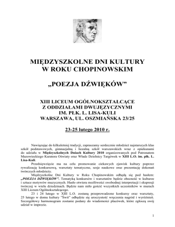 MIĘDZYSZKOLNE DNI KULTURY W ROKU CHOPINOWSKIM „POEZJA DŹWIĘKÓW” XIII LICEUM OGÓLNOKSZTAŁCĄCE Z ODDZIAŁAMI DWUJĘZYCZNYMI IM. PŁK. L. LISA-KULI WARSZAWA, UL. OSZMIAŃSKA 23/25 23-25 lutego 2010 r. Nawiązując do kilkuletniej tradycji, zapraszamy serdecznie młodzież najstarszych klas szkół podstawowych, gimnazjalną i licealną szkół warszawskich wraz z opiekunami do udziału w Międzyszkolnych Dniach Kultury 2010 organizowanych pod Patronatem Mazowieckiego Kuratora Oświaty oraz Władz Dzielnicy Targówek w XIII L.O. im. płk. L. Lisa-Kuli. Przedsięwzięcie ma na celu promowanie ciekawych zjawisk kultury poprzez rywalizację konkursową, warsztaty tematyczne, sesje naukowe oraz prezentację dokonań twórczych młodzieży. Międzyszkolne Dni Kultury w Roku Chopinowskim odbędą się pod hasłem: „POEZJA DŹWIĘKÓW”. Tematyką konkursów i warsztatów będzie obecność w kulturze i sztuce motywów muzycznych. Hasło otwiera możliwości swobodnej interpretacji i ekspresji twórczej w wielu dziedzinach. Będzie nam miło gościć wszystkich uczestników w murach XIII Liceum Ogólnokształcącego. 23 i 24 lutego w XIII L.O. zostaną przeprowadzone konkursy oraz warsztaty, 25 lutego w domu kultury ”Świt” odbędzie się uroczystość wręczenia nagród i wyróżnień. Szczegółowy harmonogram zostanie podany do wiadomości placówek, które zgłoszą swój udział w imprezie. 1 Zgłoszenia do udziału prosimy przesyłać faksem na nr: 022 679 38 62; 022 679 34 57 lub mailem na adres: [email protected] Termin nadsyłania zgłoszeń upływa 19 lutego 2010 roku. REGULAMIN ORGANIZACYJNY Międzyszkolnych Dni Kultury 2010 1. Organizator: XIII LICEUM OGÓLNOKSZTAŁCĄCE Z ODDZIAŁAMI DWUJĘZYCZNYMI IM. PŁK. L. LISA-KULI 03-503 WARSZAWA, UL. OSZMIAŃSKA 23/25 2. Patronat: Mazowiecki Kurator Oświaty Władze Dzielnicy Targówek 3. Uczestnicy: Dzieci i młodzież szkół warszawskich Konkursy rozgrywają się w trzech kategoriach: Uczniowie najstarszych klas szkół podstawowych Uczniowie klas gimnazjalnych Uczniowie klas licealnych 4. Termin i miejsce: 23-25 lutego 2010 r. XIII LICEUM OGÓLNOKSZTAŁCĄCE IM. PŁK. L. LISA-KULI 03-503 WARSZAWA, UL. OSZMIAŃSKA 23/25; tel/fax.: 022 679-38-62 5. W Jury zasiądą specjaliści oraz nauczyciele – przedstawiciele placówek oświatowych, które zgłoszą swój udział w Międzyszkolnych Dniach Kultury. Jury Międzyszkolnych Dni Kultury 2010 przyzna po trzy nagrody w każdej z kategorii wiekowych i w każdym z konkursów. W uzasadnionych przypadkach jury ma prawo przyznać indywidualne dodatkowe nagrody i wyróżnienia. 6. Finał Międzyszkolnych Dni Kultury 2010 odbędzie się 25 lutego o godzinie 13.00 w domu kultury „Świt”. W tym dniu zostaną wręczone nagrody. Nastąpi też prezentacja spektaklu Grupy Teatralnej PUNKT z XIII L.O. im. płk. L. Lisa-Kuli. Informacje dodatkowe: 1. Nauczyciele przygotowujący młodzież do udziału w Międzyszkolnych Dniach Kultury otrzymają poświadczenia udziału oraz nagrody rzeczowe. 2. XIII L.O. zapewnia sprzęt nagłaśniający, oświetlenie, scenę, pianino. Szczegóły dotyczące wymagań technicznych należy przedstawić w karcie uczestnictwa. 3. Prace plastyczne zostaną zaprezentowane na wystawie zorganizowanej w XIII L.O. podczas Międzyszkolnych Dni Kultury 2010. 2 4. Wszelkie pytania mogą Państwo kierować pod nr tel: 022 679-38-62 (sekretariat XIII L.O.) . Konkursy ogłoszone w ramach Międzyszkolnych Dni Kultury 2010: 1. Konkurs plastyczny: „Poezja dźwięków” Prace mają być ilustracją do wybranych utworów muzycznych Fryderyka Chopina Prace mogą być wykonane dowolną techniką w formacie co najmniej A-3 Jury oceni wykonanie oraz pomysłowość Prace na ten konkurs należy dostarczyć do 19 lutego 2010r. 2. Konkurs poetycki: „Poezja dźwięków” Jest to konkurs na wiersz Tematyka utworu jest dowolna, jednak zgodna z hasłem dni kultury Każdy uczeń może zgłosić maksymalnie 3 utwory Jury oceni poziom literacki utworów oraz pomysłowość w doborze tematyki Prace na ten konkurs należy dostarczyć do 19 lutego 2010r. 3. Konkurs na opowiadanie pod tytułem: „Poezja dźwięków” Każdy uczeń może zgłosić jedno opowiadanie Opowiadanie nie może przekraczać 4 stron wydruku komputerowego Jury oceni poziom literacki utworów oraz pomysłowość w doborze tematyki Prace na ten konkurs należy dostarczyć do 19 lutego 2010r. 4. Konkurs recytatorski: „Poezja dźwięków” Tematyka przygotowanych utworów powinna być związana z wątkami muzycznymi w literaturze Każdy uczestnik przygotowuje 1 utwór poetycki i 1 fragment prozy Łączny czas prezentacji nie może przekroczyć 10 minut Jury oceni sposób interpretacji, poprawność dykcji oraz ogólne wrażenia artystyczne 5. Konkurs wokalny: „Poezja dźwięków” Każdy uczestnik prezentuje 2 piosenki (tematyka utworów jest dowolna) Jury oceni umiejętności wokalne, poprawność wykonania oraz ogólne wrażenia artystyczne 6. Konkurs na prezentację multimedialną poświęconą życiu i twórczości Fryderyka Chopina Jury oceni poziom merytoryczny prezentacji oraz wykonanie Prace na ten konkurs należy dostarczyć do 19 lutego 2010r. 7. Konkurs teatralny pod hasłem: „Poezja dźwięków” 3 Tematyka spektakli jest dowolna, jednak inspirowana hasłem dni kultury Czas prezentacji spektaklu nie powinien przekraczać 20 minut Jury oceni predyspozycje aktorskie uczestników, scenografię, reżyserię oraz ogólne wrażenia artystyczne 8. Konkurs instrumentalny: „Poezja dźwięków” W konkursie mogą wziąć udział soliści i zespoły Dobór repertuaru i gatunku muzycznego jest dowolny Każdy wykonawca/zespół prezentuje dwa utwory instrumentalne Jury oceni sposób interpretacji, poprawność wykonania oraz ogólne wrażenia artystyczne Działania animacyjne podjęte w ramach Międzyszkolnych Dni Kultury 2010: 1. Warsztaty teatralne, literackie, plastyczne, dziennikarskie i filmowe W warszt
