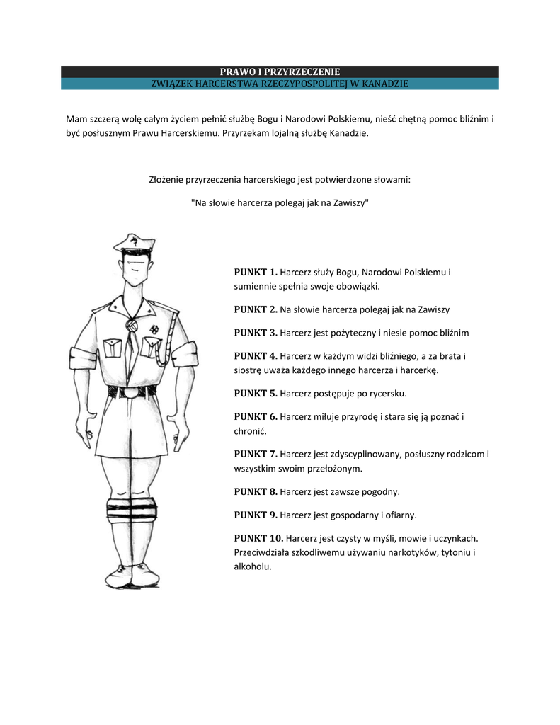 PRAWO I PRZYRZECZENIE ZWIĄZEK HARCERSTWA RZECZYPOSPOLITEJ W KANADZIE Mam szczerą wolę całym życiem pełnid służbę Bogu i Narodowi Polskiemu, nieśd chętną pomoc bliźnim i byd posłusznym Prawu Harcerskiemu. Przyrzekam lojalną służbę Kanadzie. Złożenie przyrzeczenia harcerskiego jest potwierdzone słowami: "Na słowie harcerza polegaj jak na Zawiszy" PUNKT 1. Harcerz służy Bogu, Narodowi Polskiemu i sumiennie spełnia swoje obowiązki. PUNKT 2. Na słowie harcerza polegaj jak na Zawiszy PUNKT 3. Harcerz jest pożyteczny i niesie pomoc bliźnim PUNKT 4. Harcerz w każdym widzi bliźniego, a za brata i siostrę uważa każdego innego harcerza i harcerkę. PUNKT 5. Harcerz postępuje po rycersku. PUNKT 6. Harcerz miłuje przyrodę i stara się ją poznad i chronid. PUNKT 7. Harcerz jest zdyscyplinowany, posłuszny rodzicom i wszystkim swoim przełożonym. PUNKT 8. Harcerz jest zawsze pogodny. PUNKT 9. Harcerz jest gospodarny i ofiarny. PUNKT 10. Harcerz jest czysty w myśli, mowie i uczynkach. Przeciwdziała szkodliwemu używaniu narkotyków, tytoniu i alkoholu.