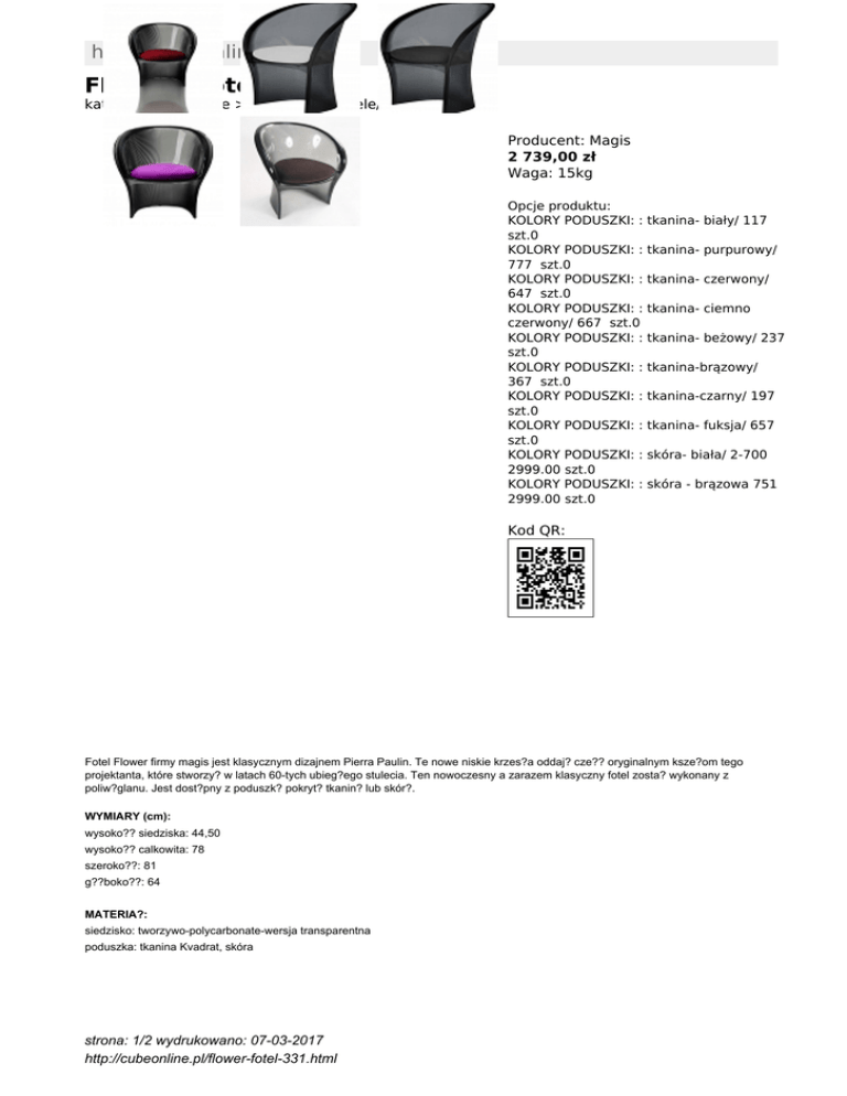 http://cubeonline.pl FLOWER fotel kategoria: Kategorie > HORECA > Fotele/ Sofy Producent: Magis 2 739,00 zł Waga: 15kg Opcje produktu: KOLORY PODUSZKI: : szt.0 KOLORY PODUSZKI: : 777 szt.0 KOLORY PODUSZKI: : 647 szt.0 KOLORY PODUSZKI: : czerwony/ 667 szt.0 KOLORY PODUSZKI: : szt.0 KOLORY PODUSZKI: : 367 szt.0 KOLORY PODUSZKI: : szt.0 KOLORY PODUSZKI: : szt.0 KOLORY PODUSZKI: : 2999.00 szt.0 KOLORY PODUSZKI: : 2999.00 szt.0 tkanina- biały/ 117 tkanina- purpurowy/ tkanina- czerwony/ tkanina- ciemno tkanina- beżowy/ 237 tkanina-brązowy/ tkanina-czarny/ 197 tkanina- fuksja/ 657 skóra- biała/ 2-700 skóra - brązowa 751 Kod QR: Fotel Flower firmy magis jest klasycznym dizajnem Pierra Paulin. Te nowe niskie krzes?a oddaj? cze?? oryginalnym ksze?om tego projektanta, które stworzy? w latach 60-tych ubieg?ego stulecia. Ten nowoczesny a zarazem klasyczny fotel zosta? wykonany z poliw?glanu. Jest dost?pny z poduszk? pokryt? tkanin? lub skór?. WYMIARY (cm): wysoko?? siedziska: 44,50 wysoko?? calkowita: 78 szeroko??: 81 g??boko??: 64 MATERIA?: siedzisko: tworzywo-polycarbonate-wersja transparentna poduszka: tkanina Kvadrat, skóra strona: 1/2 wydrukowano: 07-03-2017 http://cubeonline.pl/flower-fotel-331.html Inne produkty Magis: http://www.cubeonline.pl/manufacturer/magis Inne produkty projektanta: http://www.cubeonline.pl/designer/paulin-pierre strona: 2/2 wydrukowano: 07-03-2017 http://cubeonline.pl/flower-fotel-331.html