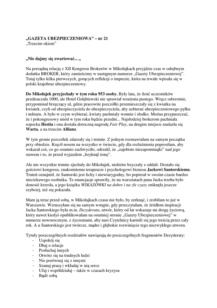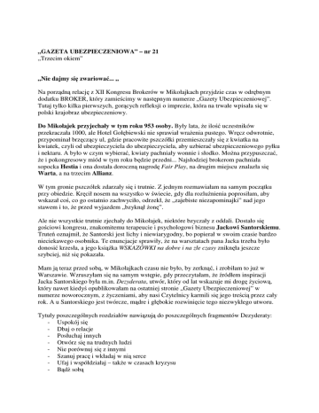 „GAZETA UBEZPIECZENIOWA” – nr 21 „Trzecim okiem” „Nie dajmy się zwariować... „ Na porządną relację z XII Kongresu Brokerów w Mikołajkach przyjdzie czas w odrębnym dodatku BROKER, który zamieścimy w następnym numerze „Gazety Ubezpieczeniowej”. Tutaj tylko kilka pierwszych, gorących refleksji o imprezie, która na trwałe wpisała się w polski krajobraz ubezpieczeniowy. Do Mikołajek przyjechały w tym roku 953 osoby. Były lata, że ilość uczestników przekraczała 1000, ale Hotel Gołębiewski nie sprawiał wrażenia pustego. Wręcz odwrotnie, przypominał brzęczący ul, gdzie pracowite pszczółki przemieszczały się z kwiatka na kwiatek, czyli od ubezpieczyciela do ubezpieczyciela, aby uzbierać ubezpieczeniowego pyłku i nektaru. A było w czym wybierać, kwiaty pachniały wonnie i słodko. Można przypuszczać, że i pokongresowy miód w tym roku będzie przedni... Najsłodziej brokerom pachniała sopocka Hestia i ona dostała doroczną nagrodę Fair Play, na drugim miejscu znalazła się Warta, a na trzecim Allianz. W tym gronie pszczółek zdarzały się i trutnie. Z jednym rozmawiałam na samym początku przy obiedzie. Kręcił nosem na wszystko w świecie, gdy dla rozluźnienia poprosiłam, aby wskazał coś, co go ostatnio zachwyciło, odrzekł, że „zajebiste niezapominajki” nad jego stawem i to, że przed wyjazdem „bzyknął żonę”. Ale nie wszystkie trutnie zjechały do Mikołajek, niektóre bzyczały z oddali. Dostało się gościowi kongresu, znakomitemu terapeucie i psychologowi biznesu Jackowi Santorskiemu. Truteń oznajmił, że Santorski jest lichy i niewiarygodny, bo popierał w swoim czasie bardzo nieciekawego osobnika. Te enuncjacje sprawiły, że na warsztatach pana Jacka trzeba było donosić krzesła, a jego książka WSKAZÓWKI na dobre i na złe czasy zniknęła jeszcze szybciej, niż się pokazała. Mam ją teraz przed sobą, w Mikołajkach czasu nie było, by zerknąć, i zrobiłam to już w Warszawie. Wzruszyłam się na samym wstępie, gdy przeczytałam, że źródłem inspiracji Jacka Santorskiego była m.in. Dezyderata, utwór, który od lat wskazuje mi drogę życiową, który nawet kiedyś opublikowałam na ostatniej stronie „Gazety Ubezpieczeniowej” w numerze noworocznym, z życzeniami, aby nasi Czytelnicy karmili się jego treścią przez cały rok. A u Santorskiego jest twórcze, mądre i głębokie rozwinięcie tego niezwykłego utworu. Tytuły poszczególnych rozdziałów nawiązują do poszczególnych fragmentów Dezyderaty: - Uspokój się - Dbaj o relacje - Posłuchaj innych - Otwórz się na trudnych ludzi - Nie porównuj się z innymi - Szanuj pracę i wkładaj w nią serce - Ufaj i współdziałaj – także w czasach kryzysu - Bądź sobą - Zarządzaj przemijaniem Rozwijaj siłę ducha – łącz realizm i wiarę Bądź łagodny dla siebie Poczuj się dzieckiem wszechświata Odkrywaj wartości – przywracaj równowagę Praktykuj uważność. Szef Stowarzyszenia brokerów Jacek Kliszcz miał powody do zadowolenia, bowiem gdy zwykle pod koniec kongresu sala zaczynała łysieć, to na podsumowujący wykład Jacka Santorskiego znowu ściągnęły tłumy. Mój mąż, stary dziennikarz, zawsze mi powtarzał: – Miruniu pamiętaj – źle czy dobrze, byle z nazwiskiem. To właśnie Santorski podsumował panel dyskusyjny i rzekł: – Z czym wyjeżdżam z kongresu? Z wiarą, że mogę wpływać na to, jakimi będą otaczający mnie ludzie, że będą chcieli powracać do podstawowych wartości, takich jak: uczciwość, szacunek, dobro; że trzeba rzeczy upraszczać, aby stały się bardziej przejrzyste; byśmy byli uważni na wszelkie „ruchy tektoniczne”, ale nie popadali w skrajność, czyli w spiskową wizję świata. Nie dajmy się zwariować! – zaapelował na koniec. „Nie dajmy się zwariować” – powtarzałam zatem sobie, gdy zaczęłam słuchać kongresowych plotek o Polskiej Izbie Ubezpieczeń, której wiceprezes Jan Grzegorz Prądzyński gościł na kongresie. Miał krótkie wystąpienie pod koniec, w czasie którego z dumą zaprezentował m.in. nowe logo PIU. – Czy wie pani redaktor, ile ONI dali za to logo? – spytano mnie w kuluarach. Niestety, jak na wszechstronnie poinformowaną dziennikarkę, wypadłam marnie – nie wiedziałam. Gdy padła ta kwota, zdębiałam, a potem powiedziałam, że to raczej niemożliwe; niemożliwe, by w czasach największego w ostatnim stuleciu kryzysu finansowego najpoważniejsze ciało zrzeszające ubezpieczycieli wydawało setki tysięcy złotych na swoje logo (nie najbrzydsze, podobne jest zresztą do loga mojej Agencji Wydawniczej OPOKA, które to bodajże za 500 zł zaprojektował nam w 2002 r. świetny grafik Piotr Wyskok, wówczas jeszcze student ASP w Warszawie). – A wie pani, ile wzięła firma, która od roku szuka prezesa PIU? – tu znowu padła stosowna, podobna w wysokości do poprzedniej kwota. Też nie wiedziałam, i też nie uwierzyłam, ale na temat tego wystąpienia plotkowało już pół kongresu, więc apeluję do PIU: - Może ktoś robi Wam krecią robotę i rzuca sumami wziętymi z sufitu. Podajcie je dla świętego spokoju na Waszych stronach internetowych. Nie pozwalajcie, by psuto tyle ubezpieczeniowej krwi, i to tuż (ponoć) przed rozstrzygnięciem biegu po fotel prezesa PIU. Kongres brokerów wystosował APEL o edukację ubezpieczeniową, ja apeluję o transparentność kosztów Polskiej Izby Ubezpieczeń. Prezydent Barack Obama umieszcza w internecie każdego dolara, który idzie na pomoc sektorowi finansowemu. Czy złotówka gorsza? A nasz internet mniej pojemny? Bożena M. Dołęgowska-Wysocka * * *