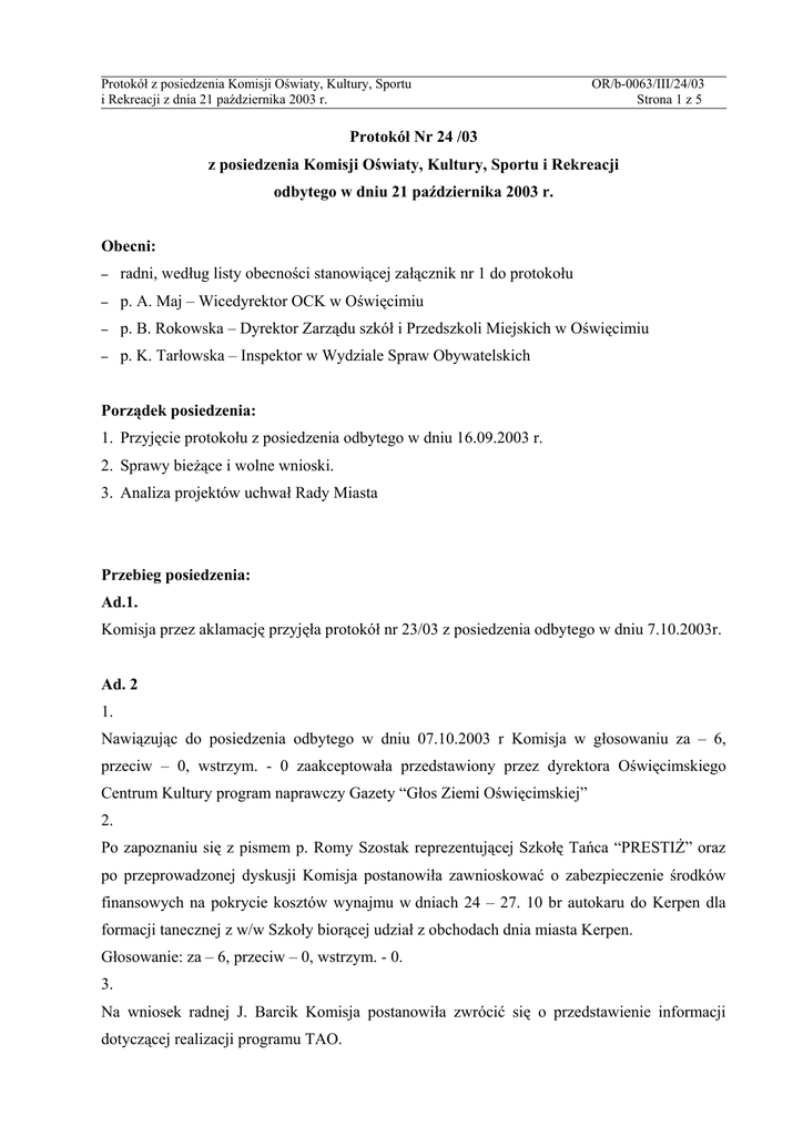 Protokół z posiedzenia Komisji Oświaty, Kultury, Sportu i Rekreacji z dnia 21 października 2003 r. OR/b-0063/III/24/03 Strona 1 z 5 Protokół Nr 24 /03 z posiedzenia Komisji Oświaty, Kultury, Sportu i Rekreacji odbytego w dniu 21 października 2003 r. Obecni: – radni, według listy obecności stanowiącej załącznik nr 1 do protokołu – p. A. Maj – Wicedyrektor OCK w Oświęcimiu – p. B. Rokowska – Dyrektor Zarządu szkół i Przedszkoli Miejskich w Oświęcimiu – p. K. Tarłowska – Inspektor w Wydziale Spraw Obywatelskich Porządek posiedzenia: 1. Przyjęcie protokołu z posiedzenia odbytego w dniu 16.09.2003 r. 2. Sprawy bieżące i wolne wnioski. 3. Analiza projektów uchwał Rady Miasta Przebieg posiedzenia: Ad.1. Komisja przez aklamację przyjęła protokół nr 23/03 z posiedzenia odbytego w dniu 7.10.2003r. Ad. 2 1. Nawiązując do posiedzenia odbytego w dniu 07.10.2003 r Komisja w głosowaniu za – 6, przeciw – 0, wstrzym. - 0 zaakceptowała przedstawiony przez dyrektora Oświęcimskiego Centrum Kultury program naprawczy Gazety “Głos Ziemi Oświęcimskiej” 2. Po zapoznaniu się z pismem p. Romy Szostak reprezentującej Szkołę Tańca “PRESTIŻ” oraz po przeprowadzonej dyskusji Komisja postanowiła zawnioskować o zabezpieczenie środków finansowych na pokrycie kosztów wynajmu w dniach 24 – 27. 10 br autokaru do Kerpen dla formacji tanecznej z w/w Szkoły biorącej udział z obchodach dnia miasta Kerpen. Głosowanie: za – 6, przeciw – 0, wstrzym. - 0. 3. Na wniosek radnej J. Barcik Komisja postanowiła zwrócić się o przedstawienie informacji dotyczącej realizacji programu TAO. Protokół z posiedzenia Komisji Oświaty, Kultury, Sportu i Rekreacji z dnia 21 października 2003 r. OR/b-0063/III/24/03 Strona 2 z 5 4. Po zapoznaniu się z pismem Fundacji AWIN SPORT w sprawie organizacji kolarskiego wyścigu przełajowego Komisja postanowiła zwrócić się do Prezydenta Miasta o przedstawienie stanowiska. 5. Komisja przyjęła do wiadomości: – pismo Prezesa Zarządu “DWORY UNIA” Sportowej Spółki Akcyjnej w Oświęcimiu w sprawie wsparcia działań Spółki mających na celu zagospodarowanie wolnego czasu młodzieży z terenu miasta i powiatu oświęcimskiego, – pismo Stowarzyszenia Gospodarczego Ziemi Oświęcimskiej w sprawie oznakowania dojazdu autokarów do parkingów na Pl. T.Kościuszi i ul. Bulwary oraz likwidacji kwietników w Rynku Głównym, – odpowiedź na wniosek Komisji w sprawie przedstawienia pisemnej propozycji zadań priorytetowych na 2004 r. wynikających ze Strategii rozwoju turystyki miasta Oświęcim z uwzględnieniem terminów realizacji oraz wysokości środków finansowych niezbędnych do ich realizacji. 6. Po zapoznaniu się z propozycją szlaków turystycznych po mieście Komisja postanowiła przeanalizować je na jednym z kolejnych posiedzeń. Ad. 3 1. Komisja szczegółowo przeanalizowała projekt uchwały w sprawie zmian w budżecie miasta w zakresie dot. Działalności Komisji. Proponowane w projekcie uchwały zmiany: w załączniku nr 2 – polegają na przesunięciu środków finansowych z oszczędności powstałych z tytułu naliczenia składek ZUS i przeznaczenia ich na pokrycie kosztów zamontowania dodatkowego gniazda elektrycznego na siłę do zakupionej obieraczki na kuchnię w świetlicy MG-4, w załączniku nr 5 - dokonuje się w związku zakończeniem postępowania przetargowego na zadanie inwestycyjne p.n. „Wymiana stolarki okiennej w placówkach oświatowych prowadzonych przez miasto.” Wartość wymiany okien w przedszkolach jest o 69.310zł niższa od kosztorysu inwestorskiego. Ponadto dokonuje się podziału środków w dziale 801 na rozdział szkoły podstawowe i gimnazja. Brakującą kwotę powstałą na skutek zaokrągleń planu do Protokół z posiedzenia Komisji Oświaty, Kultury, Sportu i Rekreacji z dnia 21 października 2003 r. OR/b-0063/III/24/03 Strona 3 z 5 pełnych złotych proponuje się uzupełnić ze zrealizowanego zadania inwestycyjnego p.n. „Zakup komputera z programem i drukarką - MG 4 w załączniku nr 8 - zmian dokonuje się w celu utworzenia nowego zadania inwestycyjnego p.n. „Adaptacja części pomieszczeń SP-1 na pomieszczenia biurowe dla ZSiPM”. Środki finansowe pochodzą z oszczędności na wydatkach płacowych i pochodnych od wynagrodzeń w rozdziale świetlice szkolne. Całkowity koszt zadania wyniesie 271.500zł. Pozostała kwota może być sfinansowana z oszczędności na płacach w placówkach oświatowych. Zmiany w budżecie w tym zakresie może dokonać Prezydent Miasta. Komisja w głosowaniu za – 6, przeciw – 0, wstrzym. - 0 pozytywnie zaopiniowała załączniki nr 2, nr 5 i nr 8 do projektu uchwały. W załączniku nr 4 - wprowadza się do budżetu miasta środki finansowe w kwocie 74.888zł przekazane w 2002 roku na subkonto – z zadań inwestycyjnych p.n.: – Budowa kolektora sanitarnego przy ul.Fabrycznej” – kwota 7.267zł, – Uzbrojenie terenu na os. Stare Stawy (TBS)” – kwota 67.621zł. Powyższą kwotę przeznacza się na dotacje celową dla OCK w Oświęcimiu z czego: – kwotę 24.888zł na zakup nagłośnienia konferencyjnego. Aktualnie posiadany sprzęt nagłaśniający OCK nie spełnia oczekiwań organizatorów narad i konferencji, – kwotę 50.000zł na modernizację sali konferencyjnej. Komisja w głosowaniu za – 7, przeciw – 0, wstrzym. - 0 pozytywnie zaopiniowała załącznik nr 4. Komisja postanowiła zawnioskować o uwzględnienie w budżecie miasta na 2004 r. środków finansowych na wykonanie kompleksowego projektu modernizacji OCK. Głosowanie: za – 7, przeciw – 0, wstrzym. - 0 2. Komisja przeanalizowała projekt uchwały w sprawie zmiany uchwały Nr IV/33/03 Rady Miasta Oświęcim z dnia 22.01.2003 r. oraz wysłuchała dodatkowych wyjaśnień p. K. Tarłowskiej, która poinformowała, że na realizację Gminnego Programu Profilaktyki i Rozwiązywania Problemów Alkoholowych na terenie miasta O