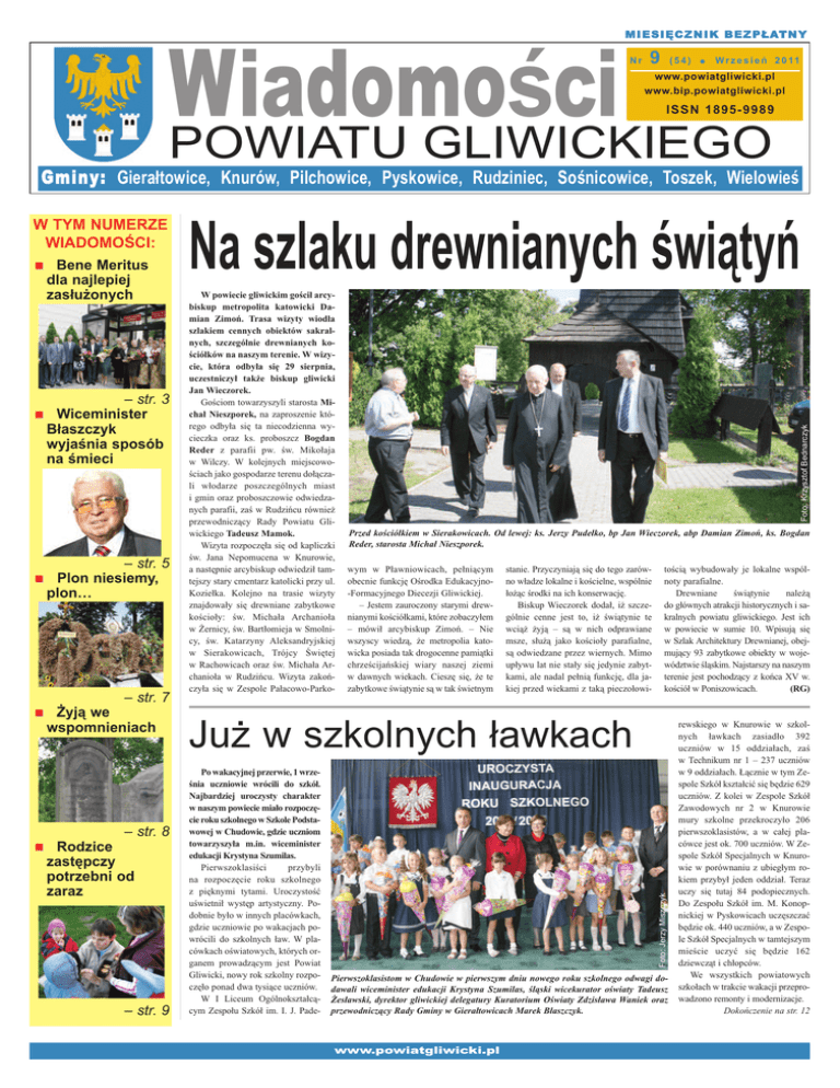 Wiadomości POWIATU GLIWICKIEGO M I E S I Ę C Z N I K B E Z P Ł AT N Y Nr 9 (54) W r z e s i e ń 2 0 11 www.powiatgliwicki.pl www.bip.powiatgliwicki.pl IS S N 1 8 9 5 - 9 9 8 9 Na szlaku drewnianych świątyń Bene Meritus dla najlepiej zasłużonych – str. 3 Wiceminister Błaszczyk wyjaśnia sposób na śmieci – str. 5 Plon niesiemy, plon… – str. 7 Żyją we wspomnieniach – str. 8 Rodzice zastępczy potrzebni od zaraz – str. 9 W powiecie gliwickim gościł arcybiskup metropolita katowicki Damian Zimoń. Trasa wizyty wiodła szlakiem cennych obiektów sakralnych, szczególnie drewnianych kościółków na naszym terenie. W wizycie, która odbyła się 29 sierpnia, uczestniczył także biskup gliwicki Jan Wieczorek. Gościom towarzyszyli starosta Michał Nieszporek, na zaproszenie którego odbyła się ta niecodzienna wycieczka oraz ks. proboszcz Bogdan Reder z parafii pw. św. Mikołaja w Wilczy. W kolejnych miejscowościach jako gospodarze terenu dołączali włodarze poszczególnych miast i gmin oraz proboszczowie odwiedzanych parafii, zaś w Rudzińcu również przewodniczący Rady Powiatu Gliwickiego Tadeusz Mamok. Wizyta rozpoczęła się od kapliczki św. Jana Nepomucena w Knurowie, a następnie arcybiskup odwiedził tamtejszy stary cmentarz katolicki przy ul. Koziełka. Kolejno na trasie wizyty znajdowały się drewniane zabytkowe kościoły: św. Michała Archanioła w Żernicy, św. Bartłomieja w Smolnicy, św. Katarzyny Aleksandryjskiej w Sierakowicach, Trójcy Świętej w Rachowicach oraz św. Michała Archanioła w Rudzińcu. Wizyta zakończyła się w Zespole Pałacowo-Parko- Foto: Krzysztof Bednarczyk Przed kościółkiem w Sierakowicach. Od lewej: ks. Jerzy Pudełko, bp Jan Wieczorek, abp Damian Zimoń, ks. Bogdan Reder, starosta Michał Nieszporek. wym w Pławniowicach, pełniącym obecnie funkcję Ośrodka Edukacyjno-Formacyjnego Diecezji Gliwickiej. – Jestem zauroczony starymi drewnianymi kościółkami, które zobaczyłem – mówił arcybiskup Zimoń. – Nie wszyscy wiedzą, że metropolia katowicka posiada tak drogocenne pamiątki chrześcijańskiej wiary naszej ziemi w dawnych wiekach. Cieszę się, że te zabytkowe świątynie są w tak świetnym stanie. Przyczyniają się do tego zarówno władze lokalne i kościelne, wspólnie łożąc środki na ich konserwację. Biskup Wieczorek dodał, iż szczególnie cenne jest to, iż świątynie te wciąż żyją – są w nich odprawiane msze, służą jako kościoły parafialne, są odwiedzane przez wiernych. Mimo upływu lat nie stały się jedynie zabytkami, ale nadal pełnią funkcję, dla jakiej przed wiekami z taką pieczołowi- Już w szkolnych ławkach Po wakacyjnej przerwie, 1 września uczniowie wrócili do szkół. Najbardziej uroczysty charakter w naszym powiecie miało rozpoczęcie roku szkolnego w Szkole Podstawowej w Chudowie, gdzie uczniom towarzyszyła m.in. wiceminister edukacji Krystyna Szumilas. Pierwszoklasiści przybyli na rozpoczęcie roku szkolnego z pięknymi tytami. Uroczystość uświetnił występ artystyczny. Podobnie było w innych placówkach, gdzie uczniowie po wakacjach powrócili do szkolnych ław. W placówkach oświatowych, których organem prowadzącym jest Powiat Gliwicki, nowy rok szkolny rozpoczęło ponad dwa tysiące uczniów. W I Liceum Ogólnokształcącym Zespołu Szkół im. I. J. Pade- tością wybudowały je lokalne wspólnoty parafialne. Drewniane świątynie należą do głównych atrakcji historycznych i sakralnych powiatu gliwickiego. Jest ich w powiecie w sumie 10. Wpisują się w Szlak Architektury Drewnianej, obejmujący 93 zabytkowe obiekty w województwie śląskim. Najstarszy na naszym terenie jest pochodzący z końca XV w. kościół w Poniszowicach. (RG) Foto: Jerzy Miszczyk W TYM NUMERZE WIADOMOŚCI: Foto: ARC G m i n y : Gierałtowice, Knurów, Pilchowice, Pyskowice, Rudziniec, Sośnicowice, Toszek, Wielowieś Pierwszoklasistom w Chudowie w pierwszym dniu nowego roku szkolnego odwagi dodawali wiceminister edukacji Krystyna Szumilas, śląski wicekurator oświaty Tadeusz Żesławski, dyrektor gliwickiej delegatury Kuratorium Oświaty Zdzisława Waniek oraz przewodniczący Rady Gminy w Gierałtowicach Marek Błaszczyk. www.powiatgliwicki.pl rewskiego w Knurowie w szkolnych ławkach zasiadło 392 uczniów w 15 oddziałach, zaś w Technikum nr 1 – 237 uczniów w 9 oddziałach. Łącznie w tym Zespole Szkół kształcić się będzie 629 uczniów. Z kolei w Zespole Szkół Zawodowych nr 2 w Knurowie mury szkolne przekroczyło 206 pierwszoklasistów, a w całej placówce jest ok. 700 uczniów. W Zespole Szkół Specjalnych w Knurowie w porównaniu z ubiegłym rokiem przybył jeden oddział. Teraz uczy się tutaj 84 podopiecznych. Do Zespołu Szkół im. M. Konopnickiej w Pyskowicach uczęszczać będzie ok. 440 uczniów, a w Zespole Szkół Specjalnych w tamtejszym mieście uczyć się będzie 162 dziewcząt i chłopców. We wszystkich powiatowych szkołach w trakcie wakacji przeprowadzono remonty i modernizacje. Dokończenie na str. 12 N R 9 (5 4 ) WR ZESI EŃ 2 01 1 W okresie między dwoma ostatnimi sesjami Rady Powiatu Gliwickiego odbyło się 10 posiedzeń Zarządu Powiatu. Mimo wakacji były bardzo pracowite. Nie sposób tu wymienić wszystkich spraw, które rozpatrywane były w tym czasie na jego posiedzeniach, dlatego wymienię tylko najważniejsze z nich, wspomagając się przy tym niezbędnymi liczbami. Zarząd Powiatu Gliwickiego podjął w tym czasie 36 uchwał, w tym 19 dotyczących spraw budżetowych. Zarząd zaakceptował szereg dokumentów, w tym np. treść umowy zawieranej z Wojewodą Śląskim o dofinansowanie z budżetu państwa w ramach Narodowego Programu Przebudowy Dróg Lokalnych 2008-2011 projektu pn.: ,,Przebudowa drogi powiatowej Nr 2991S – etap II (gmina Sośnicowice, powiat gliwicki)”. Zarząd przyjął założenia do projektu budżetu Powiatu Gliwickiego na 2012 r. Wyraził zgodę m.in. na: dokonanie robót adapt
