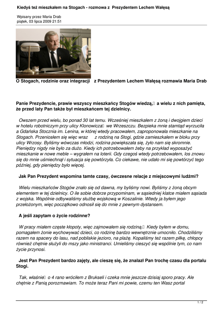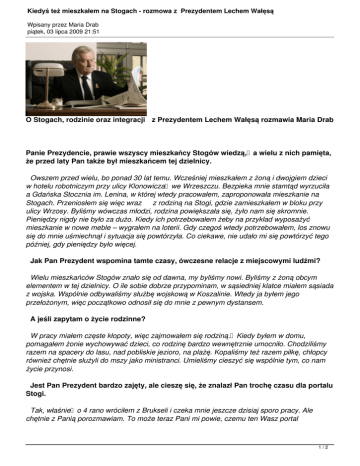 Kiedyś też mieszkałem na Stogach - rozmowa z Prezydentem Lechem Wałęsą Wpisany przez Maria Drab piątek, 03 lipca 2009 21:51 O Stogach, rodzinie oraz integracji z Prezydentem Lechem Wałęsą rozmawia Maria Drab Panie Prezydencie, prawie wszyscy mieszkańcy Stogów wiedzą, a wielu z nich pamięta, że przed laty Pan także był mieszkańcem tej dzielnicy. Owszem przed wielu, bo ponad 30 lat temu. Wcześniej mieszkałem z żoną i dwojgiem dzieci w hotelu robotniczym przy ulicy Klonowicza we Wrzeszczu. Bezpieka mnie stamtąd wyrzuciła a Gdańska Stocznia im. Lenina, w której wtedy pracowałem, zaproponowała mieszkanie na Stogach. Przeniosłem się więc wraz z rodziną na Stogi, gdzie zamieszkałem w bloku przy ulicy Wrzosy. Byliśmy wówczas młodzi, rodzina powiększała się, żyło nam się skromnie. Pieniędzy nigdy nie było za dużo. Kiedy ich potrzebowałem żeby na przykład wyposażyć mieszkanie w nowe meble – wygrałem na loterii. Gdy czegoś wtedy potrzebowałem, los znowu się do mnie uśmiechnął i sytuacja się powtórzyła. Co ciekawe, nie udało mi się powtórzyć tego później, gdy pieniędzy było więcej. Jak Pan Prezydent wspomina tamte czasy, ówczesne relacje z miejscowymi ludźmi? Wielu mieszkańców Stogów znało się od dawna, my byliśmy nowi. Byliśmy z żoną obcym elementem w tej dzielnicy. O ile sobie dobrze przypominam, w sąsiedniej klatce miałem sąsiada z wojska. Wspólnie odbywaliśmy służbę wojskową w Koszalinie. Wtedy ja byłem jego przełożonym, więc początkowo odnosił się do mnie z pewnym dystansem. A jeśli zapytam o życie rodzinne? W pracy miałem częste kłopoty, więc zajmowałem się rodziną. Kiedy byłem w domu, pomagałem żonie wychowywać dzieci, co rodzinę bardzo wewnętrznie umocniło. Chodziliśmy razem na spacery do lasu, nad pobliskie jezioro, na plażę. Kopaliśmy też razem piłkę, chłopcy również chętnie służyli do mszy jako ministranci. Umieliśmy cieszyć się wspólnie tym, co nam życie przynosi. Jest Pan Prezydent bardzo zajęty, ale cieszę się, że znalazł Pan trochę czasu dla portalu Stogi. Tak, właśnie o 4 rano wróciłem z Brukseli i czeka mnie jeszcze dzisiaj sporo pracy. Ale chętnie z Panią porozmawiam. To może teraz Pani mi powie, czemu ten Wasz portal 1/2 Kiedyś też mieszkałem na Stogach - rozmowa z Prezydentem Lechem Wałęsą Wpisany przez Maria Drab piątek, 03 lipca 2009 21:51 internetowy ma służyć? Naszym dążeniem jest wyjście naprzeciw procesowi integracji lokalnej, w tym kierunku działamy. Podejmujemy próbę nakłonienia mieszkańców do podejmowania oddolnej inicjatywy. Ostatnio obserwujemy wysiłki zmierzające do utworzenia rady osiedla. Chcielibyśmy przyczynić się do większej integracji mieszkańców dzielnicy. To dobrze. Trzeba iść w tym kierunku i uczyć ludzi sposobu integracji. Trzeba organizować spotkania, występy dzieci. Mamy takie czasy, kiedy wspólne działanie jest podstawą wszelkich zmian. Tak było w przeszłości, tak jest i teraz. Jeśli chodzi o rady osiedla, to dobra inicjatywa, wymaga jednak integracji społeczności lokalnej. No i żeby społeczeństwo danej dzielnicy stanowiło przynajmniej 51 % ogółu rady. Resztę mogą zająć politycy. Demokracji trzeba pomóc. Działacz społeczny jest jak trener w sporcie, który uczy podnosić ciężary. Trener nie zmusza młodego sportowca do udźwignięcia od razu, bez treningu, 200 kg. Robi to powoli, skutecznie przygotowując go do stawienia czoła takiemu wysiłkowi. Tak samo jest ze społeczeństwem Poprzedni system nie sprzyjał nawiązywaniu głębszych więzi między ludźmi, trzeba nadrobić to teraz. Powtarzam; spotykać się, na przykład organizować wspólne występy dzieci, choćby na skwerku, na łące. Od czegoś trzeba zacząć. Dom to wielka budowla. A budowę domu rozpoczyna się przecież od wbicia pierwszej łopaty w ziemię i od postawienia fundamentów. Także i tutaj efekty przyjdą z czasem. J estem o tym przekonany. System Unii Europejskiej to także integracja. Tak, tyle, że integracja na większa skalę: na skalę państw i narodów. I tu tez widać różnice w podejściu do tej integracji. Unijne kraje Zachodu starają się budować wzajemne relacje bazując na wolności i prawie. Niektórzy członkowie Unii, niegdysiejsi wrogowie, powiązali się gospodarczo, dziś nie ma kogo się bać. Ja wciąż podkreślam- budować można nowy system integracji, ale oparty na określonym systemie wartości. Bo człowiek musi się czegoś bać. Bez ogólnie szanowanych wartości niczego zbudować wspólnie się nie da. Ogólnie przyjęte i szanowane wartości - to podstawa budowania. Mam na myśli wartości przez wieki sprawdzone. Unia jest po to, by usuwać niepotrzebne podziały, a nie je tworzyć. Czy wraca Pan Prezydent czasami na Stogi? Owszem, kiedyś częściej bywałem. Ostatnio bywam tam rzadko. Zauważyłem, że Stogi powoli zmieniają swoje oblicze. Co prawda nie w takim tempie, jak inne dzielnice. Przy okazji wspominam tamte lata, kiedy mieszkałem na Stogach; były to czasy zmian i nadziei. Bardzo dziękuję za rozmowę. Rozmawiała: Maria Drab 2/2