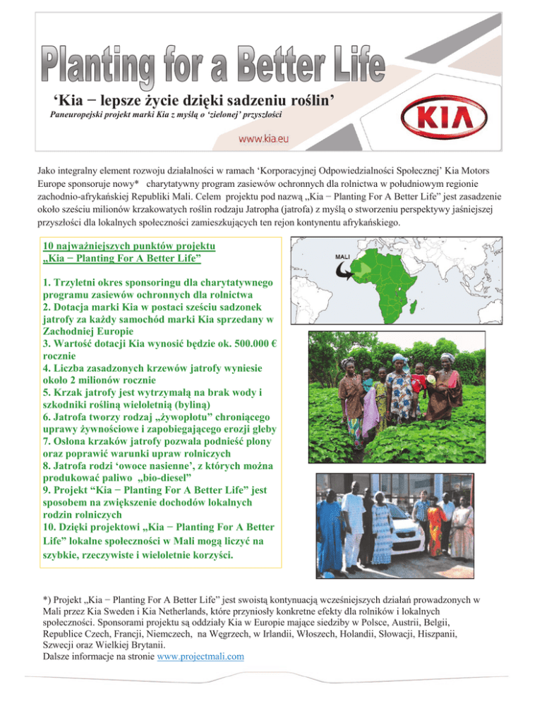 „Kia − lepsze życie dzięki sadzeniu roślin‟ Paneuropejski projekt marki Kia z myślą o ‘zielonej’ przyszłości Jako integralny element rozwoju działalności w ramach ‘Korporacyjnej Odpowiedzialności Społecznej’ Kia Motors Europe sponsoruje nowy* charytatywny program zasiewów ochronnych dla rolnictwa w południowym regionie zachodnio-afrykańskiej Republiki Mali. Celem projektu pod nazwą „Kia − Planting For A Better Life” jest zasadzenie około sześciu milionów krzakowatych roślin rodzaju Jatropha (jatrofa) z myślą o stworzeniu perspektywy jaśniejszej przyszłości dla lokalnych społeczności zamieszkujących ten rejon kontynentu afrykańskiego. 10 najważniejszych punktów projektu „Kia − Planting For A Better Life” 1. Trzyletni okres sponsoringu dla charytatywnego programu zasiewów ochronnych dla rolnictwa 2. Dotacja marki Kia w postaci sześciu sadzonek jatrofy za każdy samochód marki Kia sprzedany w Zachodniej Europie 3. Wartość dotacji Kia wynosić będzie ok. 500.000 € rocznie 4. Liczba zasadzonych krzewów jatrofy wyniesie około 2 milionów rocznie 5. Krzak jatrofy jest wytrzymałą na brak wody i szkodniki rośliną wieloletnią (byliną) 6. Jatrofa tworzy rodzaj „żywopłotu” chroniącego uprawy żywnościowe i zapobiegającego erozji gleby 7. Osłona krzaków jatrofy pozwala podnieść plony oraz poprawić warunki upraw rolniczych 8. Jatrofa rodzi „owoce nasienne‟, z których można produkować paliwo „bio-diesel” 9. Projekt “Kia − Planting For A Better Life” jest sposobem na zwiększenie dochodów lokalnych rodzin rolniczych 10. Dzięki projektowi „Kia − Planting For A Better Life” lokalne społeczności w Mali mogą liczyć na szybkie, rzeczywiste i wieloletnie korzyści. *) Projekt „Kia − Planting For A Better Life” jest swoistą kontynuacją wcześniejszych działań prowadzonych w Mali przez Kia Sweden i Kia Netherlands, które przyniosły konkretne efekty dla rolników i lokalnych społeczności. Sponsorami projektu są oddziały Kia w Europie mające siedziby w Polsce, Austrii, Belgii, Republice Czech, Francji, Niemczech, na Węgrzech, w Irlandii, Włoszech, Holandii, Słowacji, Hiszpanii, Szwecji oraz Wielkiej Brytanii. Dalsze informacje na stronie www.projectmali.com