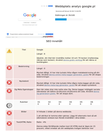 Webbplats analys google.pl Genereras på Februari 26 2017 23:46 PM Ställningen är 35/100 SEO Innehåll Titel Google Längd : 6 Idealisk, din titel bör innehålla mellan 10 och 70 tecken (mellanslag räknas som tecken). Använd denna gratis verktyg för att räkna ut textlängden. Beskrivning Längd : 0 Mycket dåligt. Vi har inte lyckats hitta någon metabeskrivning på din sida. Använd denna online meta-taggar generator, gratis för att skapa beskrivningar. Nyckelord Mycket dåligt. Vi har inte lyckats hitta några meta-taggar på din sida. Använd denna meta-tag generator, gratis för att skapa nyckelord. Og Meta Egenskaper Rubriker Bilder Den här sidan drar inte nytta utav Og. Deras taggar möjliggör sociala sökrobotar att bättre strukturera strukturera din sida. Använd denna og generatorn gratis för att skapa dom. H1 0 H2 0 H3 0 H4 0 H5 0 H6 0 Vi hittade 1 bilder på denna webbsida. 1 alt attribut är tomma eller saknas. Lägg till alternativ text så att sökmotorer enklare kan förstå innehållet i dina bilder. Text/HTML Ratio Ratio : 4% Denna sidas förhållande mellan text till HTML-kod är lägre än 15 procent, vilket innebär att din webbplats troligen behöver mer SEO Innehåll textinnehåll. Flash Iframe Perfekt, inga Flash-innehåll har upptäckts på denna sida. Bra, vi upptäckte inga Iframes på den här sidan. SEO Länkar URL Rewrite Mycket dåligt. Din adressfält innehåller frågesträngar. Understreck i URLen Vi har upptäckt understreck i din webbadress. Du bör hellre använda bindestreck för att optimera din SEO. In-page länkar Vi hittade totalt 19 länkar inklusive 0 länk(ar) till filer Statistics Externa Länkar : noFollow 0% Externa Länkar : Passing Juice 31.58% Interna Länkar 68.42% In-page länkar Anchor Typ Juice Grafika Interna Passing Juice Mapy Interna Passing Juice Play Externa Passing Juice YouTube Externa Passing Juice Wiadomości Interna Passing Juice Gmail Externa Passing Juice Dysk Externa Passing Juice Historia online Interna Passing Juice Ustawienia Interna Passing Juice In-page länkar Zaloguj się Externa Passing Juice Szukanie zaawansowane Interna Passing Juice Narzędzia językowe Interna Passing Juice Reklamuj się w Google Interna Passing Juice Rozwiązania dla firm Interna Passing Juice +Google Externa Passing Juice Wszystko o Google Interna Passing Juice Google.com Interna Passing Juice Prywatność Interna Passing Juice Warunki Interna Passing Juice SEO Nyckelord Nyckelord Moln szukanie google warunki narzędzia językowe rozwiązania polska się prywatność zaawansowane Nyckelord Konsistens Nyckelord Innehåll google 5 się 2 narzędzia 1 zaawansowane 1 szukanie 1 Titel Nyckelord Användbarhet Url Domän : google.pl Längd : 9 Beskrivnin g Rubriker Användbarhet Favikon Bra, din webbplats har en favicon. Utskriftbart Vi kunde inte hitta CSS för utskrifter. Språk Bra. Ditt angivna språk är pl. Dublin Core Denna sida drar inte nytta utav Dublin Core. Dokument Doctype HTML 5 Encoding Perfekt. Din deklarerade teckenuppsättning är UTF-8. W3C Validity Errors : 20 Varningar : 1 E-post Sekretess Bra! Ingen e-postadress har hittats i klartext. Föråldrad HTML Föråldrade taggar Förekomster <u> 1 <center> 1 Föråldrade HTML-taggar är HTML-taggar som inte längre används. Vi rekommenderar att du tar bort eller ersätter dessa eftersom dom nu är föråldrade. Hastighets Tips Utmärkt, din webbplats använder inga nästlade tabeller. Synd, din webbplats använder sig utav inline stilar. Bra, din webbplats har få CSS-filer. Perfekt, din webbplats har få Javascript filer Perfekt, din webbplats utnyttjar gzip. Mobil Mobiloptimering Apple Ikon Meta Viewport Tagg Flash innehåll Optimering XML Sitemap Bra, din webbplats har en XML sitemap. http://google.pl/sitemap.xml http://www.gstatic.com/culturalinstitute/sitemaps/www_google_co m_culturalinstitute/sitemap-index.xml http://www.gstatic.com/earth/gallery/sitemaps/sitemap.xml http://www.gstatic.com/s2/sitemaps/profiles-sitemap.xml https://www.google.com/sitemap.xml Robots.txt http://google.pl/robots.txt Bra, din webbplats har en robots.txt fil. Analytics Saknas Vi hittade inte någon analysverktyg på din webbplats. Webbanalys program kan mäta besökare på din webbplats. Du bör ha minst ett analysverktyg installerat, men det kan också vara en bra ide att installera två för att dubbelkolla uppgifterna. Powered by TCPDF (www.tcpdf.org)