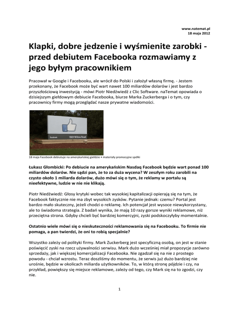 www.natemat.pl 18 maja 2012 Klapki, dobre jedzenie i wyśmienite zarobki przed debiutem Facebooka rozmawiamy z jego byłym pracownikiem Pracował w Google i Facebooku, ale wrócił do Polski i założył własną firmę. - Jestem przekonany, że Facebook może być wart nawet 100 miliardów dolarów i jest bardzo przyszłościową inwestycją - mówi Piotr Niedźwiedź z Clic Software. naTemat opowiada o dzisiejszym giełdowym debiucie Facebooka, biurze Marka Zuckerberga i o tym, czy pracownicy firmy mogą przeglądać nasze prywatne wiadomości. 18 maja Facebook debiutuje na amerykańskiej giełdzie • materiały promocyjne spółki Łukasz Głombicki: Po debiucie na amerykańskim Nasdaq Facebook będzie wart ponad 100 miliardów dolarów. Nie sądzi pan, że to za duża wycena? W zeszłym roku zarobili na czysto około 1 miliarda dolarów, dużo mówi się o tym, że reklamy w portalu są nieefektywne, ludzie w nie nie klikają. Piotr Niedźwiedź: Głosy krytyki wobec tak wysokiej kapitalizacji opierają się na tym, że Facebook faktycznie nie ma zbyt wysokich zysków. Pytanie jednak: czemu? Portal jest bardzo mało skuteczny, jeżeli chodzi o reklamę. Ich potencjał jest wysoce niewykorzystany, ale to świadoma strategia. Z badań wynika, że mają 10 razy gorsze wyniki reklamowe, niż przeciętna strona. Gdyby chcieli być bardziej komercyjni, zyski podskoczyłyby momentalnie. Ostatnio wiele mówi się o nieskuteczności reklamowania się na Facebooku. To firmie nie pomaga, a pan twierdzi, że oni to robią specjalnie? Wszystko zależy od polityki firmy. Mark Zuckerberg jest specyficzną osobą, on jest w stanie poświęcić zyski na rzecz używalności serwisu. Mark dużo wcześniej miał propozycje zarówno sprzedaży, jak i większej komercjalizacji Facebooka. Nie zgadzał się na nie z prostego powodu - chciał wzrostu. Teraz doszliśmy do momentu, że serwis już dużo bardziej nie urośnie, będzie w okolicach miliarda użytkowników. To, w którą stronę pójdzie i czy, na przykład, powiększy się miejsce reklamowe, zależy od tego, czy Mark się na to zgodzi, czy nie. 1 Więcej z działu "Pieniądze" Pamiętajmy, że oczywiście można zarabiać na reklamach, ale nie tylko. Facebook może iść w stronę pobierania prowizji od aplikacji w portalu. Apple ma swój AppStore, Facebook chce stworzyć swoją wersję takiego sklepu. Wydaje mi się, że Mark razem ze współpracownikami starają się nie iść na łatwiznę, nie powiększać reklam, tylko odkrywać nowe możliwości zarabiania. Pamiętajmy, że Facebook jest absolutnym liderem na rynku. Na początku Google Plus miał trochę ruchu, ale w tej chwili wiele się tam nie dzieje. Pracowałem w Facebooku i wiem, jakie mają pomysły, w którą stronę chcą iść. I w którą? Tego oczywiście nie mogę powiedzieć, ale, proszę mi wierzyć, dzięki tej mojej dodatkowej wiedzy jestem przekonany, że firma może być warta nawet 100 miliardów dolarów i jest bardzo przyszłościowa. Porównując FB do Google można powiedzieć, że wartość tego drugiego w głównej mierze jest w tym, co firma ma, stworzyła, osiągnęła, podczas gdy w przypadku Facebooka spora część tej wartości leży w perspektywach rozwoju. Proszę pomyśleć, jak pomocny mógłby być Facebook na przykład w dziedzinie medycyny. Serwis daje możliwości zbierania niewyobrażalnej ilości danych o ludziach. Gdyby do naszych profili dodać na przykład moduł „na co chorujesz”, albo „jakie masz ciśnienie krwi”, to statystyka zyskałaby nowe pole działania. Bardzo ciekawe wnioski można by z takich informacjach wysnuwać. Przecież nigdzie na świecie nie ma próbki do badania liczącej miliard osób. FB cały czas jest czymś zupełnie nowym. Pierwszy raz w historii mamy takie narzędzie i taką ilość danych. I na tym pewnie skupiać się będą koledzy z Kalifornii - na znajdowaniu nowych możliwości wykorzystania serwisu. Analitycy przewidują, że kurs Facebooka może dziś urosnąć o 10 proc. - 50 proc. Czy ta firma może stać się drugim Applem, który swoim inwestorom pozwala zarabiać kosmiczne pieniądze? Spekulować można dużo, każdy ma jakieś swoje wizje tego, jak będzie zachowywał się kurs. Prawda jest taka, że gdyby ktoś to wiedział, to by o tym nie mówił, tylko inwestował. Podchodzę z rezerwą do prognoz tego, o ile urośnie kurs podczas pierwszej sesji. Zwykle takie głosy mają więcej wspólnego z losowaniem, niż z rzetelną oceną. A nie boi się pan, że Facebook będzie kolejną bańką? Że kurs spółki nie będzie podążał za jej rozwojem, tylko ten rozwój przegoni i pobiegnie gdzieś, żeby się potem pięknie zawalić? Jest taka możliwość i sporo osób się tego boi. Facebook jest relatywnie bardzo małą firmą. Gdyby porównać liczbę pracowników z liczbą klientów, czy użytkowników, to FB jest absolutnym rekordzistą. Gdy tam pracowałem, firma zatrudniała około 6 tysięcy osób - stąd 2 obawa, że nie dadzą rady tak szybko wprowadzać zmian. Oczywiście oni cały czas zatrudniają, ale to jest inna skala. Google może sobie pozwolić na zatrudnienie 10 tysięcy osób, z Facebookiem jest trudniej, kwestia skali. W krótkiej perspektywie niedobór pracowników może być problemem, mogą nie nadążać za zapotrzebowaniem. 10 lat temu gdy ktoś napisał na blogu, że wyjechał na wakacje, to podnosił się krzyk - jak tak można, przecież to prywatne informacje. A w tej chwili na Facebooku dzielimy się nie tylko tym, co robimy, ale też gdzie i z kim. Na czym polega ten fenomen? Jak mamy jakiś autorytet, który zachowuje się w jakiś konkretny sposób, to za nim podążamy. Na początku Facebook był zamknięty, był uniwersytecką siecią społecznościową. Kiedy go otworzyli, wszyscy chcieli tam być, bo przecież studenci Harvardu są jednak dla wielu swego rodzaju „autorytetami”. Ludzie zakładali sobie konta, widzieli tam swoich znajomych, swoich przyjació