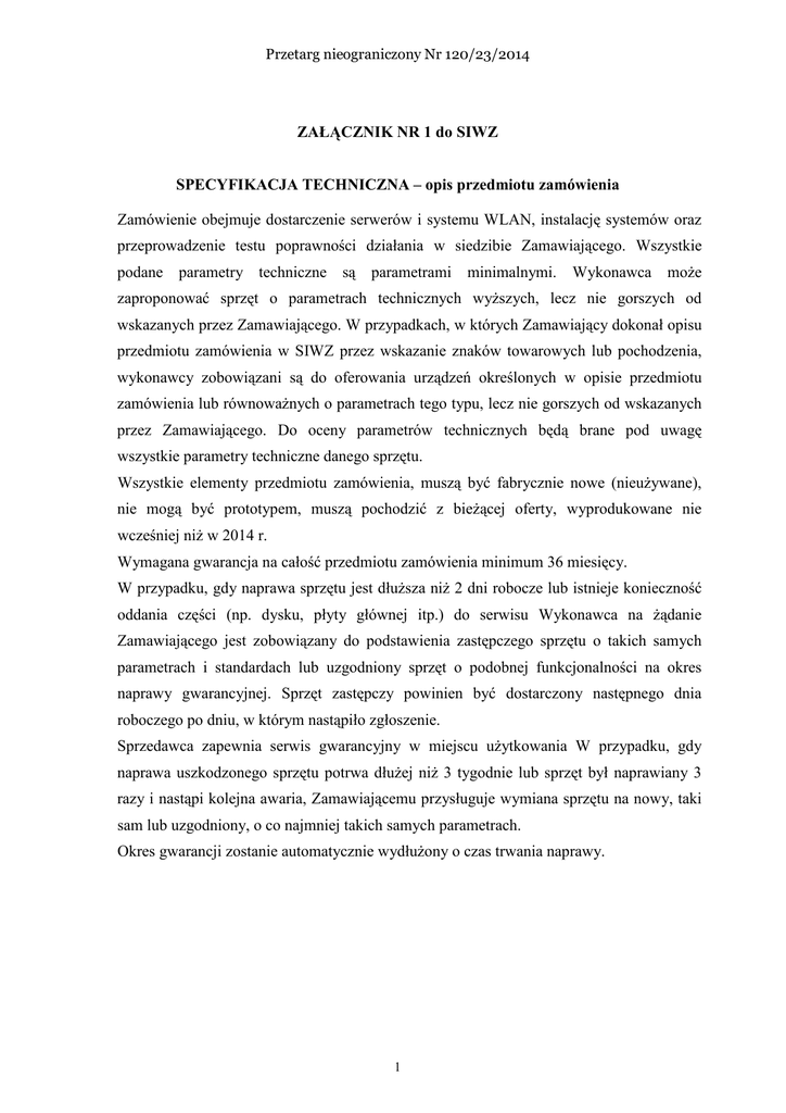 Przetarg nieograniczony Nr 120/23/2014 ZAŁĄCZNIK NR 1 do SIWZ SPECYFIKACJA TECHNICZNA – opis przedmiotu zamówienia Zamówienie obejmuje dostarczenie serwerów i systemu WLAN, instalację systemów oraz przeprowadzenie testu poprawności działania w siedzibie Zamawiającego. Wszystkie podane parametry techniczne są parametrami minimalnymi. Wykonawca może zaproponować sprzęt o parametrach technicznych wyższych, lecz nie gorszych od wskazanych przez Zamawiającego. W przypadkach, w których Zamawiający dokonał opisu przedmiotu zamówienia w SIWZ przez wskazanie znaków towarowych lub pochodzenia, wykonawcy zobowiązani są do oferowania urządzeń określonych w opisie przedmiotu zamówienia lub równoważnych o parametrach tego typu, lecz nie gorszych od wskazanych przez Zamawiającego. Do oceny parametrów technicznych będą brane pod uwagę wszystkie parametry techniczne danego sprzętu. Wszystkie elementy przedmiotu zamówienia, muszą być fabrycznie nowe (nieużywane), nie mogą być prototypem, muszą pochodzić z bieżącej oferty, wyprodukowane nie wcześniej niż w 2014 r. Wymagana gwarancja na całość przedmiotu zamówienia minimum 36 miesięcy. W przypadku, gdy naprawa sprzętu jest dłuższa niż 2 dni robocze lub istnieje konieczność oddania części (np. dysku, płyty głównej itp.) do serwisu Wykonawca na żądanie Zamawiającego jest zobowiązany do podstawienia zastępczego sprzętu o takich samych parametrach i standardach lub uzgodniony sprzęt o podobnej funkcjonalności na okres naprawy gwarancyjnej. Sprzęt zastępczy powinien być dostarczony następnego dnia roboczego po dniu, w którym nastąpiło zgłoszenie. Sprzedawca zapewnia serwis gwarancyjny w miejscu użytkowania W przypadku, gdy naprawa uszkodzonego sprzętu potrwa dłużej niż 3 tygodnie lub sprzęt był naprawiany 3 razy i nastąpi kolejna awaria, Zamawiającemu przysługuje wymiana sprzętu na nowy, taki sam lub uzgodniony, o co najmniej takich samych parametrach. Okres gwarancji zostanie automatycznie wydłużony o czas trwania naprawy. 1 Przetarg nieograniczony Nr 120/23/2014 CZĘŚĆ 1 Serwer Rack – 5 sztuk Komponent Obudowa Płyta główna Procesor Chipset Pamięć RAM Sloty PCI Express Karta graficzna Wbudowane porty Interfejsy sieciowe Kontroler dysków Wewnętrzna pamięć masowa Zasilacze Wentylatory Bezpieczeństwo Minimalne wymagania Obudowa Rack o wysokości maks. 2U z możliwością instalacji min. 24 dysków 2.5” Hot Plug wraz z kompletem wysuwanych szyn umożliwiających montaż w szafie rack i wysuwanie serwera do celów serwisowych oraz organizatorem kabli. Posiadająca dodatkowy przedni panel zamykany na klucz, chroniący dyski twarde przed nieuprawnionym wyjęciem z serwera. Płyta główna z możliwością zainstalowania do dwóch procesorów. Płyta główna musi być zaprojektowana przez producenta serwera i oznaczona jego znakiem firmowym. Dwa procesory ośmiordzeniowe klasy x86 dedykowane do pracy z zaoferowanym serwerem umożliwiające osiągnięcie wyniku min. 889 punktów w teście SPECint_rate_base2006 dostępnym na stronie www.spec.org w konfiguracji dwuprocesorowej. Do oferty należy załączyć wynik testu dla serwera z oferowanymi procesorami. Dedykowany przez producenta procesora do pracy w serwerach dwuprocesorowych 128 GB pamięci RAM typu LV RDIMM o częstotliwości pracy 1333MHz. Płyta powinna obsługiwać do 768GB pamięci RAM, na płycie głównej powinno znajdować się minimum 24 sloty przeznaczonych dla pamięci. Możliwe zabezpieczenia pamięci: Memory Rank Sparing, Memory Mirror, SBEC, Lockstep Funkcjonujące sloty PCI Express: - minimum trzy sloty x16 generacji 3 o prędkosci x8 niskoprofilowe - minimum jeden slot x16 generacji 3 o prędkości x8 - minimum dwa sloty x16 generacji 3 o prędkości x16 pełnej długości i wysokości Zintegrowana karta graficzna umożliwiająca rozdzielczość min. 1280x1024 min. 4 porty USB 2.0 , 2 porty RJ45, 2 porty VGA (1 na przednim panelu obudowy, drugi na tylnym), min. 1 port RS232 Minimum dwa interfejsy sieciowe 1Gb Ethernet w standardzie BaseT oraz dwa interfejsy sieciowe 10Gb Ethernet ze złączami w standardzie BaseT , interfejsy sieciowe nie mogą zajmować żadnego z dostępnych slotów PCI Express. Wsparcie dla protokołów iSCSI Boot oraz IPv6. Możliwość instalacji wymiennie modułów udostępniających: - dwa interfejsy sieciowe 1Gb Ethernet w standardzie BaseT oraz dwa interfejsy sieciowe 10Gb Ethernet ze złączami w standardzie SFP+ - cztery interfejsy sieciowe 1Gb Ethernet w standardzie BaseT - cztery interfejsy sieciowe 10Gb Ethernet w standardzie SFP+ Sprzętowy kontroler dyskowy, posiadający min. 1GB nieulotnej pamięci cache , możliwe konfiguracje poziomów RAID : 0, 1, 5, 6, 10, 50, 60 Możliwość instalacji dysków twardych SATA, SAS, NearLine SAS, SSD oraz samoszyfrujących dostępnych w aktualnej ofercie producenta serwera. Zainstalowane 8 dysków twardych o pojemności min. 146GB SAS 15k RPM każdy, skonfigurowane fabrycznie przez producenta serwera w dwa osobne poziomy zabezpieczeń RAID 5. Możliwość instalacji wewnętrznego modułu dedykowanego dla hypervisora wirtualizacyjnego, wyposażonego w 2 jednakowe nośniki typu flash z możliwoscią konfiguracji zabezpieczenia synchronizacji pomiędzy nośnikami z poziomu BIOS serwera, rozwiązanie nie może powodować zmiejszenia ilości wnęk na dyski twarde. Redundantne zasilacze Hot Plug o mocy maks. 750W każdy Minimum 6 redundantnych wentylatorów Hot-Plug Zintegrowany z płytą główną moduł TPM. Wbudowany czujnik otwarcia obudowy współpracujący z BIOS i kartą zarządzającą. 2 Przetarg nieograniczony Nr 120/23/2014 Karta zarządzająca Gwarancja Certyfikaty Dokumentacja Niezależna od zainstalowanego na serwerze systemu operacyjnego posiadająca dedykowane port RJ45 Gigabit Ethernet umożliwiająca: zdalny dostęp do graficznego interfejsu Web karty zarządzającej - zdalne monitorowanie i informowanie o sta