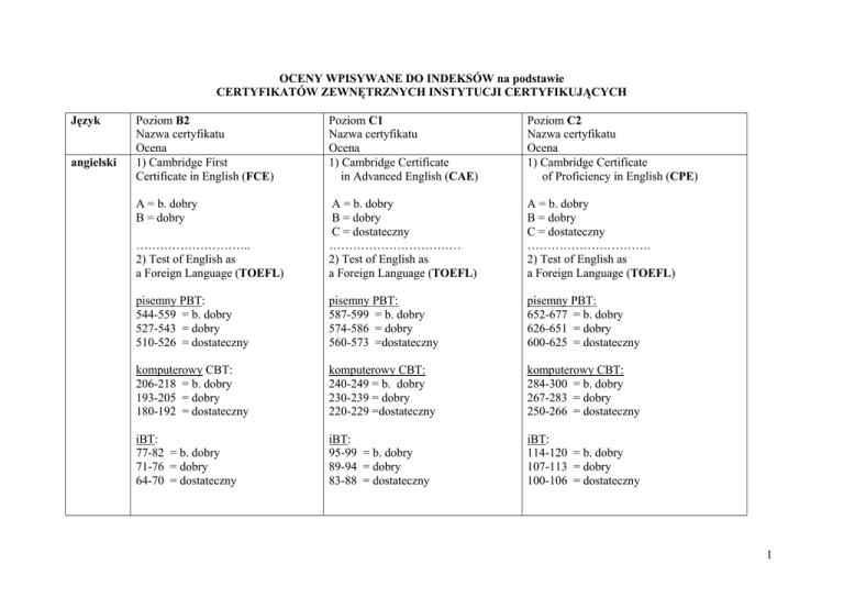 OCENY WPISYWANE DO INDEKSÓW na podstawie CERTYFIKATÓW ZEWNĘTRZNYCH INSTYTUCJI CERTYFIKUJĄCYCH Język angielski Poziom B2 Nazwa certyfikatu Ocena 1) Cambridge First Certificate in English (FCE) Poziom C1 Nazwa certyfikatu Ocena 1) Cambridge Certificate in Advanced English (CAE) Poziom C2 Nazwa certyfikatu Ocena 1) Cambridge Certificate of Proficiency in English (CPE) A = b. dobry B = dobry ……………………….. 2) Test of English as a Foreign Language (TOEFL) A = b. dobry B = dobry C = dostateczny …………………………… 2) Test of English as a Foreign Language (TOEFL) A = b. dobry B = dobry C = dostateczny …………………………. 2) Test of English as a Foreign Language (TOEFL) pisemny PBT: 544-559 = b. dobry 527-543 = dobry 510-526 = dostateczny pisemny PBT: 587-599 = b. dobry 574-586 = dobry 560-573 =dostateczny pisemny PBT: 652-677 = b. dobry 626-651 = dobry 600-625 = dostateczny komputerowy CBT: 206-218 = b. dobry 193-205 = dobry 180-192 = dostateczny komputerowy CBT: 240-249 = b. dobry 230-239 = dobry 220-229 =dostateczny komputerowy CBT: 284-300 = b. dobry 267-283 = dobry 250-266 = dostateczny iBT: 77-82 = b. dobry 71-76 = dobry 64-70 = dostateczny iBT: 95-99 = b. dobry 89-94 = dobry 83-88 = dostateczny iBT: 114-120 = b. dobry 107-113 = dobry 100-106 = dostateczny 1 3) Test of English for International (TOEIC) francuski 3) Test of English for International Communication Communication (TOEIC) ---------------- 837-879 = b. dobry 794-836 = dobry 750-793 = dostateczny 954-990 = b. dobry 917-953 = dobry 880-916 = dostateczny 1) Diplôme d’Etudes en Langue Française (DELF B2) 1) Diplôme Approfondi de la Langue 1) Diplôme Approfondi de la Langue Française (DALF C1) Française (DALF C2) 100-86 = b. dobry 85-70 = dobry 69-50 = dostateczny 100-86 = b. dobry 85-70 = dobry 69-50 = dostateczny 100-86 = b. dobry 85-70 = dobry 69-50 = dostateczny ……………………. …………………………… ………………………………. 2) Diplôme de Langue Française (DL) 2) Diplôme Superieur Française Modernes (DS) Tres bien = b. dobry Bien = dobry Ascez bien = dostat. Tres bien = b. dobry Bien = dobry Ascez bien = dosteteczny d’Etudes 2) Diplôme des Hautes Etudes Française (DHEF) Tres bien = b. dobry Bien = dobry Ascez bien = dostateczny 2 hiszpański Diploma de Español (Nivel Intermedio) (DELE) bardzo dobry niemiecki Diploma de Español (Nivel Superior) (DSE) _ 1)Zertifikat Deutsch Plus 3 (Goethe- 1) Zentrale Mittelstufenprüfung Zertifikat B2) (ZMP)/Goethe-Zertifikat C1 90-100 = b.dobry 75-89 = dobry 50-74 = dostateczny bardzo dobry 1) Zentrale Oberstufenprüfung (ZOP) 90-100 = b.dobry 75-89 = dobry 50-74 = dostateczny 90-100 = b. dobry 75-89 = dobry 50-74 = dostateczny ………………………... 2) Zertifikat Deutsch für den Beruf …………………………… …………………………. 2) Kleines Deutsches Sprachdiplom (KDS) 90-100 = b. dobry 75-89 = dobry 50-74 = dostateczny ……………………….. 3)Ősterreichisches Sprachdiplom DeutschMittelstufe -------------------------- 90-100 = b. dobry 75-89 = dobry 50-74 = dostateczny ………………………… 3) Ősterreichisches Sprachdiplom – Diplom Wirtschafssprache Deutsch 90-100 = b.dobry 75-89 = dobry 50-74 = dostateczny 90-100 = b.dobry 75-89 = dobry 50-74 = dostateczny …………………………… 3) Ősterreichisches Sprachdiplom DeutschOberstufe C1 90-100 = b. dobry 75-89 = dobry 50-74 = dostateczny 3 rosyjski 1)TRKI 2 (TORFL 2) 1)TRKI 3 (TORFL 3) 1) TRKI 4 (TORFL 4) 92-100% = b. dobry 84-91% = dobry plus 76-83% = dobry 68-75% = dostateczny plus 60-67% = dostateczny 92-100% = b. dobry 84-91% = dobry plus 76-83% = dobry 68-75% = dostateczny plus 60-67% = dostateczny 92-100% = b. dobry 84-91% = dobry plus 76-83% = dobry 68-75% = dostateczny plus 60-67% = dostateczny ……………………… …………………………… …………………………. 2) Russkij jazyk povsednevnogo 2) Russkij jazyk povsednevnogo 2)Russkij jazyk povsednevnogo obščenija obščenija - postporogovyj uroven obščenija - uroven professionalnogo uroven nositela języka (mastery) (vantage) vladenija (effective operational proficiency) 92-100% = b. dobry 84-91% = dobry plus 76-83% = dobry 68-75% = dostateczny plus 60-67% = dostateczny 92-100% = b. dobry 84-91% = dobry plus 76-83% = dobry 68-75% = dostateczny plus 60-67% = dostateczny 92-100% = b. dobry 84-91% = dobry plus 76-83% = dobry 68-75% = dostateczny plus 60-67% = dostateczny ……………………….. ………………………….. ………………………… 3) Russkij jazyk. Delovoje obščenije. 3) Russkij jazyk. Delovoje obščenije. Biznes. Kommercija. Srednij Biznes. Kommercija. Prodvinutyj (vantage) (effective operational proficiency) 92-100% = b. dobry 84-91% = dobry plus 76-83% = dobry 68-75% = dostateczny plus 60-67% = dostateczny 92-100% 84-91% 76-83% 68-75% 60-67% = b. dobry = dobry plus = dobry = dostateczny plus = dostateczny ---------------------- 4 włoski Certificato di Conoscenza della Certificato di Conoscenza Lingua Italiana – Livello 3 (CELI 3) Lingua Italiana – Livello 4 (CELI 4) A = b. dobry B = dobry C = dostateczny A = b. dobry B = dobry C = dostateczny della Certificato di Conoscenza della Lingua Italiana – Livello 5 (CELI 5) A = b. dobry B = dobry C = dostateczny 5