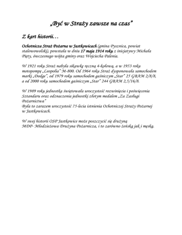 „Być w Straży zawsze na czas” Z kart historii… Ochotnicza Straż Pożarna w Jastkowicach (gmina Pysznica, powiat stalowowolski), powstała w dniu 17 maja 1914 roku z inicjatywy Michała Pięty, ówczesnego wójta gminy oraz Wojciecha Palenia. W 1921 roku Straż nabyła sikawkę ręczną 4-kołową, a w 1953 roku motopompę „Leopolia” M-800. Od 1964 roku Straż dysponowała samochodem marki „Dodge”, od 1979 roku samochodem gaśniczym „Star” 25 GBAM 2/8/8, a od 2000 roku samochodem gaśniczym „Star” 244 GBAM 2,5/16/8. W 1989 roku jednostka świętowała uroczystość rozwinięcia i poświęcenia Sztandaru oraz odznaczenia jednostki złotym medalem „Za Zasługi Pożarnictwa” Była to zarazem uroczystość 75-lecia istnienia Ochotniczej Straży Pożarnej w Jastkowicach. W swej historii OSP Jastkowice może poszczycić się drużyną MDP- Młodzieżowa Drużyna Pożarnicza, i to zarówno żeńską jak i męską. Aktualnie Straż zrzesza 42 członków, w tym 8 honorowych. L.p. 1. 2. 3. 4. 5. 6. 7. 8. 9. 10. 11. 12. 13. 14. 15. 16. 17. 18. 19. 20. 21. 22. 23. 24. 25. 26. 27. 28. 29. 30. 31. 32. 33. 34. Imię i nazwisko Bajdas Paweł Bajdas Robert Bajdas Tadeusz Bielecki Bogdan Buława Krzysztof Cholewiński Zygmunt Czubat Mirosław Joachim Marek Kaczkowski Łukasz Kapuściński Sławomir Kara Bartłomiej Kowal Jan Lebioda Andrzej Lebioda Łukasz Lebioda Robert Madej Adam Maślach Rudolf Maślach Wiesław Mierzwa Krzysztof Mierzwa Mateusz Miklus Wiesław Mudy Jan Nowak Marcin Paleń Adam Paleń Henryk Pasztaleniec Adam Pasztaleniec Jacek Pasztaleniec Tomasz Rodzeń Marek Rodzeń Paweł Rodzeń Robert Skrzypek Krzysztof Skrzypek Robert Starzec Sławomir Wstąpienie do OSP J-ce 2004 r. 1997 r. ? 2008 r. 1997 r. 2005 r. 2008 r. 1984 r. 2004 r. 2007 r. 2007 r. 2006 r. 1984 r. 2007 r. 1992 r. 2001 r. 1980 r. 1992 r. 2006 r. 2007 r. 2004 r. 1972 r. 2007 r. 1995 r. 1976 r. 1968 r. 2003 r. 2004 r. 1993 r. 1999 r. ? 1992 r. 2004 r. 2002 r. 35. 36. 37. 38. 39. 40. 41. 42. Stelmach Tomasz Stępień Józef Szkutnik Mariusz Szkutnik Sławomir Trybel Piotr Wołoszyn Piotr Wołoszyn Waldemar Żelazko Zbigniew W tym Honorowi: Edward Wojnicki- 40 lat w OSP J-ce Mieczysław Bielecki- 50 lat w OSP J-ce Edward Dziura- 45 lat w OSP J-ce Henryk Ludian- 40 lat w OSP J-ce Jan Małek- 40 lat w OSP J-ce Józef Paleń- 40 lat w OSP J-ce Stanisław Pyz- 40 lat w OSP J-ce Emil Trybel- 50 lat w OSP J-ce Aktualny Zarząd jednostki OSP Jastkowice to: Gospodarz: Marek Rodzeń Prezes: Wiesław Miklus Wiceprezes: Zygmunt Cholewiński Skarbnik: Waldemar Wołoszyn Wiceprezes- Naczelnik: Krzysztof Mierzwa Zastępca Naczelnika: Robert Skrzypek Sekretarz: Krzysztof Skrzypek Członek Zarządu: Mirosław Czubat W zdrowym ciele- zdrowy duch… 2004 r. 1981 r. 2001 r. 2004 r. 2006 r. 2005 r. 2001 r. 1995 r. OSP Jastkowice może pochwalić się czynnym udziałem w zawodach sportowopożarniczych. Do wydarzeń tych zaliczyć możemy: 1979 r. w Trześni 1990 r. w Jastkowicach 1992 r. w Pysznicy 1993 r. w Jeżowym 1994 r. w Krzeszowie OSP Jastkowice zajęła 1 miejsce 1994 r. w Kłyżowie 2000 r. w Kotowej Woli OSP Jastkowice zajęła 3 miejsce 17.09.2006 r. w Przyszowie- Zapuściu OSP Jastkowice zajęła 8 miejsce 23.09.2007 r. w Przyszowie- Zapuściu OSP Jastkowice zajęła 4 miejsce 07.09.2008 r. w Lipe OSP Jastkowice zajęła 8 miejsce 13.09.2009 r. w Przyszowie- Zapuściu OSP Jastkowice zajęła 2 miejsce oraz Superpuchar Komendanta Powiatowego PSP w Stalowej Woli st.bryg. Tadeusza Niedziałka. Jak podkreślają sami Strażacy wola walki jest najważniejsza, nie mniej jednak nie przywiązują wagi do przegranej, bo za rok zawsze można stanąć ponownie do boju i walczyć o nowe trofea. Z życia Jednostki… OSP Jastkowice chętnie bierze udział w akcjach promocyjnych zarówno miejscowość Jastkowice jak i całą Gminę Pysznica. Jedną z takich okazji był udział w pikniku gminnym „Dni Rodziny” odbywającym się w dniach 9-11.06.2006 r. na terenie gminy. W czasie jego trwania jednostka dała pokaz ratowania rannych z przygniecionego samochodu oraz zabezpieczanie wraku samochodu przed zapaleniem. Pokaz był symulacją wypadku, miał za zadanie uświadomić niebezpieczeństwo, jakie powstaje przy nierównej walce człowieka z siłami natury. Pokaz był niezwykle efektowny oraz wykonany bardzo profesjonalnie, cieszył się też dużą oglądalnością. Ponadto Strażacy z Jastkowice są jak to się mówi: „i do tańca i do różańca”. Dowodem na to może, być fakt, iż od wielu lat przy okazji Świąt Wielkanocnych pełnią straż przy grobie Pana Jezusa. Tradycją stało się, iż po trzydniowej służbie wszyscy, którzy pełnili straż, po Rezurekcji udają się na barszcz przygotowany specjalnie dla nich- w nagrodę za zaangażowanie w życie społeczności lokalnej. Kolejnym wydarzeniem, w którym brała czynny udział Jednostka to Peregrynacja Matki Bożej w Świętym Wizerunku Nawiedzenia, które odbyło się 23-24 czerwca 2009 roku w Jastkowicach. Strażacy z godnością i czcią przywitali Matkę Bożą w Jej Świętym Wizerunku, towarzyszyli jej na każdym kroku do kościoła parafialnego oraz dbali o to, aby przeżyć te jakże krótkie chwile w podniosłej atmosferze. Dowodem na to są piękne fotografie przedstawiające strażaków niosących Sztandar oraz Najświętszy Obraz. Warto również wspomnieć o tych, którzy dbali o bezpieczeństwo całej parafii stojąc na straży ulic. To piękne wydarzenie na zawsze pozostanie w naszej pamięci. Jastkowice, ul. Armii Krajowej 20… Siedzibą Ochotniczej Straży Pożarnej w Jastkowicach, jest Remiza mieszcząca się w centrum miejscowości. Nie bez przyczyny stoi w zaszczytnym miejscu- kiedyś to dzięki niej wielu ludzi uratowało dorobek swojego życia. To w niej koncentruje się życie strażaków- ochotników. Tutaj druhowie spotykają się w ważniejszych sprawach dotyczących funkcjonowania jednostki. Mają oni do dyspozycji 2 garaże-