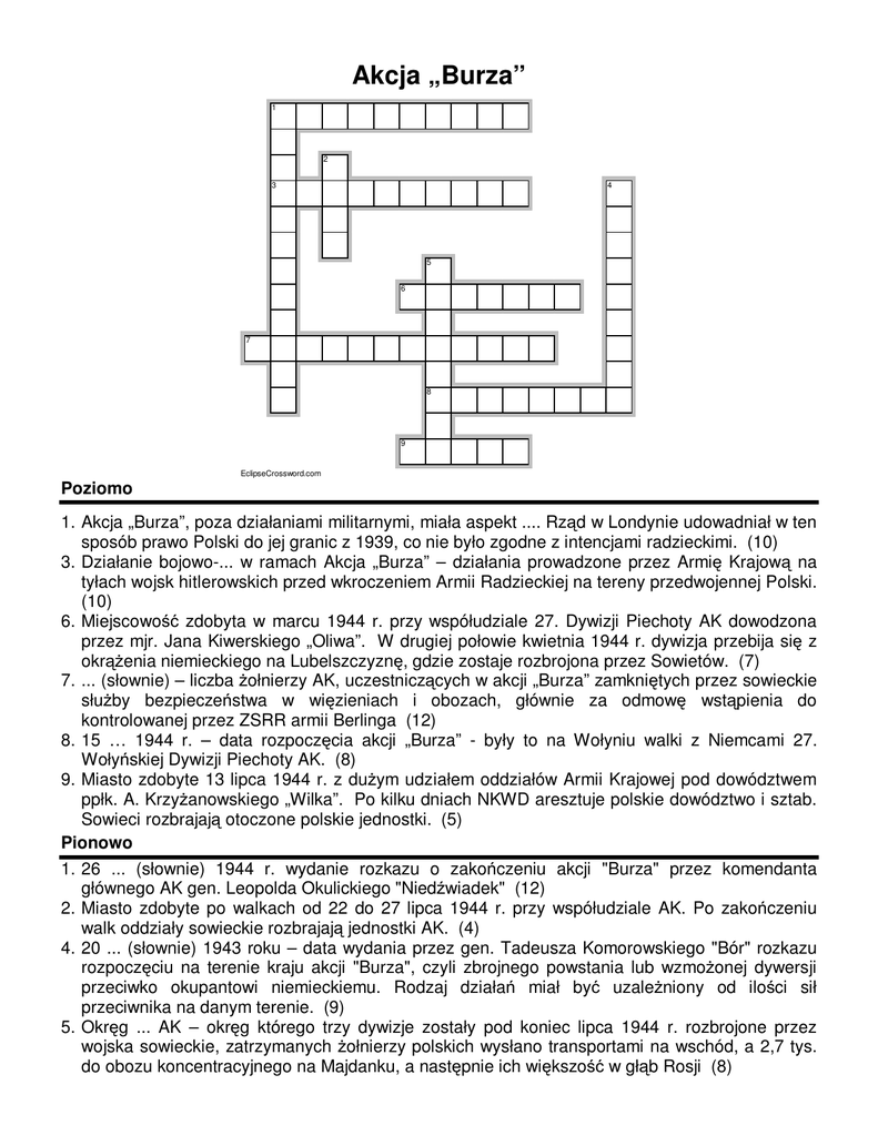 Akcja „Burza” 1 2 3 4 5 6 7 8 9 EclipseCrossword.com Poziomo 1. Akcja „Burza”, poza działaniami militarnymi, miała aspekt .... Rząd w Londynie udowadniał w ten sposób prawo Polski do jej granic z 1939, co nie było zgodne z intencjami radzieckimi. (10) 3. Działanie bojowo-... w ramach Akcja „Burza” – działania prowadzone przez Armię Krajową na tyłach wojsk hitlerowskich przed wkroczeniem Armii Radzieckiej na tereny przedwojennej Polski. (10) 6. Miejscowość zdobyta w marcu 1944 r. przy współudziale 27. Dywizji Piechoty AK dowodzona przez mjr. Jana Kiwerskiego „Oliwa”. W drugiej połowie kwietnia 1944 r. dywizja przebija się z okrąŜenia niemieckiego na Lubelszczyznę, gdzie zostaje rozbrojona przez Sowietów. (7) 7. ... (słownie) – liczba Ŝołnierzy AK, uczestniczących w akcji „Burza” zamkniętych przez sowieckie słuŜby bezpieczeństwa w więzieniach i obozach, głównie za odmowę wstąpienia do kontrolowanej przez ZSRR armii Berlinga (12) 8. 15 … 1944 r. – data rozpoczęcia akcji „Burza” - były to na Wołyniu walki z Niemcami 27. Wołyńskiej Dywizji Piechoty AK. (8) 9. Miasto zdobyte 13 lipca 1944 r. z duŜym udziałem oddziałów Armii Krajowej pod dowództwem ppłk. A. KrzyŜanowskiego „Wilka”. Po kilku dniach NKWD aresztuje polskie dowództwo i sztab. Sowieci rozbrajają otoczone polskie jednostki. (5) Pionowo 1. 26 ... (słownie) 1944 r. wydanie rozkazu o zakończeniu akcji "Burza" przez komendanta głównego AK gen. Leopolda Okulickiego "Niedźwiadek" (12) 2. Miasto zdobyte po walkach od 22 do 27 lipca 1944 r. przy współudziale AK. Po zakończeniu walk oddziały sowieckie rozbrajają jednostki AK. (4) 4. 20 ... (słownie) 1943 roku – data wydania przez gen. Tadeusza Komorowskiego "Bór" rozkazu rozpoczęciu na terenie kraju akcji "Burza", czyli zbrojnego powstania lub wzmoŜonej dywersji przeciwko okupantowi niemieckiemu. Rodzaj działań miał być uzaleŜniony od ilości sił przeciwnika na danym terenie. (9) 5. Okręg ... AK – okręg którego trzy dywizje zostały pod koniec lipca 1944 r. rozbrojone przez wojska sowieckie, zatrzymanych Ŝołnierzy polskich wysłano transportami na wschód, a 2,7 tys. do obozu koncentracyjnego na Majdanku, a następnie ich większość w głąb Rosji (8)