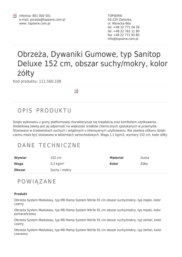 infolinia: 801 000 501 e-mail: [email protected] www: topserw.com.pl TOPSERW 05-220 Zielonka, ul. Marecka 66a tel. +48 22 771 04 56 tel. +48 22 761 11 80 fax +48 22 771 93 80 [email protected] Obrzeża, Dywaniki Gumowe, typ Sanitop Deluxe 152 cm, obszar suchy/mokry, kolor żółty Kod produktu: 111.560.108 OPIS PRODUKTU Dzięki wykonaniu z gumy platformowej charakteryzuje się trwałością oraz komfortem użytkowania.. Dodatkową zaletą jest jej odporność na większość środków chemicznych spotykanych w przemyśle. Stosowana w środowiskach suchych i wilgotnych o intensywnym użytkowaniu. Nie zawiera silikonu dzięki czemu może być stosowana w lakierniach samochodowych. Waga 1,1 kg/m2, wymiary 152 cm, kolor żółty. DANE TECHNICZNE Wymiar 152 cm Materiał Guma Waga 0,3 kg/m² Kolor Żółty Obszar Suchy / mokry POWIĄZANE Produkt Obrzeża System Modułowy, typ MD Ramp System Nitrile 91 cm obszar suchy/mokry, typ męski, kolor czarny Obrzeża System Modułowy, typ MD Ramp System Nitrile 91 cm obszar suchy/mokry, typ męski, kolor pomarańczowy Obrzeża System Modułowy, typ MD Ramp System Nitrile 91 cm obszar suchy/mokry, typ żeński, kolor czarny Obrzeża System Modułowy, typ MD Ramp System Nitrile 91 cm obszar suchy/mokry, typ żeński, kolor czerwony Obrzeża System Modułowy, typ MD Ramp System Nitrile 91 cm obszar suchy/mokry, typ żeński, kolor żółty Obrzeża System Modułowy, typ MD Ramp System Nitrile 152 cm obszar suchy/mokry, typ męski, kolor żółty Obrzeża System Modułowy, typ MD Ramp System Nitrile 152 cm obszar suchy/mokry, typ męski, kolor pomarańczowy Obrzeża, Dywaniki Gumowe, typ Sanitop Deluxe 91 cm, obszar suchy/mokry, kolor żółty Obrzeża, Dywaniki Gumowe, typ Sanitop Deluxe 152 cm, obszar suchy/mokry, kolor żółty Obrzeża, Dywaniki Gumowe, typ Sanitop Deluxe mb, obszar suchy/mokry, kolor żółty Obrzeża System Modułowy, typ MD Ramp System Nitrile 91 cm obszar suchy/mokry, typ męski, kolor czerwony Obrzeża Dywaniki, typ Diamond Flex-Lok 152 cm obszar suchy/mokry/zaolejony, typ męski, kolor żółty Obrzeża Dywaniki, typ Diamond Flex-Lok 152 cm obszar suchy/mokry/zaolejony, typ żeński, kolor żółty Obrzeża Dywaniki, typ Diamond Flex-Lok 91 cm obszar suchy/mokry/zaolejony, typ narożnik, kolor żółty