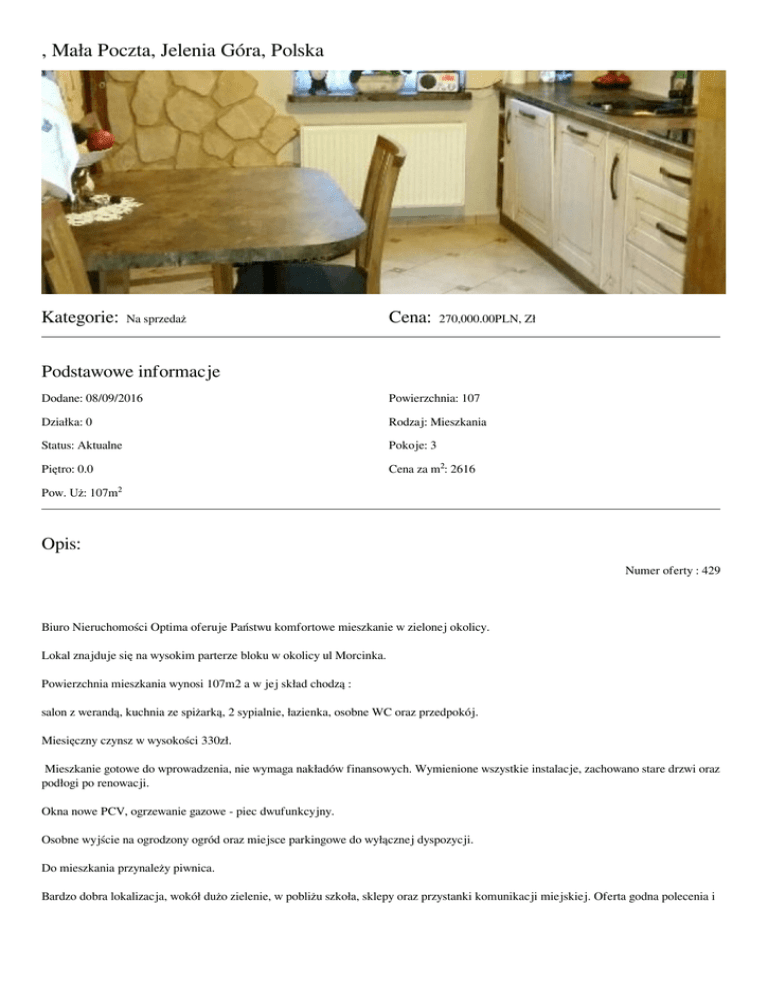 , Mała Poczta, Jelenia Góra, Polska Kategorie: Na sprzedaż Cena: 270,000.00PLN, Zł Podstawowe informacje Dodane: 08/09/2016 Powierzchnia: 107 Działka: 0 Rodzaj: Mieszkania Status: Aktualne Pokoje: 3 Piętro: 0.0 Cena za m²: 2616 Pow. Uż: 107m² Opis: Numer oferty : 429 Biuro Nieruchomości Optima oferuje Państwu komfortowe mieszkanie w zielonej okolicy. Lokal znajduje się na wysokim parterze bloku w okolicy ul Morcinka. Powierzchnia mieszkania wynosi 107m2 a w jej skład chodzą : salon z werandą, kuchnia ze spiżarką, 2 sypialnie, łazienka, osobne WC oraz przedpokój. Miesięczny czynsz w wysokości 330zł. Mieszkanie gotowe do wprowadzenia, nie wymaga nakładów finansowych. Wymienione wszystkie instalacje, zachowano stare drzwi oraz podłogi po renowacji. Okna nowe PCV, ogrzewanie gazowe - piec dwufunkcyjny. Osobne wyjście na ogrodzony ogród oraz miejsce parkingowe do wyłącznej dyspozycji. Do mieszkania przynależy piwnica. Bardzo dobra lokalizacja, wokół dużo zielenie, w pobliżu szkoła, sklepy oraz przystanki komunikacji miejskiej. Oferta godna polecenia i warta uwagi! Cena 270 000zł Zapraszam na prezentacje Klaudia Zakrzewska tel 667 418 979 Lokalizacja: okolice ul Morcinka: text/number Szczegóły: Dodatkowe informacje: weranda Piwnica oddzielna kuchnia miejsce parkingowe Powered by TCPDF (www.tcpdf.org)