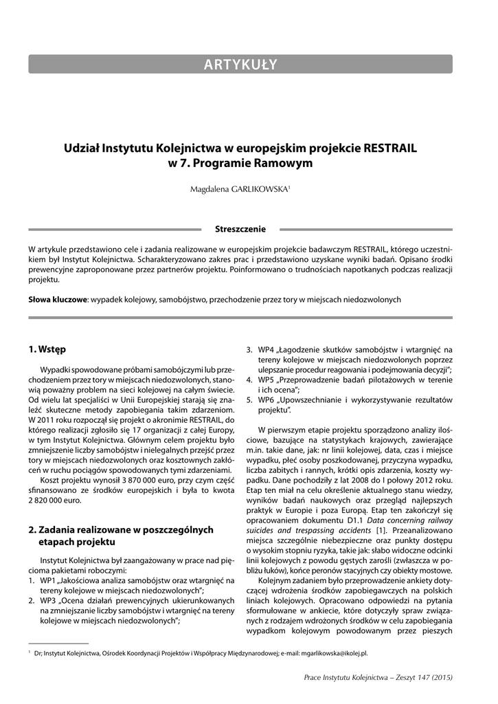 ARTYKUŁY Udział Instytutu Kolejnictwa w europejskim projekcie RESTRAIL w 7. Programie Ramowym Magdalena GARLIKOWSKA1 Streszczenie W artykule przedstawiono cele i zadania realizowane w europejskim projekcie badawczym RESTRAIL, którego uczestnikiem był Instytut Kolejnictwa. Scharakteryzowano zakres prac i przedstawiono uzyskane wyniki badań. Opisano środki prewencyjne zaproponowane przez partnerów projektu. Poinformowano o trudnościach napotkanych podczas realizacji projektu. Słowa kluczowe: wypadek kolejowy, samobójstwo, przechodzenie przez tory w miejscach niedozwolonych 1. Wstęp Wypadki spowodowane próbami samobójczymi lub przechodzeniem przez tory w miejscach niedozwolonych, stanowią poważny problem na sieci kolejowej na całym świecie. Od wielu lat specjaliści w Unii Europejskiej starają się znaleźć skuteczne metody zapobiegania takim zdarzeniom. W 2011 roku rozpoczął się projekt o akronimie RESTRAIL, do którego realizacji zgłosiło się 17 organizacji z całej Europy, w tym Instytut Kolejnictwa. Głównym celem projektu było zmniejszenie liczby samobójstw i nielegalnych przejść przez tory w miejscach niedozwolonych oraz kosztownych zakłóceń w ruchu pociągów spowodowanych tymi zdarzeniami. Koszt projektu wynosił 3 870 000 euro, przy czym część sfinansowano ze środków europejskich i była to kwota 2 820 000 euro. 2. Zadania realizowane w poszczególnych etapach projektu Instytut Kolejnictwa był zaangażowany w prace nad pięcioma pakietami roboczymi: 1. WP1 „Jakościowa analiza samobójstw oraz wtargnięć na tereny kolejowe w miejscach niedozwolonych”; 2. WP3 „Ocena działań prewencyjnych ukierunkowanych na zmniejszanie liczby samobójstw i wtargnięć na tereny kolejowe w miejscach niedozwolonych”; 1 3. WP4 „Łagodzenie skutków samobójstw i wtargnięć na tereny kolejowe w miejscach niedozwolonych poprzez ulepszanie procedur reagowania i podejmowania decyzji”; 4. WP5 „Przeprowadzenie badań pilotażowych w terenie i ich ocena”; 5. WP6 „Upowszechnianie i wykorzystywanie rezultatów projektu”. W pierwszym etapie projektu sporządzono analizy ilościowe, bazujące na statystykach krajowych, zawierające m.in. takie dane, jak: nr linii kolejowej, data, czas i miejsce wypadku, płeć osoby poszkodowanej, przyczyna wypadku, liczba zabitych i rannych, krótki opis zdarzenia, koszty wypadku. Dane pochodziły z lat 2008 do I połowy 2012 roku. Etap ten miał na celu określenie aktualnego stanu wiedzy, wyników badań naukowych oraz przegląd najlepszych praktyk w Europie i poza Europą. Etap ten zakończył się opracowaniem dokumentu D1.1 Data concerning railway suicides and trespassing accidents [1]. Przeanalizowano miejsca szczególnie niebezpieczne oraz punkty dostępu o wysokim stopniu ryzyka, takie jak: słabo widoczne odcinki linii kolejowych z powodu gęstych zarośli (zwłaszcza w pobliżu łuków), końce peronów stacyjnych czy obiekty mostowe. Kolejnym zadaniem było przeprowadzenie ankiety dotyczącej wdrożenia środków zapobiegawczych na polskich liniach kolejowych. Opracowano odpowiedzi na pytania sformułowane w ankiecie, które dotyczyły spraw związanych z rodzajem wdrożonych środków w celu zapobiegania wypadkom kolejowym powodowanym przez pieszych Dr; Instytut Kolejnictwa, Ośrodek Koordynacji Projektów i Współpracy Międzynarodowej; e-mail: [email protected]. Prace Instytutu Kolejnictwa – Zeszyt 147 (2015) M. Garlikowska 6 przechodzących przez tory w miejscach niedozwolonych. Należało wymienić stosowane w Polsce środki, ocenić ich koszty i efektywność, przedstawić organizację procesu wyjaśniającego wypadek od momentu jego zgłoszenia przez maszynistę do powstania protokołu z wypadku kolejowego. Po zrealizowaniu wymienionych zadań, przeprowadzono analizę działań prewencyjnych. Wyszczególniono działania prewencyjne (techniczne i inne) podejmowane przez PKP Polskie Linie Kolejowe S.A., ukierunkowane na zmniejszenie liczby samobójstw i wtargnięć na tereny kolejowe w miejscach niedozwolonych. Dokonano oceny tych działań. Na podstawie zgromadzonych danych dotyczących działań prewencyjnych stosowanych wśród państw europejskich, opracowano dokument D2.1&D3.1 Methods for the evaluation of measures targeted to prevent railway suicides and trespassing accidents [2]. W następnym etapie wybrano metody, które mogą przyczynić się do łagodzenia skutków zdarzeń spowodowanych samobójstwami lub wtargnięciami na tereny kolejowe w miejscach niedozwolonych. Wszystkie wyszczególnione metody (zarówno techniczne, jak i tzw. „miękkie”) poddano dyskusji z przedstawicielami zarządcy infrastruktury. Analiza metod technicznych skupiła się przede wszystkim na ochronie torów, wykrywaniu przypadków wtargnięć na tereny kolejowe oraz systemach ostrzegania osób przechodzących przez tory i potencjalnych samobójców. Analiza metod „miękkich” była zaadresowana do użytkowników dróg i kolei za pomocą przekazów komunikacyjnych (prewencja, kampanie reklamowe i ostrzegawcze). Określono procedury, zakres kontroli oraz monitoringu podczas wypadków oraz po wypadkach spowodowanych przez osoby popełniające lub chcące popełnić samobójstwo, a także przez osoby wkraczające na tereny kolejowe. Opracowano również procedury reagowania na rozmaite scenariusze zagrożeń spowodowanych samobójstwami oraz nielegalnym wkraczaniem na teren kolejowy. Instytut Kolejnictwa był zaangażowany w opracowanie zbioru pojęć, metod i procedur służących poprawie komunikacji pomiędzy operatorami kolejowymi, zarządcami infrastruktury, policją, strażą pożarną i innymi instytucjami reagującymi na sytuację zagrożenia. Instytut Kolejnictwa przeprowadził również prace dotyczące wyboru najlepiej rokujących metod służących ochronie terenów kolejowych przed samobójcami oraz nielegalnymi wtargnięciami na tereny kolejowe. Wybrane metody poddano testom pilotażowym w różny
