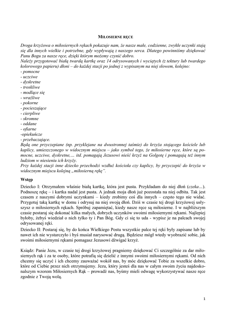 MIŁOSIERNE RĘCE Droga krzyżowa o miłosiernych rękach pokazuje nam, że nasze małe, codzienne, zwykłe uczynki stają się dla innych wielkie i potrzebne, gdy wypływają z naszego serca. Dlatego powinniśmy dziękować Panu Bogu za nasze ręce, dzięki którym możemy czynić dobro. Należy przygotować białą twardą kartkę oraz 14 odrysowanych i wyciętych (z tektury lub twardego kolorowego papieru) dłoni – do każdej stacji po jednej z wypisanym na niej słowem, kolejno: - pomocne - uczciwe - dyskretne - troskliwe - modlące się - wrażliwe - pokorne - pocieszające - cierpliwe - skromne - oddane - ofiarne -opiekuńcze - przebaczające. Będą one przyczepiane (np. przyklejane na dwustronnej taśmie) do krzyża stojącego kościele lub kaplicy, umieszczonego w widocznym miejscu – jako symbol tego, że miłosierne ręce, które są pomocne, uczciwe, dyskretne,… itd. pomagają Jezusowi nieść krzyż na Golgotę i pomagają też innym ludziom w niesieniu ich krzyży. Przy każdej stacji inne dziecko przechodzi wzdłuż kościoła czy kaplicy, by przyczepić do krzyża w widocznym miejscu kolejną „miłosierną rękę”. Wstęp Dziecko I: Otrzymałem właśnie białą kartkę, która jest pusta. Przykładam do niej dłoń (czeka…). Podnoszę rękę – i kartka nadal jest pusta. A jednak moja dłoń już pozostała na niej odbita. Tak jest czasem z naszymi dobrymi uczynkami – kiedy zrobimy coś dla innych – często tego nie widać. Przygotuj taką kartkę w domu i odrysuj na niej swoją dłoń. Dziś w czasie tej drogi krzyżowej usłyszysz o miłosiernych rękach. Spróbuj zapamiętać, kiedy nasze ręce są miłosierne. I w najbliższym czasie postaraj się dokonać kilka małych, dobrych uczynków swoimi miłosiernymi rękami. Najlepiej byłoby, żebyś wiedział o nich tylko ty i Pan Bóg. Gdy ci się to uda - wypisz je na palcach swojej odrysowanej ręki. Dziecko II: Postaraj się, by do końca Wielkiego Postu wszystkie palce tej ręki były zapisane lub by nawet ich nie wystarczyło i byś musiał narysować drugą. Będziesz mógł wtedy wyobrazić sobie, jak swoimi miłosiernymi rękami pomagasz Jezusowi dźwigać krzyż. Ksiądz: Panie Jezu, w czasie tej drogi krzyżowej pragniemy dziękować Ci szczególnie za dar miłosiernych rąk i za te osoby, które potrafią się dzielić z innymi swoimi miłosiernymi rękami. Od nich chcemy się uczyć i ich chcemy zauważać wokół nas, by móc dziękować Tobie za wszelkie dobro, które od Ciebie przez nich otrzymujemy. Jezu, który jesteś dla nas w całym swoim życiu najdoskonalszym wzorem Miłosiernych Rąk – prowadź nas, byśmy mieli odwagę wykorzystywać nasze ręce zgodnie z Twoją wolą. 1 Stacja I - Pan Jezus na śmierć skazany Dziecko podchodzi do krzyża ustawionego w widocznym miejscu i przyczepia do niego pierwszą dłoń z napisem: pomocne. I tak przy każdej kolejnej stacji. Aklamacja: Ksiądz: Klękam przed Tobą Jezu kochany, Wszyscy: Uwielbiam Twoje najświętsze rany. Śpiew: Jezu, ja przed Tobą, Twoja dłoń wzniesiona, Druga promieniami z serca otoczona, Tobie - z krzyża belką - ja w swojej podzięce Chcę dotknąć, przytulić …Miłosierne Ręce. Dziecko I: Jezu skazany na śmierć… dziękuję Ci za ręce tych kolegów, którzy nie skazują mnie na wyśmianie – klaszcząc, kiedy się pomylę albo mam inne zdanie. Dziękuję też za ręce kolegów, którzy potrafią dyskretnie pożyczyć mi farbę, nożyczki czy klej, gdy zapomnę zabrać na plastykę… I nie kpią, pokazując na palcach brzydkie znaki, ale zawsze służą pomocą i wsparciem. Dziecko II: Dziękujemy za miłosierne – pomocne ręce. Wszyscy powtarzają modlitwę. Wszyscy: Któryś za nas cierpiał rany… Stacja II – Pan Jezus bierze krzyż na swoje ramiona K: Klękam przed Tobą Jezu kochany, W: Uwielbiam Twoje najświętsze rany. Śpiew: Jezu, ja przed Tobą, Twoja dłoń wzniesiona… Dziecko I: Jezu, biorący krzyż na swoje ramiona… dziękuję Ci za to, że dajesz naszym rodzicom i bliskim siły potrzebne do pracy, do niesienia krzyża swoich obowiązków… Nieważne, czy jest to praca fizyczna, czyli praca rękami czy umysłowa. Dziękuję Ci za to, że pracują oni uczciwie, sumiennie i że takiej pracy mogę się od nich uczyć. Dziecko II: Dziękujemy za miłosierne – uczciwe ręce. Wszyscy powtarzają modlitwę. Wszyscy: Któryś za nas cierpiał rany… Stacja III – Pan Jezus upada pod krzyżem po raz pierwszy K: Klękam przed Tobą Jezu kochany, W: Uwielbiam Twoje najświętsze rany. Śpiew: Jezu, ja przed Tobą, Twoja dłoń wzniesiona… Dziecko I: Jezu, upadający pierwszy raz pod krzyżem… dziękuję Ci za ręce, które podnoszą mnie, gdy upadam – nawet w małych sprawach. Dziękuję za ręce kolegi, który nie wytyka mnie palcem, że znów coś źle napisałem i jestem najgorszy z polskiego, ale dyskretnie umie pokazać mi, gdzie mam błąd w zeszycie, żebym mógł go poprawić. Dziękuję za ręce kolegi, który nie zasłania dłonią zeszytu, gdy nie widzę czegoś na tablicy i nie mogę przepisać… A gdy jestem chory – przynosi mi swoje notatki. Dziecko II: Dziękujemy za miłosierne – dyskretne ręce. Wszyscy powtarzają modlitwę. Wszyscy: Któryś za nas cierpiał rany 2 Stacja IV – Pan Jezus spotyka swoją Matkę K: Klękam przed Tobą Jezu kochany, W: Uwielbiam Twoje najświętsze rany. Śpiew: Jezu, ja przed Tobą, Twoja dłoń wzniesiona… Dziecko I: Jezu, który spotykasz swoją Mamę… dziękuję Ci za ręce mojej mamy i mojego taty, którzy mnie pielęgnowali, gdy byłem niemowlakiem, ubierali i karmili, gdy sam tego jeszcze nie potrafiłem. Dziękuję za to, że ciągle troszczą się o mnie i dbają o moje dobro. Dziecko II: Dziękujemy za miłosierne - troskliwe ręce. Wszyscy powtarzają modlitwę. Wszyscy: Któryś za nas cierpiał rany… Stacja V – Pan Jezus przyjmuje pomoc Szymona K: Klękam przed Tobą Jezu kochany, W: Uwielbiam Twoje najświ