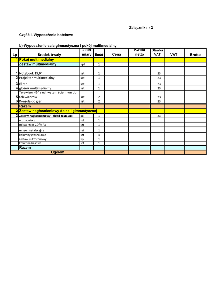 Załącznik nr 2 Część I- Wyposażenie hotelowe b)-Wyposażenie-sala gimnastyczna i pokój multimedialny Jedn miary Cena Lp Środek trwały Ilość 1 Pokój multimedialny Zestaw multimedialny kpl 1 1 Notebook 15,6" 2 Projektor multimedialny szt szt 3 Ekran szt 4 głośnik multimedialny szt Telewizor 46" z uchwytem ściennym do 5 telewizorów szt 6 Konsola do gier szt Razem 2 Zestaw nagłosnieniowy do sali gimnastycznej 2 Zestaw nagłośnieniowy - skład zestawu: kpl 23 23 1 1 23 23 2 2 23 23 23 szt szt 1 1 1 mikser instalacyjny kolumny głośnikowe zestaw mikrofonowy kolumna basowa szt szt kpl szt 1 4 1 1 Ogółem Stawka VAT 1 1 wzmacniacz odtwarzacz CD/MP3 Razem Kwota netto VAT Brutto