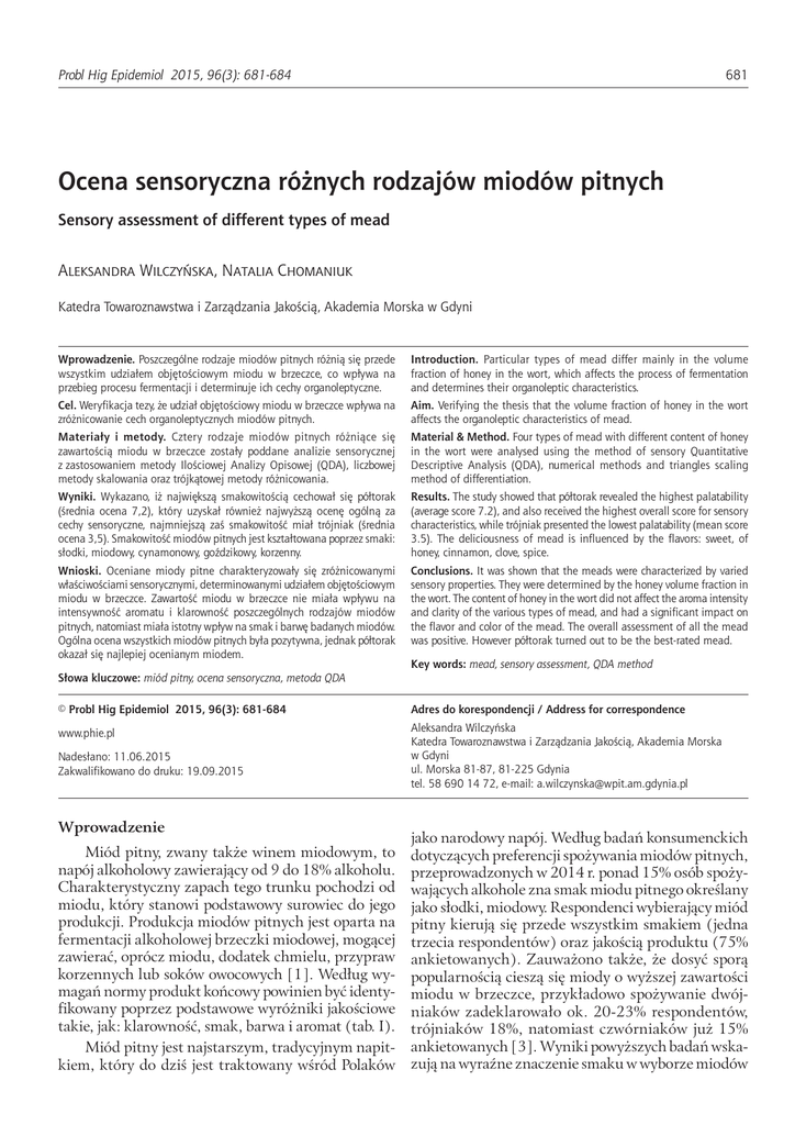 Wilczyńska Probl Hig Epidemiol A, Chomoniuk 2015,N.96(3): Ocena 681-684 sensoryczna różnych rodzajów miodów pitnych 681 Ocena sensoryczna różnych rodzajów miodów pitnych Sensory assessment of different types of mead Aleksandra Wilczyńska, Natalia Chomaniuk Katedra Towaroznawstwa i Zarządzania Jakością, Akademia Morska w Gdyni Wprowadzenie. Poszczególne rodzaje miodów pitnych różnią się przede wszystkim udziałem objętościowym miodu w brzeczce, co wpływa na przebieg procesu fermentacji i determinuje ich cechy organoleptyczne. Introduction. Particular types of mead differ mainly in the volume fraction of honey in the wort, which affects the process of fermentation and determines their organoleptic characteristics. Cel. Weryfikacja tezy, że udział objętościowy miodu w brzeczce wpływa na zróżnicowanie cech organoleptycznych miodów pitnych. Aim. Verifying the thesis that the volume fraction of honey in the wort affects the organoleptic characteristics of mead. Materiały i metody. Cztery rodzaje miodów pitnych różniące się zawartością miodu w brzeczce zostały poddane analizie sensorycznej z zastosowaniem metody Ilościowej Analizy Opisowej (QDA), liczbowej metody skalowania oraz trójkątowej metody różnicowania. Material & Method. Four types of mead with different content of honey in the wort were analysed using the method of sensory Quantitative Descriptive Analysis (QDA), numerical methods and triangles scaling method of differentiation. Wyniki. Wykazano, iż największą smakowitością cechował się półtorak (średnia ocena 7,2), który uzyskał również najwyższą ocenę ogólną za cechy sensoryczne, najmniejszą zaś smakowitość miał trójniak (średnia ocena 3,5). Smakowitość miodów pitnych jest kształtowana poprzez smaki: słodki, miodowy, cynamonowy, goździkowy, korzenny. Results. The study showed that półtorak revealed the highest palatability (average score 7.2), and also received the highest overall score for sensory characteristics, while trójniak presented the lowest palatability (mean score 3.5). The deliciousness of mead is influenced by the flavors: sweet, of honey, cinnamon, clove, spice. Wnioski. Oceniane miody pitne charakteryzowały się zróżnicowanymi właściwościami sensorycznymi, determinowanymi udziałem objętościowym miodu w brzeczce. Zawartość miodu w brzeczce nie miała wpływu na intensywność aromatu i klarowność poszczególnych rodzajów miodów pitnych, natomiast miała istotny wpływ na smak i barwę badanych miodów. Ogólna ocena wszystkich miodów pitnych była pozytywna, jednak półtorak okazał się najlepiej ocenianym miodem. Conclusions. It was shown that the meads were characterized by varied sensory properties. They were determined by the honey volume fraction in the wort. The content of honey in the wort did not affect the aroma intensity and clarity of the various types of mead, and had a significant impact on the flavor and color of the mead. The overall assessment of all the mead was positive. However półtorak turned out to be the best-rated mead. Key words: mead, sensory assessment, QDA method Słowa kluczowe: miód pitny, ocena sensoryczna, metoda QDA © Probl Hig Epidemiol 2015, 96(3): 681-684 www.phie.pl Nadesłano: 11.06.2015 Zakwalifikowano do druku: 19.09.2015 Wprowadzenie Miód pitny, zwany także winem miodowym, to napój alkoholowy zawierający od 9 do 18% alkoholu. Charakterystyczny zapach tego trunku pochodzi od miodu, który stanowi podstawowy surowiec do jego produkcji. Produkcja miodów pitnych jest oparta na fermentacji alkoholowej brzeczki miodowej, mogącej zawierać, oprócz miodu, dodatek chmielu, przypraw korzennych lub soków owocowych [1]. Według wymagań normy produkt końcowy powinien być identyfikowany poprzez podstawowe wyróżniki jakościowe takie, jak: klarowność, smak, barwa i aromat (tab. I). Miód pitny jest najstarszym, tradycyjnym napitkiem, który do dziś jest traktowany wśród Polaków Adres do korespondencji / Address for correspondence Aleksandra Wilczyńska Katedra Towaroznawstwa i Zarządzania Jakością, Akademia Morska w Gdyni ul. Morska 81-87, 81-225 Gdynia tel. 58 690 14 72, e-mail: [email protected] jako narodowy napój. Według badań konsumenckich dotyczących preferencji spożywania miodów pitnych, przeprowadzonych w 2014 r. ponad 15% osób spożywających alkohole zna smak miodu pitnego określany jako słodki, miodowy. Respondenci wybierający miód pitny kierują się przede wszystkim smakiem (jedna trzecia respondentów) oraz jakością produktu (75% ankietowanych). Zauważono także, że dosyć sporą popularnością cieszą się miody o wyższej zawartości miodu w brzeczce, przykładowo spożywanie dwójniaków zadeklarowało ok. 20-23% respondentów, trójniaków 18%, natomiast czwórniaków już 15% ankietowanych [3]. Wyniki powyższych badań wskazują na wyraźne znaczenie smaku w wyborze miodów 682 Probl Hig Epidemiol 2015, 96(3): 681-684 Tab. I. Wymagania podstawowych wyróżników jakościowych dla miodów pitnych [2] Table I. Requirements of basic quality parameters for mead [2] Miód pitny Cecha Stosunek części objętościowych miodu do wody półtorak dwójniak trójniak czwórniak 1 część miodu na 0,5 części wody 1 część miodu na 1 część wody 1 część miodu na 2 części wody 1 część miodu na 3 części wody Klarowność klarowny, bez opalizacji, zawiesin i osadów Barwa od zielono-słomkowej do złocistej, w trójniaku i dwójniaku do ciemno-bursztynowej, miody gronowe i owocowe mogą wykazywać odcienie barwy właściwej dla użytych soków Aromat miodowo-winny, w miodach owocowych i gronowych zharmonizowany z aromatem użytego soku, bez zapachów obcych Smak miodowo-winny, w miodach chmielowych, i korzennych z odcieniem chmielowym lub korzennym, w miodach gronowych i owocowych zharmonizowany ze smakiem użytego soku, bez posmaków obcych Weryfikacja tezy, że udział objętościowy 