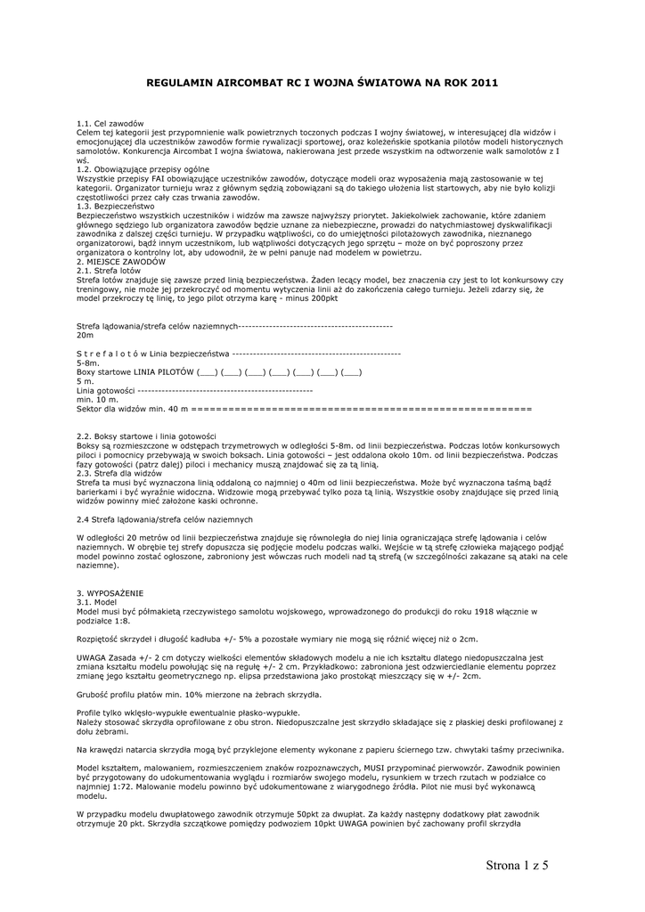 REGULAMIN AIRCOMBAT RC I WOJNA ŚWIATOWA NA ROK 2011 1.1. Cel zawodów Celem tej kategorii jest przypomnienie walk powietrznych toczonych podczas I wojny światowej, w interesującej dla widzów i emocjonującej dla uczestników zawodów formie rywalizacji sportowej, oraz koleżeńskie spotkania pilotów modeli historycznych samolotów. Konkurencja Aircombat I wojna światowa, nakierowana jest przede wszystkim na odtworzenie walk samolotów z I wś. 1.2. Obowiązujące przepisy ogólne Wszystkie przepisy FAI obowiązujące uczestników zawodów, dotyczące modeli oraz wyposażenia mają zastosowanie w tej kategorii. Organizator turnieju wraz z głównym sędzią zobowiązani są do takiego ułożenia list startowych, aby nie było kolizji częstotliwości przez cały czas trwania zawodów. 1.3. Bezpieczeństwo Bezpieczeństwo wszystkich uczestników i widzów ma zawsze najwyższy priorytet. Jakiekolwiek zachowanie, które zdaniem głównego sędziego lub organizatora zawodów będzie uznane za niebezpieczne, prowadzi do natychmiastowej dyskwalifikacji zawodnika z dalszej części turnieju. W przypadku wątpliwości, co do umiejętności pilotażowych zawodnika, nieznanego organizatorowi, bądź innym uczestnikom, lub wątpliwości dotyczących jego sprzętu – może on być poproszony przez organizatora o kontrolny lot, aby udowodnił, że w pełni panuje nad modelem w powietrzu. 2. MIEJSCE ZAWODÓW 2.1. Strefa lotów Strefa lotów znajduje się zawsze przed linią bezpieczeństwa. Żaden lecący model, bez znaczenia czy jest to lot konkursowy czy treningowy, nie może jej przekroczyć od momentu wytyczenia linii aż do zakończenia całego turnieju. Jeżeli zdarzy się, że model przekroczy tę linię, to jego pilot otrzyma karę - minus 200pkt Strefa lądowania/strefa celów naziemnych--------------------------------------------20m S t r e f a l o t ó w Linia bezpieczeństwa ------------------------------------------------5-8m. Boxy startowe LINIA PILOTÓW (___) (___) (___) (___) (___) (___) (___) 5 m. Linia gotowości --------------------------------------------------min. 10 m. Sektor dla widzów min. 40 m ======================================================= 2.2. Boksy startowe i linia gotowości Boksy są rozmieszczone w odstępach trzymetrowych w odległości 5-8m. od linii bezpieczeństwa. Podczas lotów konkursowych piloci i pomocnicy przebywają w swoich boksach. Linia gotowości – jest oddalona około 10m. od linii bezpieczeństwa. Podczas fazy gotowości (patrz dalej) piloci i mechanicy muszą znajdować się za tą linią. 2.3. Strefa dla widzów Strefa ta musi być wyznaczona linią oddaloną co najmniej o 40m od linii bezpieczeństwa. Może być wyznaczona taśmą bądź barierkami i być wyraźnie widoczna. Widzowie mogą przebywać tylko poza tą linią. Wszystkie osoby znajdujące się przed linią widzów powinny mieć założone kaski ochronne. 2.4 Strefa lądowania/strefa celów naziemnych W odległości 20 metrów od linii bezpieczeństwa znajduje się równoległa do niej linia ograniczająca strefę lądowania i celów naziemnych. W obrębie tej strefy dopuszcza się podjęcie modelu podczas walki. Wejście w tą strefę człowieka mającego podjąć model powinno zostać ogłoszone, zabroniony jest wówczas ruch modeli nad tą strefą (w szczególności zakazane są ataki na cele naziemne). 3. WYPOSAŻENIE 3.1. Model Model musi być półmakietą rzeczywistego samolotu wojskowego, wprowadzonego do produkcji do roku 1918 włącznie w podziałce 1:8. Rozpiętość skrzydeł i długość kadłuba +/- 5% a pozostałe wymiary nie mogą się różnić więcej niż o 2cm. UWAGA Zasada +/- 2 cm dotyczy wielkości elementów składowych modelu a nie ich kształtu dlatego niedopuszczalna jest zmiana kształtu modelu powołując się na regułę +/- 2 cm. Przykładkowo: zabroniona jest odzwierciedlanie elementu poprzez zmianę jego kształtu geometrycznego np. elipsa przedstawiona jako prostokąt mieszczący się w +/- 2cm. Grubość profilu płatów min. 10% mierzone na żebrach skrzydła. Profile tylko wklęsło-wypukłe ewentualnie płasko-wypukłe. Należy stosować skrzydła oprofilowane z obu stron. Niedopuszczalne jest skrzydło składające się z płaskiej deski profilowanej z dołu żebrami. Na krawędzi natarcia skrzydła mogą być przyklejone elementy wykonane z papieru ściernego tzw. chwytaki taśmy przeciwnika. Model kształtem, malowaniem, rozmieszczeniem znaków rozpoznawczych, MUSI przypominać pierwowzór. Zawodnik powinien być przygotowany do udokumentowania wyglądu i rozmiarów swojego modelu, rysunkiem w trzech rzutach w podziałce co najmniej 1:72. Malowanie modelu powinno być udokumentowane z wiarygodnego źródła. Pilot nie musi być wykonawcą modelu. W przypadku modelu dwupłatowego zawodnik otrzymuje 50pkt za dwupłat. Za każdy następny dodatkowy płat zawodnik otrzymuje 20 pkt. Skrzydła szczątkowe pomiędzy podwoziem 10pkt UWAGA powinien być zachowany profil skrzydła Strona 1 z 5 szczątkowego, niedopuszczalne jest zainstalowanie płaskiego kawałka deski. Oprofilowanie łącznika podwozia nie jest płatem i nie jest premiowane. Na skrzydłach musi być widoczny zarys żeber (jeżeli był widoczny w oryginale) zwany również fakturą skrzydła. Faktura skrzydła jest dodatkowo punktowana 30pkt. Uwaga - zarys żeber nie może być wykonany jako linie narysowane na skrzydłach! Przy zaznaczeniu zarysu żeber paskami z balsy bez miękkiego pokrycia (folii), nakładki powinny mieć grubość od 1 do 2 mm. Odległość pomiędzy paskami powinna być tak dobrana aby zarysy żeber w modelu odpowiadały ilości zarysów żeber w oryginale (zarysy półżeber nie są konieczne do uwidaczniania). Ilość żeber +/- 5szt w stosunku do oryginału. Dopuszcza się paski imitujące żebra tylko z górnej strony płatów. Ilość lotek powinna odpowiadać ilości lotek w oryginale. Wielkość lotek w modelu nie może odbiegać o +/- 2cm w stosu