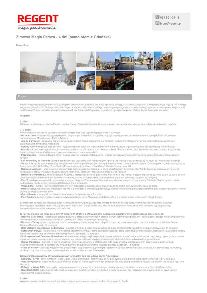 061 851-31-18 [email protected] Zimowa Magia Paryża - 4 dni (samolotem z Gdańska) Francja Paryż Program Paryż – nazywany stolicą mody i kultury, miastem zakochanych ,gdzie można zjeść wytworną kolację, a zarazem „zadowolić” się bagietką, która nigdzie nie smakuje tak jak w stolicy Francji. Żaden przewodnik nie jest w stanie oddać niesamowitego nastroju panującego podczas wieczornego spaceru w międzynarodowym tłumie na Champs Elysees, klimatu francuskich kawiarenek czy feerii świateł oglądanych podczas rejsu po Sekwanie, dlatego trzeba to przeżyć samemu! Program: 1 dzień: Odprawa na lotnisku i przelot do Paryża – stolicy Francji. Przejazd do hotelu. Zakwaterowanie, czas wolny lub zwiedzanie w zależności od godzin przylotu. 2 - 3 dzień: Kolejne dwa dni to czas na poznanie atmosfery miasta oraz jego najważniejszych miejsc, takich jak - Muzeum Luwr – najpiękniejszy paryski pałac z ogromnym Muzeum Sztuki, gdzie znajdują się najsłynniejsze światowe dzieła, takie jak Stela z Kodeksem Hammurabiego, Mona Lisa czy Pieta z Avinionu - Arc du Carrousel – Łuk został zaprojektowany na zlecenie cesarza Napoleona, wzorowany na łuku Konstantyna w Rzymie, upamiętniający wojskowe i dyplomatyczne zwycięstwa Napoleona - Ogrody Tuileries będące największymi i najdawniejszymi ogrodami w stylu francuskim w Paryżu, które w przeszłości otaczały rezydencję królów Francji - Plac de la Concorde z egipskim obeliskiem oraz dwiema dużymi fontannami - Fontanna Rzek i Fontanna Mórz, dodatkowo w narożnikach placu znajduje się osiem kobiecych posągów będących symbolami głównych miast francuskich - Pola Elizejskie – reprezentacyjna aleja Paryża z licznymi teatrami, restauracjami, kinami i ekskluzywnymi sklepami są miejscem często odwiedzanym przez turystów - Łuk Triumfalny na Placu de Gaulle'a zbudowany dla uczczenia tych, którzy walczyli i polegli za Francję w czasie rewolucji francuskiej i wojen napoleońskich - Wyspa Cite, gdzie obok najbardziej znanych średniowiecznych budynków, takich jak Katedra Notre Dame, Sainte Chapelle, Conciergerie, można zobaczyć także Palais de Justice, Hotel-Dieu, Pont-Neuf, la Prefecture oraz trzy skwery - Vert-Galant, l’Ile-de-France, Jana XIII - Dzielnica Łacińska – uniwersytecka część miasta, gdzie podziwiać można m.in. kompleks klasztorny benedyktynów Val-de-Grace, zamieniony po rewolucji francuskiej w szpital wojskowy, dawne opactwo Port-Royal, Kolegium Francuskie, Sorbonę oraz Panteon - Dzielnica Montmartre, gdzie na szczycie wzgórza, z którego roztacza się przepiękny widok na stolicę Francji, znajduje się słynna bazylika Sacre-Coeur, a poniżej pierwszy kościół żelbetowy Saint Jean de Montmartre, można tu zajrzeć także na najsłynniejszy paryski pchli targ i targowisko księgarzy - Plac Trocadero, nazwany tak na pamiątkę wygranej bitwy pod Trocadero w Hiszpanii, przy którym na wzgórzu znajduje się Palais de Chaillot, gdzie została podpisana w 1948 r. międzynarodowa Deklaracja Praw Człowieka - Wieża Eiffla – symbol Paryża, jest magnesem, który od początku swojego istnienia przyciąga do siebie miliony turystów z całego globu - Pola Marsowe, na których w przeszłości odbywały się ćwiczenia wojskowe, później wydarzenia rewolucyjne, próby lotów balonem oraz wystawy światowe, których główną atrakcją była wieża Eiffla - Opera Garnier – arcydzieło architektury i największy budynek opery w Europie - Plac Vendome będący symbolem ducha i stylu paryskiego, gdzie Napoleon poślubił Józefinę, a w jednej z kamienic zmarł Fryderyk Chopin W przerwach podczas zwiedzania proponujemy czas wolny na posiłek, podczas którego będzie możliwość spróbowania francuskich potraw, takich jak bouillabaisse, brandada, ratatouille, czy tarta tartin oraz suflet i creme brulee oraz skosztowania słynnych francuskich win, calvados, czy oryginalnego szampana(płatne indywidualnie wg zamówienia). W Paryżu znajduje się także wiele innych ciekawych atrakcji, z których można skorzystać fakultatywnie w zależności od czasu wolnego: - Bazylika Saint-Denis - imponująca gotycka bazylika z przepięknym wnętrzem przepełnionym zabytkowymi posągami i sarkofagami, będąca miejscem pochówku niemal wszystkich królów francuskich m.in. Ludwika XVI i Marii Antoniny (ok. 8 euro/os.) - Museum d’Orsay, gdzie znajdują się zbiory zawierające głównie sztukę francuską młodszą od tej prezentowanej w Luwrze, ale starszą od zbiorów Centre Georges Pompidou (ok. 15 euro/os.) - Rejs statkiem spacerowym po Sekwanie - świetna okazja do podziwiania zabytków i blasku świateł miasta z zupełnie innej perspektywy (ok. 14 euro/os.) - Katakumby Paryża - ciągnące się kilometrami podziemne korytarze, pełne szczątków ludzkich, gdzie Victor Hugo umieścił akcję „Nędzników”, a w czasie II wojny światowej spotykali się członkowie francuskiego ruchu oporu (ok. 16 euro/os.) - Shakespeare and Company Bookstore - wizyta w małej, magicznej księgarni jak z bajek, gdzie obok najróżniejszych książek znajdziemy piętro, gdzie znajduje się mini czytelnia, pianino oraz wygodne miejsca, aby usiąść i chłonąć atmosferę świątyni czytelnictwa (płatne indywidualnie wg zakupów) - Centre Pompidou - budynek, w którym mieści się m.in. muzeum sztuki współczesnej, z dziełami artystów reprezentujących głównie surrealizm, kubizm, ekspresjonizm i fowizm, a nowoczesny wygląd budynku pobudza wyobraźnię każdego zwiedzającego (ok. 14 euro/os.) - Stade de France - podczas wizyty można śledzić trasę, jaką przemierzają najwięksi sportowcy, poczuć atmosferę szatni, przejść tunel prowadzący na murawę, zamknąć oczy i poczuć emocje największych wydarzeń sportowych (ok. 15 euro/os.) Wieczorami proponujemy słynne paryskie rozrywki, które świetnie oddają ducha tego miasta: - Kabarety Paryża - słynne „Moulin Rouge”, „Lido”, któr