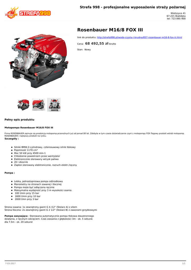 Strefa 998 - profesjonalne wyposażenie straży pożarnej Wietszyce 41 67-221 Białołęka tel: 723 895 900 Rosenbauer M16/8 FOX III link do produktu: http://strefa998.pl/woda-czysta-i-brudna/857-rosenbauer-m16-8-fox-iii.html Cena: 68 492,55 zł brutto Stan: Nowy Pełny opis produktu Motopompa Rosenbauer M16/8 FOX III Firma ROSENBAUER zajmuje się produkcją motopomp przenośnych już od ponad 80 lat. Zdobyte w tym czasie doświadczenie czyni z motopompy FOX flagowy produkt wśród motopomp ROSENBAUER i najlepszy produkt na rynku. Szczegóły : Silniki BMW,2-cylindrowy, czterosuwowy silnik tłokowy Pojemność 1170 cm³ Moc 50 kW przy 4500 min-1 Chłodzenie powietrzem przez wentylator Elektronicznie sterowany wtrysk paliwa 20 l zbiornik Zapłon sterowany elektronicznie, rozruch elektr./ręczny Pompa : Lekka, jednostopniowa pompa odśrodkowa Manometry na stronach sswanej i tłocznej Pompa może być odłączona ręcznie Maksymalna wydajność przy 3 m wysokości ssania: 100 l/min przy 15 bar 1600 l/min przy 10 bar 2000 l/mn przy 3 bar Strona ssawna: 1x zewnętrzny gwint G 4 /12" (Stolarz A) z sitem Strona tłoczna: 2x zewnętrzny gwint G 2 1/2" (Stolarz B) z zaworami grzybkowymi Pompa zasysająca : Sterowana automatycznie pompa tłokowa dwustronnego działania, z ręcznym odcięciem. Czas zassania z głębokości 3m - ok. 5 sekund. dla 7.5m - ok. 20 sekund 7-03-2017 1/1