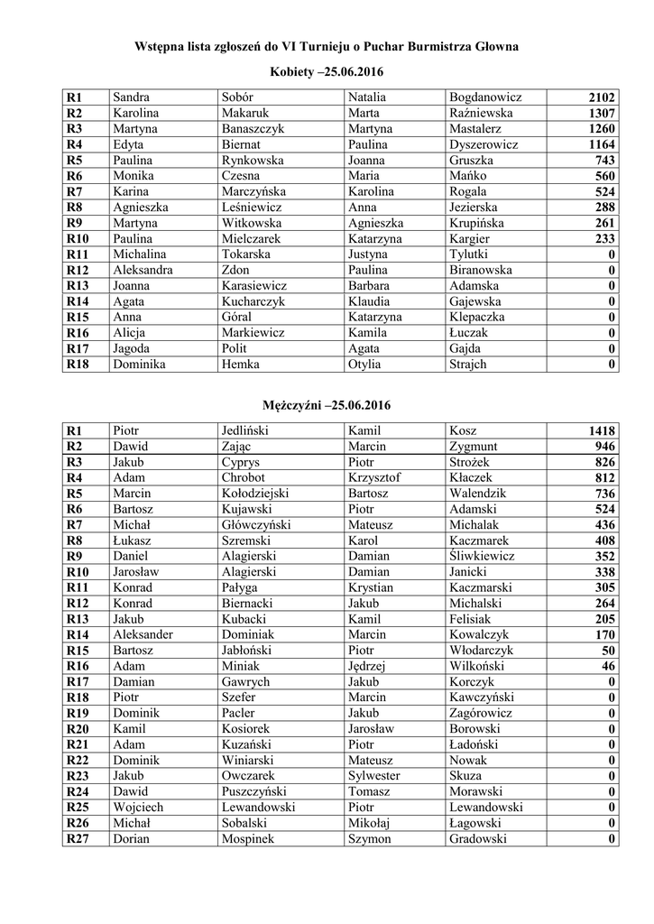 Wstępna lista zgłoszeń do VI Turnieju o Puchar Burmistrza Głowna Kobiety –25.06.2016 R1 R2 R3 R4 R5 R6 R7 R8 R9 R10 R11 R12 R13 R14 R15 R16 R17 R18 Sandra Karolina Martyna Edyta Paulina Monika Karina Agnieszka Martyna Paulina Michalina Aleksandra Joanna Agata Anna Alicja Jagoda Dominika Sobór Makaruk Banaszczyk Biernat Rynkowska Czesna Marczyńska Leśniewicz Witkowska Mielczarek Tokarska Zdon Karasiewicz Kucharczyk Góral Markiewicz Polit Hemka Natalia Marta Martyna Paulina Joanna Maria Karolina Anna Agnieszka Katarzyna Justyna Paulina Barbara Klaudia Katarzyna Kamila Agata Otylia Bogdanowicz Raźniewska Mastalerz Dyszerowicz Gruszka Mańko Rogala Jezierska Krupińska Kargier Tylutki Biranowska Adamska Gajewska Klepaczka Łuczak Gajda Strajch 2102 1307 1260 1164 743 560 524 288 261 233 0 0 0 0 0 0 0 0 Kosz Zygmunt Strożek Kłaczek Walendzik Adamski Michalak Kaczmarek Śliwkiewicz Janicki Kaczmarski Michalski Felisiak Kowalczyk Włodarczyk Wilkoński Korczyk Kawczyński Zagórowicz Borowski Ładoński Nowak Skuza Morawski Lewandowski Łagowski Gradowski 1418 946 826 812 736 524 436 408 352 338 305 264 205 170 50 46 0 0 0 0 0 0 0 0 0 0 0 Mężczyźni –25.06.2016 R1 R2 R3 R4 R5 R6 R7 R8 R9 R10 R11 R12 R13 R14 R15 R16 R17 R18 R19 R20 R21 R22 R23 R24 R25 R26 R27 Piotr Dawid Jakub Adam Marcin Bartosz Michał Łukasz Daniel Jarosław Konrad Konrad Jakub Aleksander Bartosz Adam Damian Piotr Dominik Kamil Adam Dominik Jakub Dawid Wojciech Michał Dorian Jedliński Zając Cyprys Chrobot Kołodziejski Kujawski Główczyński Szremski Alagierski Alagierski Pałyga Biernacki Kubacki Dominiak Jabłoński Miniak Gawrych Szefer Pacler Kosiorek Kuzański Winiarski Owczarek Puszczyński Lewandowski Sobalski Mospinek Kamil Marcin Piotr Krzysztof Bartosz Piotr Mateusz Karol Damian Damian Krystian Jakub Kamil Marcin Piotr Jędrzej Jakub Marcin Jakub Jarosław Piotr Mateusz Sylwester Tomasz Piotr Mikołaj Szymon Wstępna lista zgłoszeń do Turnieju Finałowego GP SAN Par Mieszanych – 26.06.2016 R1 R2 R3 R4 R5 R6 R7 R8 R9 R10 R11 R12 R13 R14 R15 R16 R17 R18 R19 R20 R21 Maria Paulina Paulina Maria Urszula Kamila Sandra Katarzyna Natalia Aleksandra Kamila Marta Martyna Edyta Martyna Karina Karolina Justyna Anna Joanna Anna Woźniczka Dyszerowicz Rynkowska Mańko Wojtach Klajman Sobór Nockowska Bogdanowicz Carmel Śnieżewska Raźniewska Banaszczyk Biernat Witkowska Marczyńska Makaruk Sagan Jezierska Antosik Lipińska Kacper Piotr Dawid Grzegorz Robert Marcin Paweł Piotr Konrad Emil Jakub Piotr Adrian Kamil Michał Łukasz Dariusz Włodzimierz Bartłomiej Bartłomiej Głogowski Adamski Zając Obersztyn Kozłowski Zygmunt Stysiał Nockowski Biernacki Białecki Waszyrowski Strożek Sibiński Chaber Nowak Szremski Migdal Łuchniak Makowski Dalmata 1022 868 706 602 580 562 480 456 438 422 370 357 354 334 284 264 110 88 80 80 62