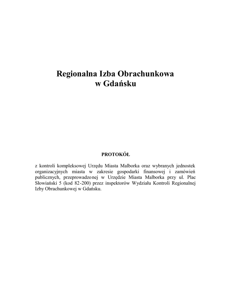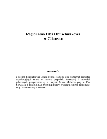 Regionalna Izba Obrachunkowa w Gdańsku PROTOKÓŁ z kontroli kompleksowej Urzędu Miasta Malborka oraz wybranych jednostek organizacyjnych miasta w zakresie gospodarki finansowej i zamówień publicznych, przeprowadzo nej w Urzędzie Miasta Malborka przy ul. Plac Słowiański 5 (kod 82-200) przez inspektorów Wydziału Kontroli Regionalnej Izby Obrachunkowej w Gdańsku. Zakres przedmiotowy kontroli I. Ustalenia ogólno-organizacyjne 1.1. Dane ogólne. 1.2. Wewnętrzne regulacje prawne jednostki. 1.3. Funkcjonowanie kontroli wewnętrznej. 1.4. Prowadzone kontrole zewnętrzne. II. Gospodarka pieniężna i rozrachunki 2.1. Gospodarka środkami pieniężnymi. 2.2. Rozrachunki i roszczenia. 2.3. Kredyty, pożyczki i poręczenia. III. Wykonanie budżetu 3.1. Dochody budżetowe. 3.2. Wydatki budżetowe. 3.3. Rozchody budżetowe. IV. Księgowość i sprawozdawczość finansowa 4.1. Stan i kompletność urządzeń księgowych oraz prawidłowość i terminowość zapisów w ewidencji księgowej. 4.2. Sprawozdawczość budżetowa. W trakcie kontroli wyjaśnień udzielały osoby zajmujące w Urzędzie stanowiska kierownicze oraz pracownicy bezpośrednio odpowiedzialni za prawidłową realizację zadań w przedmiotowym zakresie. I. Ustalenia ogólno-organizacyjne 1.1. Dane ogólne 1.1.1. Dane ogólne dotyczące kontroli 1.1.1.1. Tematyka kontroli Kontrola kompleksowa Urzędu Miasta Malborka i wybranych jednostek organizacyjnych miasta w zakresie gospodarki finansowej i zamówień publicznych. 1.1.1.2. Osoby kontrolujące - Marzena Okuniewicz - upoważnienie Nr 52/09 z dnia 05 maja 2009r. 1.1.1.3. Okres objęty kontrolą. Kontrolą objęto lata 2006 – 2008. 2 1.1.1.4. Termin przeprowadzenia kontroli. Kontrolę przeprowadzono w okresie od dnia 08 czerwca 2 009r. do dnia 31 sierpnia 2009r. z przerwą w dniach: 12, 16 czerwca; od 16 lipca do 14 sierpnia 2009r. 1.1.2. Kierownictwo jednostki Burmistrzem Miasta (po zatwierdzeniu przez Miejską Komisję Wyborczą wyników II tury wyborów bezpośrednich w dniu 26 listop ada 2006r.) jest Pan Andrzej Rychłowski. Objęcie obowiązków nastąpiło w dniu 06 grudnia 2006r. Zastępcą Burmistrza jest od dnia 07 grudnia 2006r. Pan Jerzy Skonieczny, powołany Zarządzeniem Nr 73/06 Burmistrza Miasta Malborka z dnia 07 grudnia 2006r. w sprawie określenia liczby zastępców Burmistrza Miasta Malborka i powołania zastępcy Burmistrza Miasta Malborka. Zastępcą Burmistrza jest od dnia 26 kwietnia 2007r. Pan Dariusz Denis, powołany Zarządzeniem Nr 36/07 Burmistrza Miasta Malborka z dnia 26 kwietnia 2007r. zmieniającym zarządzenie z dnia 07 grudnia 2006r. w sprawie określenia liczby zastępców Burmistrza Miasta Malborka i powołania zastępcy Burmistrza Miasta Malborka. Sekretarzem Miasta jest Pan Piotr Szwedowski, powołany na to stanowisko Uchwałą Nr 7/II/02 Rady Miasta Malborka z dnia 28 listopada 2002r. w sprawie powołania Sekretarza Miasta Malborka. Skarbnikiem Miasta jest Pani Małgorzata Pilarska -Downar, powołana na to stanowisko Uchwałą Nr 424/XLVIII/06 Rady Miasta Malborka z dnia 25 maja 2006r. w sprawie powołania Skarbnika Gminy Miejskiej Malbork. Przewodniczącym Rady Miasta jest Pan Arkadiusz Mroczkowski, wybrany na mocy Uchwały Rady Miasta Nr I/1/2006 z dnia 06 grudnia 2006r. w sprawie wyboru Przewodniczącego Rady Miasta Malborka. Imienny wykaz władz gminy, zawierający także daty powołania i odwołania poszczególnych osób wchodzących w ich skład stanowią akta robocze nr 1.1.2./1 do protokołu. 1.2. Wewnętrzne regulacje organizacyjno – prawne jednostki. 1.2.1. Statut miasta. Statut Miasta Malborka uchwalony został przez Radę Miasta Uchwałą Nr XXIII/194/08 z dnia 03 kwietnia 2008r. w sprawie uchwalenia Statutu Miasta Malborka. Jego treść opublikowana została w Dzienniku Urzędowym Województwa Pomorskiego Nr 57 z dnia 23 czerwca 2008r. , poz. 1626. Do dnia 07 lipca 2008r. Gmina Miejska Malbork działała w oparciu o Statut Miasta Malborka uchwalony przez Radę Uchwałą Nr 8/II/02 z dnia 28 listopada 2002r. w sprawie uchwalenia Statutu Miasta (opublikowany w Dzienniku Urzędowym Województwa Po morskiego Nr 16 z dnia 3 lutego 2003r., poz.176). 3 Stwierdzono, że obowiązujący statut nie został dostosowany do zmian wynikających z ustawy z dnia 21 listopada 2008r. o pracownikach samorządowych (Dz. U. Nr 223, poz.1458), dotyczących formy zatrudnie nia Sekretarza Miasta. Zgodnie z brzmieniem §71 ust.1 Statutu Miasta Malborka, cyt.: „na wniosek Burmistrza Rada powołuje Skarbnika oraz Sekretarza, których status pracowniczy określają odpowiednie przepisy dotyczące stosunku pracy na podstawie powołania”. Natomiast, zgodnie z obowiązującymi przepisami ustawy o pracownikach samorządowych, na podstawie powołania zatrudniani są: zastępca wójta (burmistrza, prezydenta miasta), skarbnik gminy, skarbnik powiatu, skarbnik województwa. Pozostali pracownicy samorz ądowi zatrudniani są na podstawie umowy o pracę (art.4 ust.1 pkt 2 i 3 w/w ustawy). 1.2.2. Regulamin Organizacyjny Urzędu. Organizację i zasady funkcjonowania Urzędu określa Regulamin Organizacyjny Urzędu Miasta Malborka, wprowadzony Zarządzeniem N r 26/09 Burmistrza Miasta Malborka z dnia 06 maja 2009r. W okresie wcześniejszym, tj.: od dnia 03 kwietnia 2008r. do dnia 05 maja 2009r. obowiązywał Regulamin Organizacyjny Urzędu Miasta Malborka, wprowadzony Zarządzeniem Nr 17/08 Burmistrza Miasta Malbo rka z dnia 03 kwietnia 2008r.; od dnia 15 lutego 2007r. do dnia 02 kwietnia 2008r. obowiązywał Regulamin Organizacyjny Urzędu Miasta Malborka, wprowadzony Zarządzeniem Nr 77 Burmistrza Miasta Malborka z dnia 11 grudnia 2006r. 1.2.2.1. Regulamin wynagradz ania pracowników. Do dnia kontroli na tym odcinku ( 06 lipca 2009r.) jednostka nie przedłożyła regulaminu wynagradzania pracowników zatrudnionych na podstawie umowy o pracę, którego Urząd zobowiązany był opracować ( do dnia 01.07.2009r.) na podstawie art.39 ustawy z dnia 21 listopa