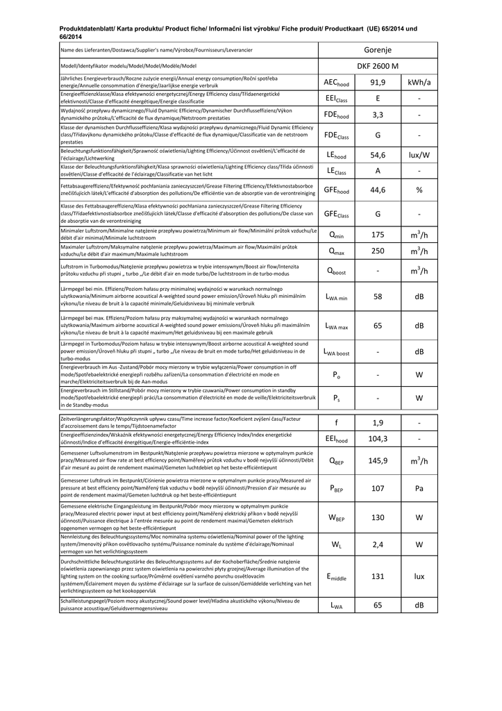 Produktdatenblatt/ Karta produktu/ Product fiche/ Informační list výrobku/ Fiche produit/ Productkaart (UE) 65/2014 und 66/2014 Gorenje Name des Lieferanten/Dostawca/Supplier's name/Výrobce/Fournisseurs/Leverancier DKF 2600 M Modell/Identyfikator modelu/Model/Model/Modèle/Model Jährliches Energieverbrauch/Roczne zużycie energii/Annual energy consumption/Roční spotřeba energie/Annuelle consommation d'énergie/Jaarlijkse energie verbruik AEChood 91,9 kWh/a Energieeffizienzklasse/Klasa efektywności energetycznej/Energy Efficiency class/Třídaenergetické efektivnosti/Classe d'efficacité énergétique/Energie classificatie EEIClass E - Wydajność przepływu dynamicznego/Fluid Dynamic Efficiency/Dynamischer Durchflusseffizienz/Výkon dynamického průtoku/L’efficacité de flux dynamique/Netstroom prestaties FDEhood 3,3 - Klasse der dynamischen Durchflusseffizienz/Klasa wydajności przepływu dynamicznego/Fluid Dynamic Efficiency class/Třídavýkonu dynamického průtoku/Classe d'efficacité de flux dynamique/Classificatie van de netstroom prestaties FDEClass G - Beleuchtungsfunktionsfähigkeit/Sprawność oświetlenia/Lighting Efficiency/Účinnost osvětlení/L'efficacité de l'éclairage/Lichtwerking LEhood 54,6 lux/W Klasse der Beleuchtungsfunktionsfähigkeit/Klasa sprawności oświetlenia/Lighting Efficiency class/Třída účinnosti osvětlení/Classe d’efficacité de l’éclairage/Classificatie van het licht LEClass A - Fettabsaugereffizienz/Efektywność pochłaniania zanieczyszczeń/Grease Filtering Efficiency/Efektivnostabsorbce znečišťujících látek/L'efficacité d'absorption des pollutions/De efficiëntie van de absorptie van de verontreiniging GFEhood 44,6 % Klasse des Fettabsaugereffizienz/Klasa efektywności pochłaniana zanieczyszczeń/Grease Filtering Efficiency class/Třídaefektivnostiabsorbce znečišťujících látek/Classe d'efficacité d'absorption des pollutions/De classe van de absorptie van de verontreiniging GFEClass G - Minimaler Luftstrom/Minimalne natężenie przepływu powietrza/Minimum air flow/Minimální průtok vzduchu/Le débit d'air minimal/Minimale luchtstroom Qmin 175 m3/h Maximaler Luftstrom/Maksymalne natężenie przepływu powietrza/Maximum air flow/Maximální průtok vzduchu/Le débit d'air maximum/Maximale luchtstroom Qmax 250 m3/h Luftstrom in Turbomodus/Natężenie przepływu powietrza w trybie intensywnym/Boost air flow/Intenzita průtoku vzduchu při stupni „ turbo „/Le débit d'air en mode turbo/De luchtstroom in de turbo-modus Qboost - m3/h Lärmpegel bei min. Effizienz/Poziom hałasu przy minimalnej wydajności w warunkach normalnego użytkowania/Minimum airborne acoustical A-weighted sound power emission/Úroveň hluku při minimálním výkonu/Le niveau de bruit à la capacité minimale/Geluidsniveau bij minimale verbruik LWA min 58 dB Lärmpegel bei max. Effizienz/Poziom hałasu przy maksymalnej wydajności w warunkach normalnego użytkowania/Maximum airborne acoustical A-weighted sound power emissions/Úroveň hluku při maximálním výkonu/Le niveau de bruit à la capacité maximum/Het geluidsniveau bij een maximale gebruik LWA max 65 dB Lärmpegel in Turbomodus/Poziom hałasu w trybie intensywnym/Boost airborne acoustical A-weighted sound power emission/Úroveň hluku při stupni „ turbo „/Le niveau de bruit en mode turbo/Het geluidsniveau in de turbo-modus LWA boost - dB Energieverbrauch im Aus -Zustand/Pobór mocy mierzony w trybie wyłączenia/Power consumption in off mode/Spotřebaelektrické energiepři rozběhu zařízení/La consommation d'électricité en mode en marche/Elektriciteitsverbruik bij de Aan-modus Po - W Energieverbrauch im Stillstand/Pobór mocy mierzony w trybie czuwania/Power consumption in standby mode/Spotřebaelektrické energiepři práci/La consommation d'électricité en mode de veille/Elektriciteitsverbruik in de Standby-modus Ps - W f 1,9 - EEIhood 104,3 - Gemessener Luftvolumenstrom im Bestpunkt/Natężenie przepływu powietrza mierzone w optymalnym punkcie pracy/Measured air flow rate at best efficiency point/Naměřený průtok vzduchu v bodě nejvyšší účinnosti/Débit d’air mesuré au point de rendement maximal/Gemeten luchtdebiet op het beste-efficiëntiepunt QBEP 145,9 m3/h Gemessener Luftdruck im Bestpunkt/Ciśnienie powietrza mierzone w optymalnym punkcie pracy/Measured air pressure at best efficiency point/Naměřený tlak vzduchu v bodě nejvyšší účinnosti/Pression d’air mesurée au point de rendement maximal/Gemeten luchtdruk op het beste-efficiëntiepunt PBEP 107 Pa Gemessene elektrische Eingangsleistung im Bestpunkt/Pobór mocy mierzony w optymalnym punkcie pracy/Measured electric power input at best efficiency point/Naměřený elektrický příkon v bodě nejvyšší účinnosti/Puissance électrique à l’entrée mesurée au point de rendement maximal/Gemeten elektrisch opgenomen vermogen op het beste-efficiëntiepunt WBEP 130 W WL 2,4 W Emiddle 131 lux LWA 65 dB Zeitverlängerungsfaktor/Współczynnik upływu czasu/Time increase factor/Koeficient zvýšení času/Facteur d’accroissement dans le temps/Tijdstoenamefactor Energieeffizienzindex/Wskaźnik efektywności energetycznej/Energy Efficiency Index/Index energetické účinnosti/Indice d’efficacité énergétique/Energie-efficiëntie-index Nennleistung des Beleuchtungssystems/Moc nominalna systemu oświetlenia/Nominal power of the lighting system/Jmenovitý příkon osvětlovacího systému/Puissance nominale du système d’éclairage/Nominaal vermogen van het verlichtingssysteem Durchschnittliche Beleuchtungsstärke des Beleuchtungssystems auf der Kochoberfläche/Średnie natężenie oświetlenia zapewnianego przez system oświetlenia na powierzchni płyty grzejnej/Average illumination of the lighting system on the cooking surface/Průměrné osvětlení varného povrchu osvětlovacím systémem/Éclairement moyen du système d’éclairage sur la surface de cuisson/Gemiddelde verl