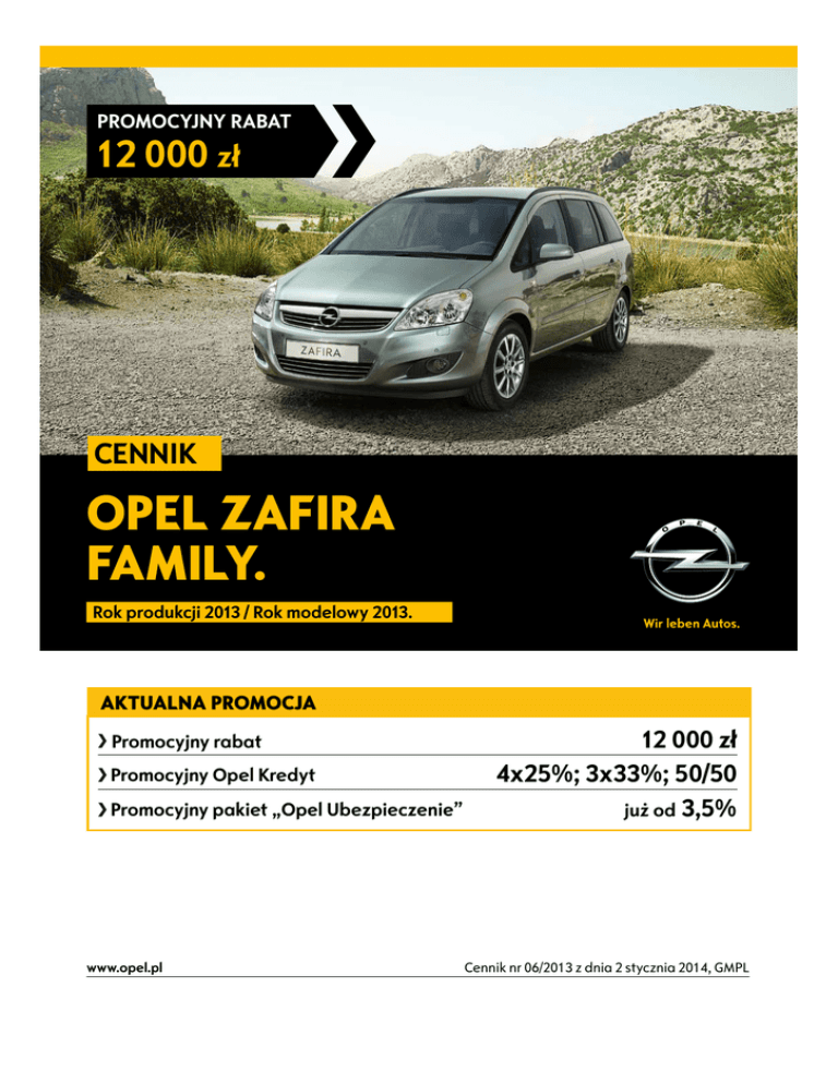 PROMOCYJNY RABAT 12 000 zł CENNIK OPEL ZAFIRA FAMILY. Rok produkcji 2013 / Rok modelowy 2013. AKTUALNA PROMOCJA Promocyjny rabat Promocyjny Opel Kredyt Promocyjny pakiet „Opel Ubezpieczenie” www.opel.pl 12 000 zł 4x25%; 3x33%; 50/50 już od 3,5% Cennik nr 06/2013 z dnia 2 stycznia 2014, GMPL Cennik – Opel Zafira Family Rok produkcji 2013, rok modelowy 2013 Ceny promocyjne* Family 1.6 Ecotec (115 KM) M5 57 700 1.6 Turbo Ecotec CNG (150 KM)** M5 80 150 1.8 Ecotec (140 KM) M5 63 700 MA5 69 700 1.7 CDTI Ecotec (110 KM)** M6 69 700 1.7 CDTI Ecotec (125 KM) M6 71 700 1.8 Ecotec Easytronic (140 KM) * Liczba modeli w promocji ograniczona. Promocja dostępna do wyczerpania zapasów. Dokładny opis całej oferty promocyjnej znajduje się na stronie www.opel.pl w sekcji promocje lub dostępny jest u Autoryzowanego Dystrybutora marki Opel. Ceny promocyjne dotyczą klientów indywidualnych. Klientów flotowych w sprawie zapytań ofertowych prosimy o kontakt z wybranym Autoryzowanym Dystrybutorem marki Opel. Ceny katalogowe Family 1.6 Ecotec (115 KM) M5 69 700 1.6 Turbo Ecotec CNG (150 KM)** M5 92 150 1.8 Ecotec (140 KM) M5 75 700 MA5 81 700 1.7 CDTI Ecotec (110 KM)** M6 81 700 1.7 CDTI Ecotec (125 KM) M6 83 700 1.8 Ecotec Easytronic (140 KM) ** dostępny w wersji 5-miejscowej (w cenie niższej od wersji 7-miejscowej o 2 000 zł) z homologacją ciężarową N1 (bez prawa odliczenia 23% VAT) Cennik Opla Zafiry Family, rok produkcji 2013, rok modelowy 2013, nr 06/2013 z dnia 2 stycznia 2014 1/3 Wyposażenie standardowe Family Tapicerka Twist/Elba lub Alpha/Elba, czarna Podłokietnik fotela kierowcy Klimatyzacja sterowana ręcznie Radioodtwarzacz CD 30 MP3. Zawiera: 6-głośnikowy system audio, złącze AUX-in, wyświetlacz wielofunkcyjny Elektrycznie sterowane i podgrzewane lusterka zewnętrzne w kolorze nadwozia Stalowe obręcze kół 16x6,5” z oponami 205/55 R16 Gniazdko 12 V w drugim rzędzie siedzeń / w przedziale bagażowym (tylko z zestawem naprawczym) Przesuwana dzielona kanapa w drugim rzędzie siedzeń Przednie i boczne poduszki powietrzne kierowcy i pasażera, poduszki kurtynowe Pakiet Oświetleniowy 1. Zawiera: Oświetlenie wnętrza pojazdu z przodu i z tyłu TABR/XXTC DA7 C60 UCH DDG PY3 KC7/KC8 AV4 AY0 TSP S S S S S S S S S S DDH BW4 V3E A14 VQ9 T96 TT2 QN1 QQ0 QL4/PWC QQ5 2 000 350/P 200/P 250/P 700/P 2 950 850/P 5 200 650/P 2 600 4 300 500/P A33 N34 DT4 VVH AP9 ANY C61 C68 C32 K07 2GB 1 400/P 700/P 50 700 900/P 250/P 500 1 700/P 1 250 7 500 400/P UFZ 2 350 UWA 2 100 FX3 UA6 K34 U68 UD5 700/P 2 250/P 1 500/P 900/P 1 600/P AH4 550/P A53 1 100 W7Z 1 400 AQ2 450 TSQ 950/P LP4L 950 LPI1 1 750 LPHY 1 950 LPHX 1 950 LPHZ 950 XK0 2 800 CWH 1 900 Wyposażenie dodatkowe NADWOZIE Lakier metaliczny / perłowy / opalizujący Elektrycznie składane lusterka zewnętrzne Listwy ozdobne przy dolnej krawędzi okien bocznych, chromowane Relingi dachowe, srebrne (zastępują standardowe relingi w kolorze czarnym) Przyciemniane tylne szyby Hak holowniczy – składany Reflektory przeciwmgielne Reflektory bi-ksenonowe AFL Strukturalne obręcze kół, stalowe 16x6,5” z oponami 205/55 R16 (niedostępne z 1.6 150KM CNG) Obręcze kół ze stopów lekkich 16x6,5”, z oponami 205/55 R16 Obręcze kół ze stopów lekkich 17x7,0”, z oponami 225/45 R17. Zawierają: Układ stabilizacji toru jazdy ESP® z Traction Control. Pełnowymiarowe koło zapasowe stalowe 16” (zastępuje dostępny w standardzie zestaw naprawczy) WNĘTRZE Elektrycznie sterowane tylne szyby Kierownica trójramienna pokryta skórą z przyciskami sterowania Popielniczka i zapalniczka (pakiet dla palących) Panele ozdobne wnętrza w kolorze Piano Black Siatka zabezpieczająca bagaż. Zawiera: zaczepy do zamocowania siatki w bagażniku. System mocowania bagażu FlexRail Klimatyzacja automatyczna Klimatyzacja sterowana elektronicznie. Zawiera: wyświetlacz graficzny Dodatkowe elektryczne ogrzewanie w systemie nawiewu powietrza Ogrzewanie postojowe Radioodtwarzacz CD 40 USB. Zawiera: 6-głośnikowy system audio, złącza AUX-in i USB, wyświetlacz graficzny Radioodtwarzacz CD MP3 „Touch&Connect” z nawigacją. Zawiera: 6-głośnikowy system audio, kolorowy wyświetlacz 5” i komputer pokładowy (tylko dla klimatyzacji elektronicznej), złącza AUX-in i USB. Komunikaty w języku angielskim. Portal telefonu komórkowego Bluetooth® ze sterowaniem głosowym. Zawiera: wyświetlacz graficzny BEZPIECZEŃSTWO I UKŁADY WSPOMAGAJĄCE KIEROWCĘ Układ stabilizacji toru jazdy ESP® z Traction Control (standard z silnikiem 1.6 150 KM CNG) Alarm. Zawiera system ryglujący „deadlock” Tempomat Komputer pokładowy (niedostępny z silnikiem 1.6 150KM CNG) Czujniki parkowania, przód i tył PAKIETY WYPOSAŻENIA DODATKOWEGO Pakiet Komfortowy 1 Fotel kierowcy regulowany w 6 kierunkach, regulacja podparcia lędźwiowego fotela kierowcy. Pakiet Komfortowy 2 Fotele przednie regulowane w 6 kierunkach z regulacją odcinka lędźwiowego. Pakiet Zimowy Spryskiwacze reflektorów. Podgrzewane fotele przednie. Nawiewy powietrza w trzecim rzędzie siedzeń. Pakiet Flex Organizer System mocowania „FlexRail”. System mocowania tylnych foteli z odłączanymi pasami bezpieczeństwa. Siatki do mocowania bagażu. Pakiet Oświetleniowy 2 Czujnik deszczu. Światłoczułe lusterko wewnętrzne. Automatyczne sterowanie światłami z czujnikiem oświetlenia. Pakiet Biznes Alarm. Pełnowymiarowe stalowe koło zapasowe. Pakiet Kierowcy Tempomat. Elektrycznie sterowane tylne szyby. Radioodtwarzacz CD 40 USB. Pakiet Komfortowy Fotel kierowcy regulowany w 6 kierunkach z regulacją odcinka lędźwiowego. Pakiet Flex Organizer. Pakiet Oświetleniowy 2. Czujniki parkowania, przód i tył. Pakiet Elektroniczny Elektrycznie składane lusterka zewnętrzne. Komputer pokładowy. Kierownica pokryta skórą z przyciskami sterowania. Klimatyzacja sterowana elektronicznie . Pakiet Wizualny Reflektory przeciwmgielne. Strukturalne obręcze kół, stalowe 16x6,5” (niedostępne dla silni