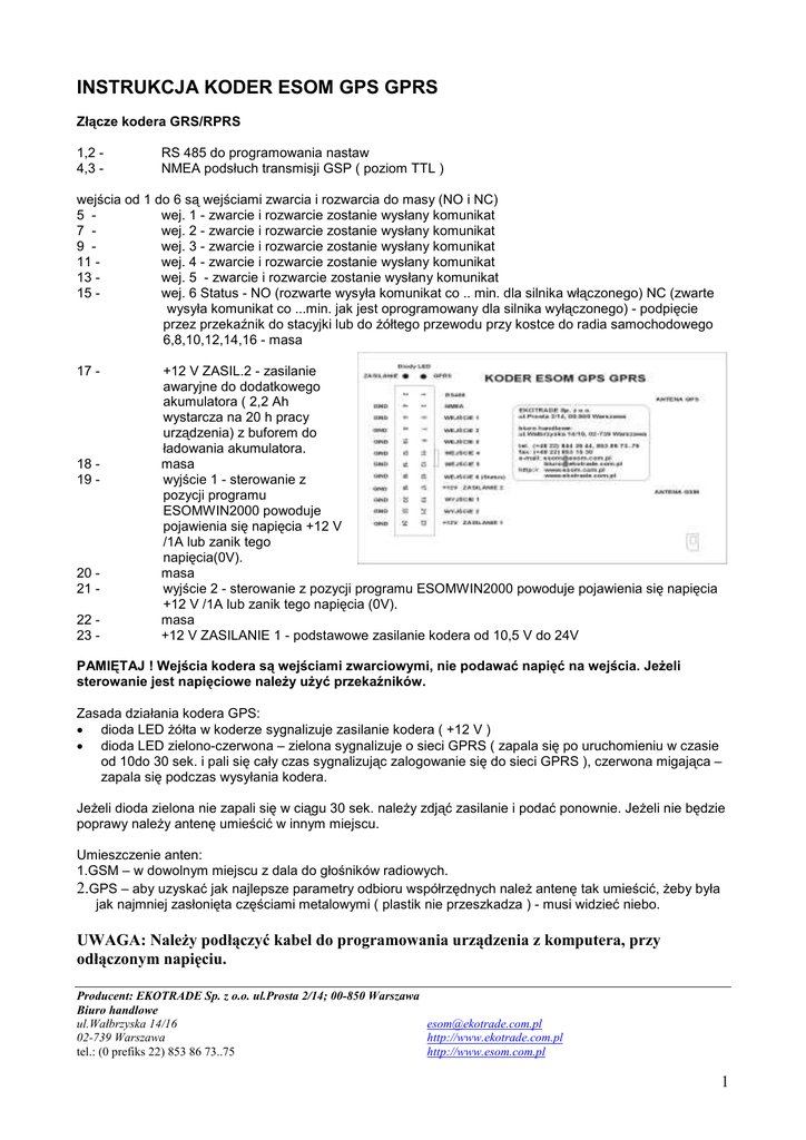 INSTRUKCJA KODER ESOM GPS GPRS Złącze kodera GRS/RPRS 1,2 4,3 - RS 485 do programowania nastaw NMEA podsłuch transmisji GSP ( poziom TTL ) wejścia od 1 do 6 są wejściami zwarcia i rozwarcia do masy (NO i NC) 5 wej. 1 - zwarcie i rozwarcie zostanie wysłany komunikat 7 wej. 2 - zwarcie i rozwarcie zostanie wysłany komunikat 9 wej. 3 - zwarcie i rozwarcie zostanie wysłany komunikat 11 wej. 4 - zwarcie i rozwarcie zostanie wysłany komunikat 13 wej. 5 - zwarcie i rozwarcie zostanie wysłany komunikat 15 wej. 6 Status - NO (rozwarte wysyła komunikat co .. min. dla silnika włączonego) NC (zwarte wysyła komunikat co ...min. jak jest oprogramowany dla silnika wyłączonego) - podpięcie przez przekaźnik do stacyjki lub do żółtego przewodu przy kostce do radia samochodowego 6,8,10,12,14,16 - masa 17 - 18 19 - 20 21 22 23 - +12 V ZASIL.2 - zasilanie awaryjne do dodatkowego akumulatora ( 2,2 Ah wystarcza na 20 h pracy urządzenia) z buforem do ładowania akumulatora. masa wyjście 1 - sterowanie z pozycji programu ESOMWIN2000 powoduje pojawienia się napięcia +12 V /1A lub zanik tego napięcia(0V). masa wyjście 2 - sterowanie z pozycji programu ESOMWIN2000 powoduje pojawienia się napięcia +12 V /1A lub zanik tego napięcia (0V). masa +12 V ZASILANIE 1 - podstawowe zasilanie kodera od 10,5 V do 24V PAMIĘTAJ ! Wejścia kodera są wejściami zwarciowymi, nie podawać napięć na wejścia. Jeżeli sterowanie jest napięciowe należy użyć przekaźników. Zasada działania kodera GPS: • dioda LED żółta w koderze sygnalizuje zasilanie kodera ( +12 V ) • dioda LED zielono-czerwona – zielona sygnalizuje o sieci GPRS ( zapala się po uruchomieniu w czasie od 10do 30 sek. i pali się cały czas sygnalizując zalogowanie się do sieci GPRS ), czerwona migająca – zapala się podczas wysyłania kodera. Jeżeli dioda zielona nie zapali się w ciągu 30 sek. należy zdjąć zasilanie i podać ponownie. Jeżeli nie będzie poprawy należy antenę umieścić w innym miejscu. Umieszczenie anten: 1.GSM – w dowolnym miejscu z dala do głośników radiowych. 2.GPS – aby uzyskać jak najlepsze parametry odbioru współrzędnych należ antenę tak umieścić, żeby była jak najmniej zasłonięta częściami metalowymi ( plastik nie przeszkadza ) - musi widzieć niebo. UWAGA: Należy podłączyć kabel do programowania urządzenia z komputera, przy odłączonym napięciu. Producent: EKOTRADE Sp. z o.o. ul.Prosta 2/14; 00-850 Warszawa Biuro handlowe ul.Wałbrzyska 14/16 [email protected] 02-739 Warszawa http://www.ekotrade.com.pl tel.: (0 prefiks 22) 853 86 73..75 http://www.esom.com.pl 1 2