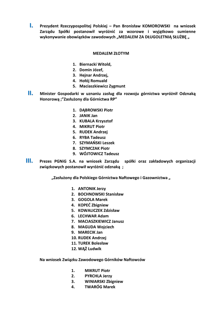 I. Prezydent Rzeczypospolitej Polskiej – Pan Bronisław KOMOROWSKI na wniosek Zarządu Spółki postanowił wyróżnić za wzorowe i wyjątkowo sumienne wykonywanie obowiązków zawodowych „MEDALEM ZA DŁUGOLETNIĄ SŁUŻBĘ „ MEDALEM ZŁOTYM 1. 2. 3. 4. 5. II. Minister Gospodarki w uznaniu zasług dla rozwoju górnictwa wyróżnił Odznaką Honorową ;”Zasłużony dla Górnictwa RP” 1. 2. 3. 4. 5. 6. 7. 8. 9. III. Biernacki Witold, Domin Józef, Hejnar Andrzej, Hołój Romuald Maciaszkiewicz Zygmunt DĄBROWSKI Piotr JANIK Jan KUBALA Krzysztof MIKRUT Piotr RUDEK Andrzej RYBA Tadeusz SZYMAŃSKI Leszek SZYMCZAK Piotr WÓJTOWICZ Tadeusz Prezes PGNiG S.A. na wniosek Zarządu spółki oraz zakładowych organizacji związkowych postanowił wyróżnić odznaką ; „Zasłużony dla Polskiego Górnictwa Naftowego i Gazownictwa „ 1. ANTONIK Jerzy 2. BOCHNOWSKI Stanisław 3. GOGOLA Marek 4. KOPEĆ Zbigniew 5. KOWALICZEK Zdzisław 6. LECHWAR Adam 7. MACIASZKIEWICZ Janusz 8. MAGUDA Wojciech 9. MARECIK Jan 10. RUDEK Andrzej 11. TUREK Bolesław 12. WĄŻ Ludwik Na wniosek Związku Zawodowego Górników Naftowców 1. 2. 3. 4. MIKRUT Piotr PYRCHLA Jerzy WINIARSKI Zbigniew TWARÓG Marek 5. KOPEĆ Mariusz Na wniosek Związku Zawodowego NSZZ SOLIDARNOŚĆ 1. KIEPURA Józef 2. NYKIEL Józef IV. Prezes PGNiG na wniosek Zarządu spółki postanowił nadać stopnie górnicze niżej wymienionym pracownikom naszej Spółki: INŻYNIER GÓRNICZY I Stopnia 1. PŁATOSZ Tomasz 2. ROKITA Jacek 3. TYŃSKI Paweł INŻYNIER GÓRNICZY II Stopnia 1. 2. 3. 4. 5. ANTONIK Jerzy BIALIKIEWICZ Bartłomiej KRUK Robert MEYER Robert ZBRZEŹNIAK Bogusław TECHNIK GÓRNICZY (I, II i III Stopnia) 1. 2. 3. 4. 5. 6. KIJOWSKI Marcin KRÓL Wacław MIKRUT Piotr (wieżowy 1474) NYKIEL Józef SZYMCZAK Piotr WŁODARCZYK Krzysztof GÓRNIK (I, II, i III Stopnia) 1. 2. 3. 4. 5. 6. V. KORZENIOWSKI Tadeusz KUBALA Paweł ŁABIAK Władysław PRZYBYŁA Dariusz TOMASZEK Stanisław WINIARSKI Zbigniew Dyrektor Ratowniczej Stacji Górnictwa Otworowego w Krakowie w uznaniu zasług wniesionych w udoskonalenie i rozwój ratownictwa górniczego oraz ratowania życia ludzkiego uhonorował ODZNAKĄ HONOROWĄ „Zasłużony Ratownik Górniczy RSGO„ 1. 2. 3. 4. VI. BĄK Marcin w pracy KNAPIK Andrzej w pracy POLAK Janusz ZBRZEŹNIAK Bogusław Zarząd spółki postanowił wyróżnić n/w pracowników w uznaniu ich długoletniej i sumiennej pracy dla PNiG Kraków JESTEM Z FIRMĄ 1. 2. 3. 4. 5. 6. 7. 8. 9. BOHDAN Aleksandra FEDYNA-BARTOSIK Agnieszka IQBAR Amir KARIBAEW MEIRBAK TOKAREWICZ KULIGA Kazimiera KWINTA Teresa MACHNIK Janusz SAPIECHA Urszula SKOBRTAL Małgorzata VII. Zarząd spółki postanowił wyróżnić Spadą Górniczą w uznaniu długoletniej i sumiennej pracy dla PNiG Kraków, pana SEWERYNA ŁUKOMSKIEGO VIII. Ogólnopolski Związek Zawodowy Górnictwa Naftowego i Gazownictwa w uznaniu zasług odznaczył Odznaką Honorową „Za Zasługi dla Ogólnopolskiego Związku Zawodowego Górnictwa Naftowego i Gazownictwa” 1. 2. 3. 4. 5. 6. 7. IX. WOJNA Stanisław KOZIOŁ Andrzej WIĘCŁAW Beata GWÓŹDŹ Władysław NAWROCKI Adam STEC Roman PODSIADŁO Waldemar Prezydent Miasta Krakowa wyróżnił Pana Marka Łowczowskiego odznaką HONORIS GRATIA, za zasługi dla Miasta Krakowa