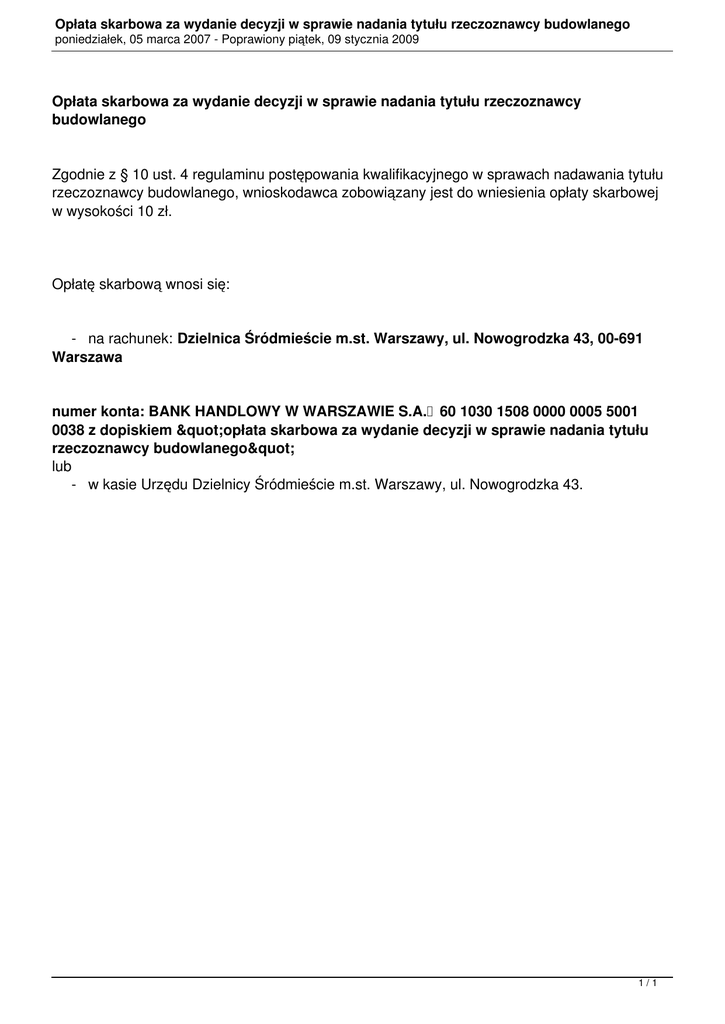 Opłata skarbowa za wydanie decyzji w sprawie nadania tytułu rzeczoznawcy budowlanego poniedziałek, 05 marca 2007 - Poprawiony piątek, 09 stycznia 2009 Opłata skarbowa za wydanie decyzji w sprawie nadania tytułu rzeczoznawcy budowlanego Zgodnie z § 10 ust. 4 regulaminu postępowania kwalifikacyjnego w sprawach nadawania tytułu rzeczoznawcy budowlanego, wnioskodawca zobowiązany jest do wniesienia opłaty skarbowej w wysokości 10 zł. Opłatę skarbową wnosi się: - na rachunek: Dzielnica Śródmieście m.st. Warszawy, ul. Nowogrodzka 43, 00-691 Warszawa numer konta: BANK HANDLOWY W WARSZAWIE S.A. 60 1030 1508 0000 0005 5001 0038 z dopiskiem "opłata skarbowa za wydanie decyzji w sprawie nadania tytułu rzeczoznawcy budowlanego" lub - w kasie Urzędu Dzielnicy Śródmieście m.st. Warszawy, ul. Nowogrodzka 43. 1/1