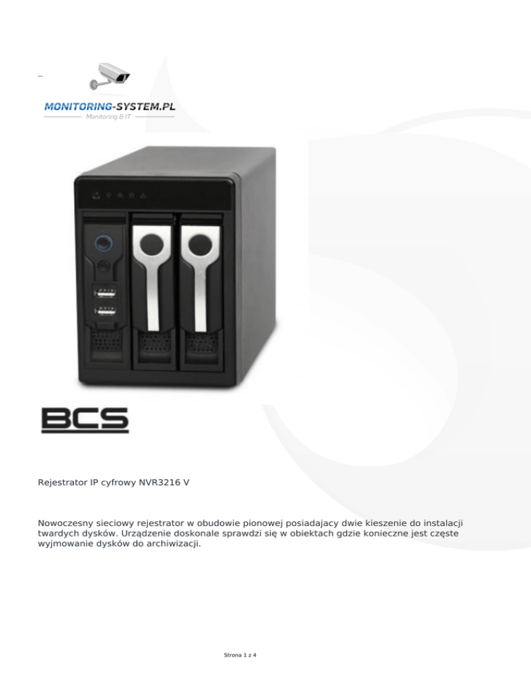 Rejestrator IP cyfrowy NVR3216 V Nowoczesny sieciowy rejestrator w obudowie pionowej posiadajacy dwie kieszenie do instalacji twardych dysków. Urządzenie doskonale sprawdzi się w obiektach gdzie konieczne jest częste wyjmowanie dysków do archiwizacji. Strona 1 z 4 Charakterystyka produktu nagrywanie do 16 kanałów w czasie rzeczywistym 1080P dwie metody kodowania H.264 / MPEG4 podgląd i zapis maksymalnie dla: 1080p/100 kl/s, 720p/200 kl/s, D1/400 kl/s Pentaplex: możliwość równoczesnego: nagrywania, odtwarzania, archiwizacji, zdalnego dostępu, rejestracji jednoczesne odtwarzanie wszystkich kamer w tym samym czasie inteligentne pozycjonowanie 3D kamer PTZ obsługa kamer IP wielu producentów: Dahua, Arecont Vision, AXIS, Bosch, Brickcom, Canon, CP Plus, Dynacolor, Honeywell, Panasonic, Pelco, Samsung, Sanyo, Sony, Videosec, Vivotech oraz innych zgodnych ze standardem ONVIF. obsługa 2 dysków SATA II i SATA III do całkowitej pojemności 8 TB, 1 wyjście eSATA maks. do 1 TB 3 porty USB 2.0 dwu rdzeniowy procesor automatyczne wyszukiwanie kamer w sieci wbudowany serwer www, obsługa programem dedykowanym PSS (dla widnwos, mac, linux), programy dla telefonów Iphone, Android, BlackBerry, Symbian Model DVS-NVR3216V System Dwurdzeniowy procesor Embedded Linux Audio/Wideo 16 kanałów 1 kanał wejściowy, 1 kanał wyjściowy, RCA Sieć Procesor główny System operacyjny Wejście kamery IP Dwukierumkowa rozmowa Strona 2 z 4 Interfejs Rozdzielczość 1 HDMI, 1 VGA 1920 × 1080, 1280 × 1024, 1280 × 720, 1024 × 768 1/4 Nazwa kamery, czas, zanik sygnału, blokada kamery, detekcja ruchu, nagrywanie Nagrywanie H.264 / MPEG4 1080P(1920×1080) / 720P(1280×720) / D1 (704×576/704×480) 400/480fps@D1, 200/240fps@720P , 100/120fps@1080P 48 ~ 8192kbps Manualny, Ciągły, MD, Alarm), Stop 1 ~ 120 min (domyślnie: 60 min), Pre-nagrywanie: 1 ~ 30 sek, Post-nagrywanie: 10 ~ 300 sek Detekcja wideo oraz Alarm Nagrywanie, PTZ, Trasa, Alarm, Push Video, E-mail, FTP, Spot, Buzzer & Screen Detekcja ruchu, Strefy MD: 396 (22 × 18), Video Loss & Blank Camera 3 kanały 1 kanał Odtwarzanie i backup 1/4/8/9/16 Podział ekranu OSD Kompresja Rozdzielczość nagrywania Ilość klatek Strumień zapisu Tryb nagrywania Interwał nagrywania Zdarzenia wyzwalające Detekcja wideo Wejście alarmowe Wyjście przekaźnika Odtwarzanie kanałów Tryb wyszukiwania Czas / Data, Alarm, MD & Exact szukanie (z dokładnością do sekundy), wyszukiwanie inteligentne Play, pauza, stop, przewijanie, szybki play, Wolny play, Następny plik, poprzedni plik, następna kamera, poprzednia kamera, pełny ekran, powtarzanie, losowe, Backup wyboru, zoom cyfrowy Urządzenie USB / eSATA Device / Sieć Sieć Port RJ-45 (10/100M/1000M) HTTP, TCP / IP, IPv4/IPv6, UPnP, RTSP, UDP, SMTP, NTP, DHCP, DNS, filtrowanie IP, PPPoE, DDNS, FTP, serwer Alarm, IP Search (Wsparcie kamera IP Dahua, DVR, NVS etc) 20 użytkowników iPhone, iPad, Android, Windows Phone Magazynowanie 2 porty SATA, do 8TB 1 port eSATA (Maksymalnie 4 dyski SATA), do 16 TB Auxiliary Interface 3 porty (1 z tyłu), USB2.0 1 port eSATA (Maksymalnie 4 dyski SATA), do 16 TB 1 port do sterowania PTZ Parametry techniczne Funkcja odtwarzania Tryb rezerwowy Ethernet Funkcje sieciowe Max. Dostęp użytkownika Smart Phone wewnętrzny dysk twardy zewnętrzny HDD Interfejs USB RS232 RS485 Strona 3 z 4 Pobór mocy Temperatura pracy Wymiary Masa 20W (bez dysków) -10° C ÷ +55° C 100mm × 220mm × 146mm 1.6kg (bez HDD) Faktura VAT Gwarancja 36 m-c Strona 4 z 4