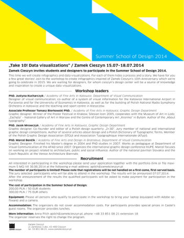 Summer School of Design 2014 „Take 10! Data visualizations” / Zamek Cieszyn 15.07–18.07.2014 Zamek Cieszyn invites students and designers to participate in the Summer School of Design 2014. This time we will create infographics and data visualizations. For each of them hides a process and a story. We have for you a few great stories! Join to the workshop to create infographics inspired of Zamek Cieszyn’s 10th Anniversary which we’re going to celebrate in 2015. We are waiting for designers, for whom cieszyn’s design center will be a source of knowledge and inspiration to create a unique data visualizations. Workshop leaders PhD. Justyna Kucharczyk / Academy of Fine Arts in Katowice, Department of Visual Communication Designer of visual communication; co–author of a system of visual information for the Katowice International Airport in Pyrzowice and for the University of Economics in Katowice, as well as for the building of Polish National Radio Symphony Orchestra in Katowice and the teaching-and-sport centre in Kleszczów. Associate Professor Tomasz Bierkowski PhD. / Academy of Fine Arts in Katowice, Graphic Design Department Graphic designer. Winner of the Poster Festival in Krakow, Silesian Icon 2005, cooperates with the Museum of Art in Lodz, „Zachęta” – National Gallery of Art in Warsaw and the Centre of Contemporary Art „Kronika” in Bytom. Author of the „About typography”. PhD. Jacek Mrowczyk / Academy of Fine Arts in Katowice, Graphic Design Department Graphic designer. Co–founder and editor of a Polish design quarterly „2+3D”. Jury member of national and international graphic design competitions. Author of several articles about design and a Polish Dictionary of Typographic Terms. Member of the Polish Graphic Design Association (STGU) and Association Typographique Internationale (ATypI). PhD. Marcel Benčík / Academy of Fine Arts and Design in Bratislava, Department of Visual Communication Graphic Designer. Finished his Master’s degree in 2004 and PhD studies in 2007. Works as pedagogue at Department of Visual Communication at the AFAD since 2007. Organizes the international graphic design conference KUPÉ. Marcel focuses on working on project related to architecture, public and social influence. Author of the national pavilion Slovakia and the Czech Republic at the Venice Architecture Biennale. Recruitment All interested in participating in the workshop please send your application together with the portfolio (link or file maximum 5 MG) till 30.06.2014 at the following e-mail address: [email protected] The number of participants is limited! Please note that registrations will be not handled on a first-come, first-served basis. The jury selected participants who will be able to attend in the workshop. The results will be announced 07.07.2014. After the announcement of the results the qualified participants will be asked to make payment for participation in the workshop. The cost of participation in the Summer School of Design: 200,00 PLN / 50 EUR students 300,00 PLN / 75 EUR others Equipment: Please all persons who qualify to participate in the workshop to bring your laptop (equipped with Adobe software) and a camera. Accommodation: The organizers do not cover accommodation costs. For participants provides special prices in Castel’s guest rooms. The organizer provides lunches. More information: Anna Pilch [email protected], phone: +48 33 851 08 21 extension 18 The organizer reserves the right to change the program. Zamek Cieszyn ul. Zamkowa 3 abc, 43-400 Cieszyn tel. 33 851 08 21, www.zamekcieszyn.pl