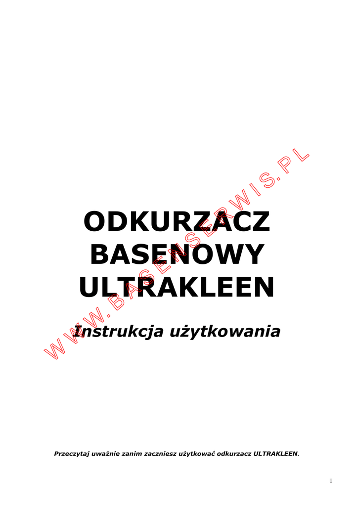 W I P . S L R ODKURZACZ E S N BASENOWY E S ULTRAKLEEN A .B W Instrukcja użytkowania W W Przeczytaj uważnie zanim zaczniesz użytkować odkurzacz ULTRAKLEEN. 1 1. BEZPIECZEŃSTWO 1.1. ZASILANIE Wózek oraz zasilacz [1, strona 7] powinny się znajdować w takim miejscu, aby ULTRAKLEEN mógł swobodnie dotrzeć do wszystkich rogów basenu. Dodatkowo musi być to odległość minimum 3 metrów od brzegu basenu. [Fig. A] UWAGA! Podczas pracy odkurzacza zasilanie musi znajdować się w cieniu i z dala od wody. 1.2. WYMAGANIA ELEKTRYCZNE Kabel do napięcia: 100V, 115V lub 230V. Wysokość napięcia powinna być sprawdzona przed podłączeniem odkurzacza. Upewnij się, że główna wtyczka posiada bolec uziemiający. UWAGA! Używaj wyłącznie oryginalnego zasilania. W I P . S L 2. USTAWIENIA 2.1. WÓZEK Postępuj zgodnie z instrukcją i załączonymi rysunkami podczas podłączania wózka [Fig N, strona 8] - Zamontuj koła[c1, strona 8] wkładając je mocno w otwory na dole bazy wózka. - Zamontuj dalsze elementy wózka zgodnie z rysunkiem [c-3 i c-4, strona 8] Jeśli weszły na swoje miejsce powinieneś usłyszeć „kilk” E N S E R ZAUWAŻ! Na końcu obu rurek są małe dziurki, Te które znajdują w większej odległości od końca rurek, powinny być umieszczone w rączce wózka [c-4, strona8]. W W A S - Złożone rurki wraz z rączką wózka zamontuj w otwory w bazie wózka, aż usłyszysz „klik” i zatrzaśnij. - Zamocuj zasilacz [c-6, strona 8] do bazy wózka, poprzez dopasowanie zapięć umieszczonych z tyłu zasilacza nad sworzniami w kształcie liter „T” na bazie wózka. Naciśnij mocno w dół, do momentu kiedy zasilacz umiejscowi się prawidłowo na bazie wózka [patrz strona 8]. W .B 2.2. RĄCZKA ODKURZACZA Po rozpakowaniu odkurzacza musi być ona ustawiona pod kątem ok.45º do odkurzacza, aby odkurzacz mógł pracować wydajnie. Naciśnij ku dołowi każdy zatrzask [3, strona 7] aby móc swobodnie poruszać ramionami raczki [Fig B]. Zatrzaski pasują do okrągłych otworów [4, strona 7], które umożliwiają ustawienie rączki w różnych pozycjach i pod różnym katem. Normalny kąt położenia rączki [Fig C1] umożliwi najszybsza pracę odkurzacza Pozycja jak na Fig C2 spowoduje najwolniejszą pracę. 2.3. PILOT DO STEROWANIA Do pilota pasują dwie baterie AAA. Chroń pilot przed nasłonecznieniem i deszczem. 2 3. PODŁĄCZENIE 3.1. ZASILACZ Na przedniej części zasilacza znajdują się dwie lampki, które pokazują, że odkurzacz pracuje i sytuację kiedy torba filtra potrzebuje opróżnienia. ON - Świeci kiedy podłączymy zasilanie. ON – Pulsuje kiedy system sprawdza wszystkie podłączenia ON – Gaśnie po skończeniu operacji FILTERBAG - Nie świeci się jeżeli wszystko przebiega prawidłowo FILTERBAG – Pulsuje i świeci kiedy torba filtracyjna jest pełna i wymaga czyszczenia FILTERBAG – pozostaje zapalona kiedy torba filtracyjna zapcha się i wymaga przepłukania. I P . S L RESET – aby wyzerować kontrolkę torby filtracyjnej, która świeci mimo wyczyszczenia torby filtracyjnej. R W ZAUWAŻ! Lampka kontrolna torby filtracyjnej – w przypadku kiedy świeci zaleca się czyszczenie tej torby. Odkurzacz ULTRAKLLEN i zasilacz zostały zaprojektowane dla bezpiecznego użytkowania na otwartym terenie. 3.2. PODŁĄCZANIE ODKURZACZA S E N S E Rozwinąć kabel [5 strona 7] i podłączyć do zasilacza. Należy rozwinąć kabel na taka długość jaka będzie wymaga podczas pracy odkurzacza. Dla optymalnej pracy odkurzacza przy obracaniu się [6, strona 7] pozostawić nadmiar zwiniętego kabla w okolicach brzegu basenu [Fig A]. Umieścić odkurzacz z kablem w basenie, delikatnymi ruchami w przód i tył, do momentu kiedy odkurzacz „wypuści” całe powietrze i osiądzie na dnie basenu [Fig D] W .B A UWAGA! Nie wyciągać odkurzacza z wody, gdyż może to spowodować uszkodzenie silnika pompy, co nie podlega warunkom gwarancji. W Włącz odkurzacz (przycisk ON) i pozwól odkurzaczowi wykonywać swoja pracę. W 4. CZYSZCZENIE BASENU Odkurzacz ULTRAKLEEN umożliwia pracę w dwóch trybach – automatycznym i przy użyciu pilota. Odkurzacz będzie pracował w trybie automatycznym, chyba że zmienimy ten tryb przy użyciu pilota. 4.1. TRYB PRACY Z PILOTEM Przy użyciu pilota można ręcznie ustawić pracę odkurzacza, tak aby wyczyścił dokładnie określone miejsca w basenie. Przy użyciu joistick’a można nakierować odkurzacz w szczególnie zabrudzone miejsca w basenie. ZAUWAŻ! Jeśli nie dotyka się joistick’a przez 30 sekund, odkurzacz powróci do trybu automatycznego. Pilot może też być użyty w celu zmiany parametrów programów czyszczenia. 3 Zmiany parametrów wprowadza się przy pomocy pilota podczas pracy odkurzacza w basenie [patrz punkt 5] 4.2. TRYB PRACY AUTOMATYCZNEJ W tym trybie pracy odkurzacz sam ustala sposób czyszczenia basenu. Mogą być one zmienione poprzez wprowadzenie indywidualnych, preferowanych przez użytkownika ustawień. (przy użyciu pilota) Raz wprowadzone ustawienia zostają w pamięci odkurzacza, aż do momentu kolejnej modyfikacji. [patrz punkt 5.1.] 5. PILOT A S E N S E L MENU SELECTION - Służą do poruszania się po menu. ENTER / SEND - Służy do włączenia pilota, zatwierdzania wybranej pozycji w menu i zatwierdzania i wysyłania wybranych ustawień czy programów. EXIT / BACK - Służy do upuszczenia menu lub przejścia poziom wyżej. Służy też do wyłączenia pilota. Naciśnij tyle razy, aż pilot się wyłączy. BATERRY COVER - baterie SCREEN - wyświetlacz R W I P . S Jeżeli zostały wprowadzone zmiany w ustawieniach, tuż przed wyłączeniem pilota, może pojawić się informacja o konieczności wysłania nowych ustawień. W .B 5.1. OPIS I UŻYCIE MENU 5.1.1. programy czyszczenia - REGULAR – czyszczenie dna i ścian basenu - ULTRAcleen – wolniejsze ruchy odkurzacza dla dokładniejszego czyszczenia. Ta opcja może zostać wybrana z programu REGULAR - WATERline – program dla dokładniejszego c