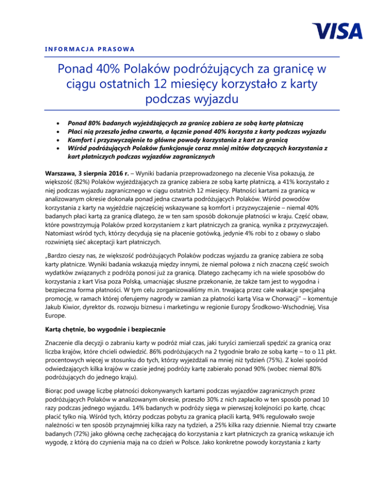 INFORMACJA PRASOWA Ponad 40% Polaków podróżujących za granicę w ciągu ostatnich 12 miesięcy korzystało z karty podczas wyjazdu Ponad 80% badanych wyjeżdżających za granicę zabiera ze sobą kartę płatniczą Płaci nią przeszło jedna czwarta, a łącznie ponad 40% korzysta z karty podczas wyjazdu Komfort i przyzwyczajenie to główne powody korzystania z kart za granicą Wśród podróżujących Polaków funkcjonuje coraz mniej mitów dotyczących korzystania z kart płatniczych podczas wyjazdów zagranicznych Warszawa, 3 sierpnia 2016 r. – Wyniki badania przeprowadzonego na zlecenie Visa pokazują, że większość (82%) Polaków wyjeżdżających za granicę zabiera ze sobą kartę płatniczą, a 41% korzystało z niej podczas wyjazdu zagranicznego w ciągu ostatnich 12 miesięcy. Płatności kartami za granicą w analizowanym okresie dokonała ponad jedna czwarta podróżujących Polaków. Wśród powodów korzystania z karty na wyjeździe najczęściej wskazywane są komfort i przyzwyczajenie – niemal 40% badanych płaci kartą za granicą dlatego, że w ten sam sposób dokonuje płatności w kraju. Część obaw, które powstrzymują Polaków przed korzystaniem z kart płatniczych za granicą, wynika z przyzwyczajeń. Natomiast wśród tych, którzy decydują się na płacenie gotówką, jedynie 4% robi to z obawy o słabo rozwiniętą sieć akceptacji kart płatniczych. „Bardzo cieszy nas, że większość podróżujących Polaków podczas wyjazdu za granicę zabiera ze sobą karty płatnicze. Wyniki badania wskazują między innymi, że niemal połowa z nich znaczną część swoich wydatków związanych z podróżą ponosi już za granicą. Dlatego zachęcamy ich na wiele sposobów do korzystania z kart Visa poza Polską, umacniając słuszne przekonanie, że także tam jest to wygodna i bezpieczna forma płatności. W tym celu zorganizowaliśmy m.in. trwającą przez całe wakacje specjalną promocję, w ramach której oferujemy nagrody w zamian za płatności kartą Visa w Chorwacji” – komentuje Jakub Kiwior, dyrektor ds. rozwoju biznesu i marketingu w regionie Europy Środkowo-Wschodniej, Visa Europe. Kartą chętnie, bo wygodnie i bezpiecznie Znaczenie dla decyzji o zabraniu karty w podróż miał czas, jaki turyści zamierzali spędzić za granicą oraz liczba krajów, które chcieli odwiedzić. 86% podróżujących na 2 tygodnie brało ze sobą kartę – to o 11 pkt. procentowych więcej w stosunku do tych, którzy wyjeżdżali na mniej niż tydzień (75%). Z kolei spośród odwiedzających kilka krajów w czasie jednej podróży kartę zabierało ponad 90% (wobec niemal 80% podróżujących do jednego kraju). Biorąc pod uwagę liczbę płatności dokonywanych kartami podczas wyjazdów zagranicznych przez podróżujących Polaków w analizowanym okresie, przeszło 30% z nich zapłaciło w ten sposób ponad 10 razy podczas jednego wyjazdu. 14% badanych w podróży sięga w pierwszej kolejności po kartę, chcąc płacić tylko nią. Wśród tych, którzy podczas pobytu za granicą płacili kartą, 94% regulowało swoje należności w ten sposób przynajmniej kilka razy na tydzień, a 25% kilka razy dziennie. Niemal trzy czwarte badanych (72%) jako główną cechę zachęcającą do korzystania z kart płatniczych za granicą wskazuje ich wygodę, z którą do czynienia mają na co dzień w Polsce. Jako konkretne powody korzystania z karty podczas wyjazdu najczęściej wskazywano komfort takich płatności (55%) oraz przyzwyczajenie do nich (37%). „Wyniki badania pokazują, że także podczas płacenia za granicą Polacy doceniają zalety kart dobrze znane im z dokonywania płatności bezgotówkowych w kraju. Obok wygody tej metody znaczenie ma również bezpieczeństwo. Na podstawie wyników badania możemy ocenić, że ci, którzy coraz rzadziej korzystają za granicą z gotówki, po prostu wyżej cenią wygodę i bezpieczeństwo płacenia kartami. Utraconą podczas wyjazdu zagranicznego kartę można i należy zastrzec. Wtedy nasze środki będą bezpieczne, czego nie zapewni nam gotówka, którą tracimy bezpowrotnie. Dowolną kartę Visa można szybko i wygodnie zastrzec, korzystając z numeru telefonu dostępnego z poziomu aplikacji podróżnej Visa Travel Tools” – dodaje Jakub Kiwior. Po zastrzeżeniu karty cała odpowiedzialność za ewentualne transakcje nieuprawnione spoczywa na banku-wydawcy karty. Wiele banków pełną ochroną obejmuje, bezpłatnie lub za niewielką opłatą, także transakcje dokonane kartą 24, 48 a nawet 72 godziny przed zgłoszeniem jej utraty. Znikają mity Do niedawna wśród konsumentów żywe były obawy o powszechność akceptacji kart czy ich bezpieczeństwo. Obecnie osoby, które decydują się płacić za granicą gotówką, kierują się przede wszystkim przyzwyczajeniem oraz tym, że czują się pewniej mając ją przy sobie. Jedynie niewielka grupa badanych jako główny powód płacenia za granicą gotówką wskazała obawy o brak akceptacji karty (4%) czy postrzeganie karty jako niebezpiecznej formy płatności (również 4%). Patrząc na wykorzystanie kart do wypłat gotówki podczas zagranicznych podróży, istotnym elementem odstraszającym od skorzystania z takiego rozwiązania jest niechęć konsumentów do szukania bankomatów (16%) czy obawy o trudności w ich obsłudze, np. z uwagi na obcy język (15%). „Przed rozpoczęciem tegorocznych wakacji została udostępniona polska wersja językowa stworzonej przez Visa aplikacji dla podróżnych Visa Travel Tools, za pomocą której – w razie potrzeby skorzystania z gotówki – można odnaleźć najbliższy bankomat. Aplikacja pomaga również wzmacniać świadomość konsumentów dotyczącą globalnej sieci akceptacji kart Visa, którymi można płacić w około 40 mln punktów handlowo-usługowych na całym świecie” – dodaje Jakub Kiwior, Visa Europe. Aplikacja mobilna Visa Travel Tools zapewnia dostęp m.in. do kalkulatora walutowego,