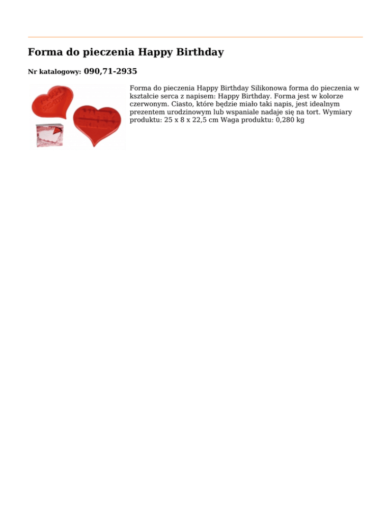 Forma do pieczenia Happy Birthday Nr katalogowy: 090,71-2935 Forma do pieczenia Happy Birthday Silikonowa forma do pieczenia w kształcie serca z napisem: Happy Birthday. Forma jest w kolorze czerwonym. Ciasto, które będzie miało taki napis, jest idealnym prezentem urodzinowym lub wspaniale nadaje się na tort. Wymiary produktu: 25 x 8 x 22,5 cm Waga produktu: 0,280 kg