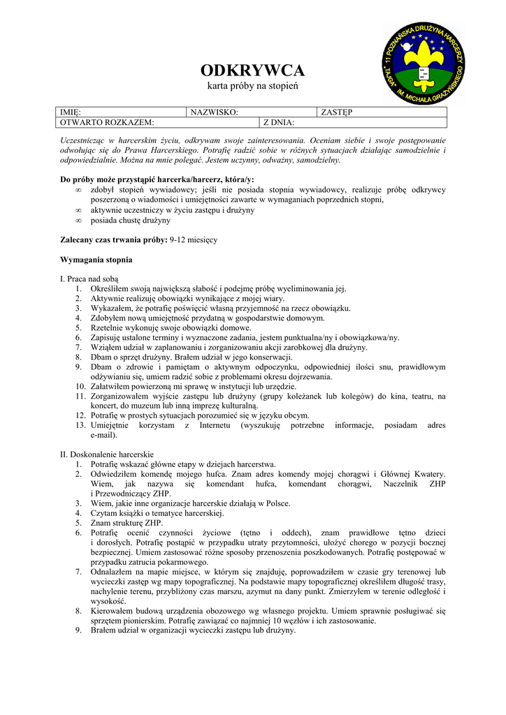 ODKRYWCA karta próby na stopień IMIĘ: OTWARTO ROZKAZEM: NAZWISKO: ZASTĘP Z DNIA: Uczestnicząc w harcerskim Ŝyciu, odkrywam swoje zainteresowania. Oceniam siebie i swoje postępowanie odwołując się do Prawa Harcerskiego. Potrafię radzić sobie w róŜnych sytuacjach działając samodzielnie i odpowiedzialnie. MoŜna na mnie polegać. Jestem uczynny, odwaŜny, samodzielny. Do próby moŜe przystąpić harcerka/harcerz, która/y: • zdobył stopień wywiadowcy; jeśli nie posiada stopnia wywiadowcy, realizuje próbę odkrywcy poszerzoną o wiadomości i umiejętności zawarte w wymaganiach poprzednich stopni, • aktywnie uczestniczy w Ŝyciu zastępu i druŜyny • posiada chustę druŜyny Zalecany czas trwania próby: 9-12 miesięcy Wymagania stopnia I. Praca nad sobą 1. Określiłem swoją największą słabość i podejmę próbę wyeliminowania jej. 2. Aktywnie realizuję obowiązki wynikające z mojej wiary. 3. Wykazałem, Ŝe potrafię poświęcić własną przyjemność na rzecz obowiązku. 4. Zdobyłem nową umiejętność przydatną w gospodarstwie domowym. 5. Rzetelnie wykonuję swoje obowiązki domowe. 6. Zapisuję ustalone terminy i wyznaczone zadania, jestem punktualna/ny i obowiązkowa/ny. 7. Wziąłem udział w zaplanowaniu i zorganizowaniu akcji zarobkowej dla druŜyny. 8. Dbam o sprzęt druŜyny. Brałem udział w jego konserwacji. 9. Dbam o zdrowie i pamiętam o aktywnym odpoczynku, odpowiedniej ilości snu, prawidłowym odŜywianiu się, umiem radzić sobie z problemami okresu dojrzewania. 10. Załatwiłem powierzoną mi sprawę w instytucji lub urzędzie. 11. Zorganizowałem wyjście zastępu lub druŜyny (grupy koleŜanek lub kolegów) do kina, teatru, na koncert, do muzeum lub inną imprezę kulturalną. 12. Potrafię w prostych sytuacjach porozumieć się w języku obcym. 13. Umiejętnie korzystam z Internetu (wyszukuję potrzebne informacje, posiadam adres e-mail). II. Doskonalenie harcerskie 1. Potrafię wskazać główne etapy w dziejach harcerstwa. 2. Odwiedziłem komendę mojego hufca. Znam adres komendy mojej chorągwi i Głównej Kwatery. Wiem, jak nazywa się komendant hufca, komendant chorągwi, Naczelnik ZHP i Przewodniczący ZHP. 3. Wiem, jakie inne organizacje harcerskie działają w Polsce. 4. Czytam ksiąŜki o tematyce harcerskiej. 5. Znam strukturę ZHP. 6. Potrafię ocenić czynności Ŝyciowe (tętno i oddech), znam prawidłowe tętno dzieci i dorosłych. Potrafię postąpić w przypadku utraty przytomności, ułoŜyć chorego w pozycji bocznej bezpiecznej. Umiem zastosować róŜne sposoby przenoszenia poszkodowanych. Potrafię postępować w przypadku zatrucia pokarmowego. 7. Odnalazłem na mapie miejsce, w którym się znajduję, poprowadziłem w czasie gry terenowej lub wycieczki zastęp wg mapy topograficznej. Na podstawie mapy topograficznej określiłem długość trasy, nachylenie terenu, przybliŜony czas marszu, azymut na dany punkt. Zmierzyłem w terenie odległość i wysokość. 8. Kierowałem budową urządzenia obozowego wg własnego projektu. Umiem sprawnie posługiwać się sprzętem pionierskim. Potrafię zawiązać co najmniej 10 węzłów i ich zastosowanie. 9. Brałem udział w organizacji wycieczki zastępu lub druŜyny. 10. Wyrobiłem w sobie poŜyteczne nawyki ekologiczne (oszczędzam wodę, gaszę światło, segreguję odpady). 11. Wiem, co to jest park narodowy, park krajobrazowy i rezerwat przyrody. Wymienię kilka polskich parków narodowych oraz wskaŜę występujące w nich osobliwości przyrodnicze. Odwiedziłam/em jeden z parków narodowych, krajobrazowych lub rezerwatów. III. Poszukiwanie pól słuŜby 1. Poznaję historię swojej miejscowości. Wiem, co wyróŜnia ją spośród innych (np. znane postacie, historyczne wydarzenia, zabytki, sztuka ludowa). 2. Wiem, na czym polega demokracja. Brałem udział w demokratycznym podejmowaniu decyzji. IV. Aktywność W okresie próby uczestniczyłem w obozie lub zimowisku harcerskim oraz w co najmniej dwóch biwakach lub rajdach, zrealizowałem co najmniej trzy projekty, w tym przynajmniej jeden na rzecz środowiska (np. szkoły, osiedla). Zdobyłem w tym czasie przynajmniej trzy sprawności (dwugwiazdkowe lub trzygwiazdkowe). REALIZACJA: ZAMKNIĘTO ROZKAZEM: KIEDY: Z DNIA: