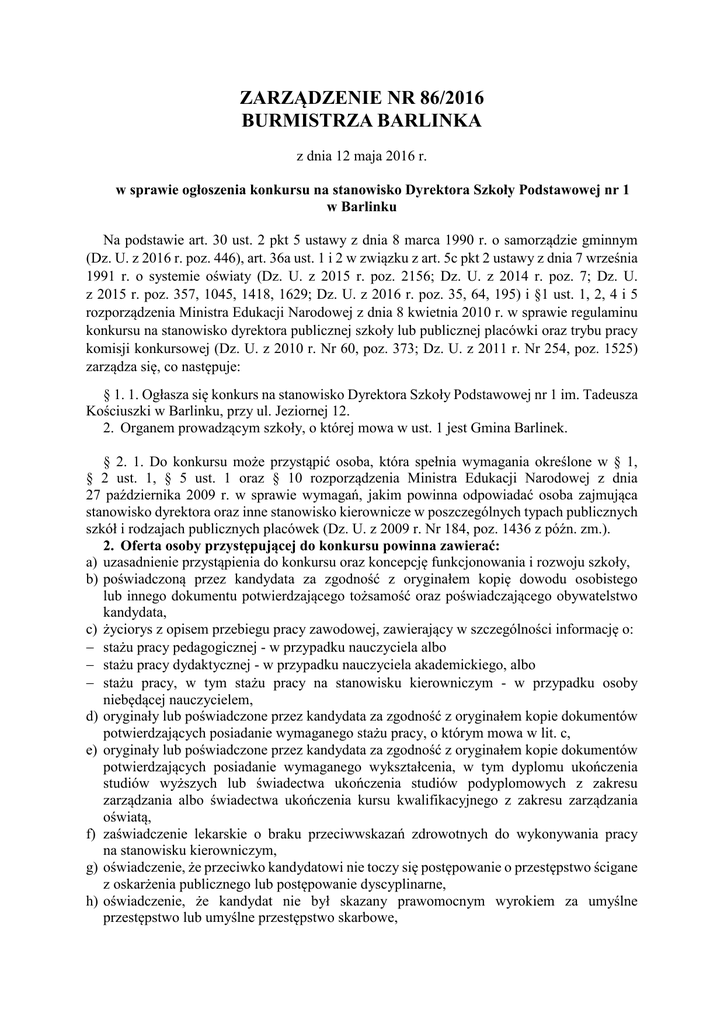 ZARZĄDZENIE NR 86/2016 BURMISTRZA BARLINKA z dnia 12 maja 2016 r. w sprawie ogłoszenia konkursu na stanowisko Dyrektora Szkoły Podstawowej nr 1 w Barlinku Na podstawie art. 30 ust. 2 pkt 5 ustawy z dnia 8 marca 1990 r. o samorządzie gminnym (Dz. U. z 2016 r. poz. 446), art. 36a ust. 1 i 2 w związku z art. 5c pkt 2 ustawy z dnia 7 września 1991 r. o systemie oświaty (Dz. U. z 2015 r. poz. 2156; Dz. U. z 2014 r. poz. 7; Dz. U. z 2015 r. poz. 357, 1045, 1418, 1629; Dz. U. z 2016 r. poz. 35, 64, 195) i §1 ust. 1, 2, 4 i 5 rozporządzenia Ministra Edukacji Narodowej z dnia 8 kwietnia 2010 r. w sprawie regulaminu konkursu na stanowisko dyrektora publicznej szkoły lub publicznej placówki oraz trybu pracy komisji konkursowej (Dz. U. z 2010 r. Nr 60, poz. 373; Dz. U. z 2011 r. Nr 254, poz. 1525) zarządza się, co następuje: § 1. 1. Ogłasza się konkurs na stanowisko Dyrektora Szkoły Podstawowej nr 1 im. Tadeusza Kościuszki w Barlinku, przy ul. Jeziornej 12. 2. Organem prowadzącym szkoły, o której mowa w ust. 1 jest Gmina Barlinek. § 2. 1. Do konkursu może przystąpić osoba, która spełnia wymagania określone w § 1, § 2 ust. 1, § 5 ust. 1 oraz § 10 rozporządzenia Ministra Edukacji Narodowej z dnia 27 października 2009 r. w sprawie wymagań, jakim powinna odpowiadać osoba zajmująca stanowisko dyrektora oraz inne stanowisko kierownicze w poszczególnych typach publicznych szkół i rodzajach publicznych placówek (Dz. U. z 2009 r. Nr 184, poz. 1436 z późn. zm.). 2. Oferta osoby przystępującej do konkursu powinna zawierać: a) uzasadnienie przystąpienia do konkursu oraz koncepcję funkcjonowania i rozwoju szkoły, b) poświadczoną przez kandydata za zgodność z oryginałem kopię dowodu osobistego lub innego dokumentu potwierdzającego tożsamość oraz poświadczającego obywatelstwo kandydata, c) życiorys z opisem przebiegu pracy zawodowej, zawierający w szczególności informację o: − stażu pracy pedagogicznej - w przypadku nauczyciela albo − stażu pracy dydaktycznej - w przypadku nauczyciela akademickiego, albo − stażu pracy, w tym stażu pracy na stanowisku kierowniczym - w przypadku osoby niebędącej nauczycielem, d) oryginały lub poświadczone przez kandydata za zgodność z oryginałem kopie dokumentów potwierdzających posiadanie wymaganego stażu pracy, o którym mowa w lit. c, e) oryginały lub poświadczone przez kandydata za zgodność z oryginałem kopie dokumentów potwierdzających posiadanie wymaganego wykształcenia, w tym dyplomu ukończenia studiów wyższych lub świadectwa ukończenia studiów podyplomowych z zakresu zarządzania albo świadectwa ukończenia kursu kwalifikacyjnego z zakresu zarządzania oświatą, f) zaświadczenie lekarskie o braku przeciwwskazań zdrowotnych do wykonywania pracy na stanowisku kierowniczym, g) oświadczenie, że przeciwko kandydatowi nie toczy się postępowanie o przestępstwo ścigane z oskarżenia publicznego lub postępowanie dyscyplinarne, h) oświadczenie, że kandydat nie był skazany prawomocnym wyrokiem za umyślne przestępstwo lub umyślne przestępstwo skarbowe, i) oświadczenie, że kandydat nie był karany zakazem pełnienia funkcji związanych z dysponowaniem środkami publicznymi, o którym mowa w art. 31 ust. 1 pkt 4 ustawy z dnia 17 grudnia 2004 r. o odpowiedzialności za naruszenie dyscypliny finansów publicznych (Dz. U. z 2013 r. poz. 168), j) oświadczenie o dopełnieniu obowiązku, o którym mowa w art. 7 ust. 1 i ust. 3a ustawy z dnia 18 października 2006 r. o ujawnianiu informacji o dokumentach organów bezpieczeństwa państwa z lat 1944-1990 oraz treści tych dokumentów (Dz. U. z 2013 r. poz. 1388 z późn. zm.) - w przypadku kandydata na dyrektora publicznej szkoły, k) oryginał lub poświadczoną przez kandydata za zgodność z oryginałem kopię aktu nadania stopnia nauczyciela mianowanego lub dyplomowanego - w przypadku nauczyciela, l) oryginał lub poświadczoną przez kandydata za zgodność z oryginałem kopię karty oceny pracy lub oceny dorobku zawodowego - w przypadku nauczyciela i nauczyciela akademickiego, m) oświadczenie, że kandydat nie był karany karą dyscyplinarną, o której mowa w art. 76 ust. 1 ustawy z dnia 26 stycznia 1982 r. - Karta Nauczyciela (Dz. U. z 2014 r. poz. 191 z późn. zm.) lub w art. 140 ust. 1 ustawy z dnia 27 lipca 2005 r. - Prawo o szkolnictwie wyższym (Dz. U. z 2012 r. poz. 572 z późn. zm.) - w przypadku nauczyciela i nauczyciela akademickiego, n) oświadczenia, że kandydat ma pełną zdolność do czynności prawnych i korzysta z pełni praw publicznych - w przypadku osoby niebędącej nauczycielem, o) oświadczenie, że kandydat wyraża zgodę na przetwarzanie danych osobowych zgodnie z ustawą z dnia 29 sierpnia 1997 r. o ochronie danych osobowych (Dz. U. z 2015 r. poz. 2135 z późn. zm.) w celu przeprowadzenia konkursu na stanowisko dyrektora. 3. Oferty, w zamkniętych kopertach z podanym na kopercie imieniem i nazwiskiem kandydata, adresem zwrotnym i numerem telefonu oraz dopiskiem „Konkurs na stanowisko Dyrektora Szkoły Podstawowej Nr 1 w Barlinku”, należy składać w Biurze Obsługi Interesanta Urzędu Miejskiego w Barlinku lub przesłać na adres: Urząd Miejski w Barlinku ul. Niepodległości 20 74-320 Barlinek. 4. Termin składania dokumentów upływa 3 czerwca 2016 r. (decyduje data wpływu do Urzędu Miejskiego w Barlinku). 5. Konkurs przeprowadzi komisja konkursowa powołana przez Burmistrza Barlinka. 6. O terminie i miejscu przeprowadzenia postępowania konkursowego kandydaci zostaną poinformowani indywidualnie. § 3. Ogłoszenie o konkursie zamieszczone zostanie na stronie internetowej Gminy Barlinek, na tablicy ogłoszeń Urzędu Miejskiego w Barlinku oraz na stronie internetowej Biuletynu Informacji Publicznej Kuratorium Oświaty w Szczecinie. § 4. Wykonanie zarządzenia powierza się Kierownikowi Referatu Oświaty, Sportu, Kultury i Spraw Społecznych. § 5. Zarządzenie wchodzi w życie z